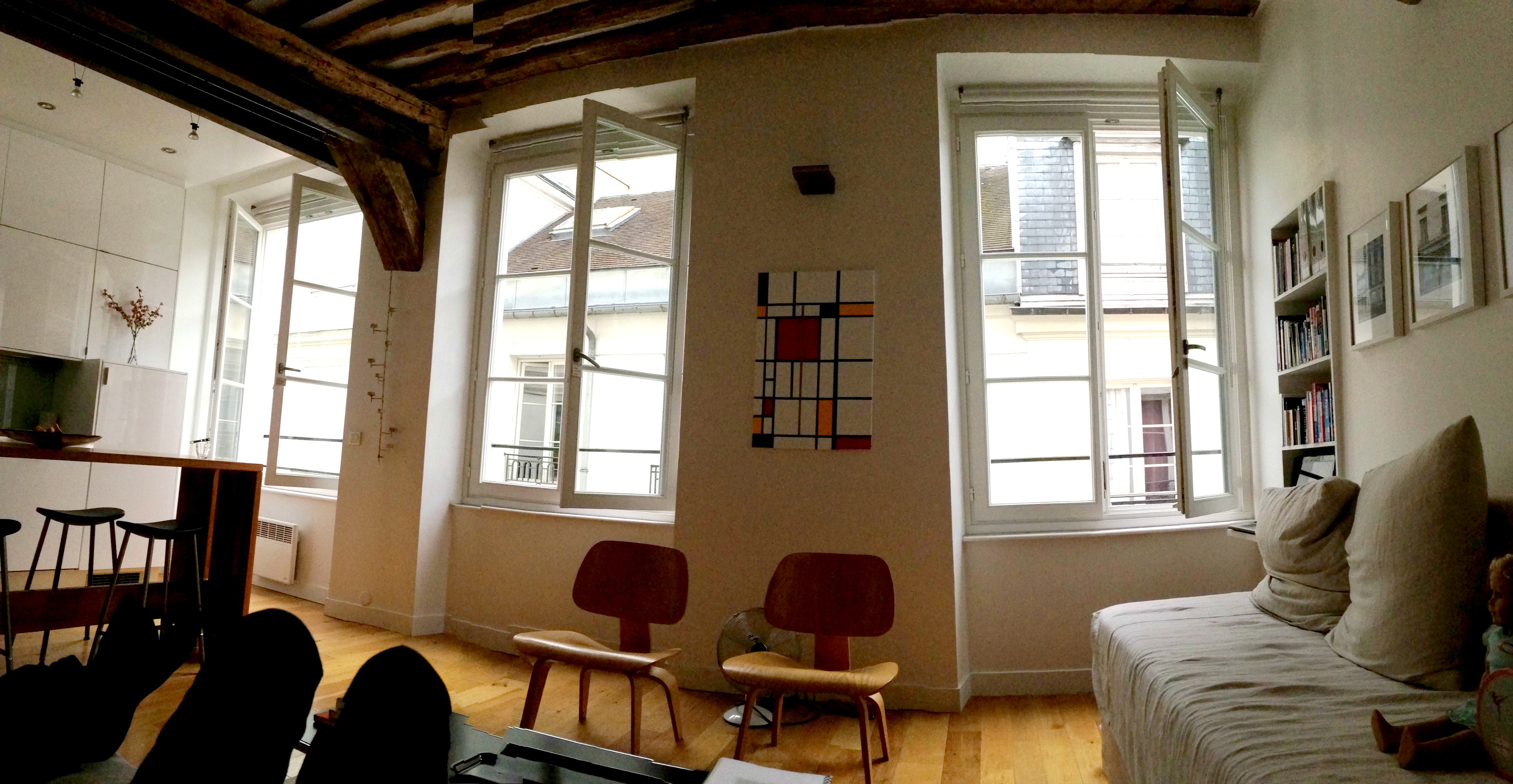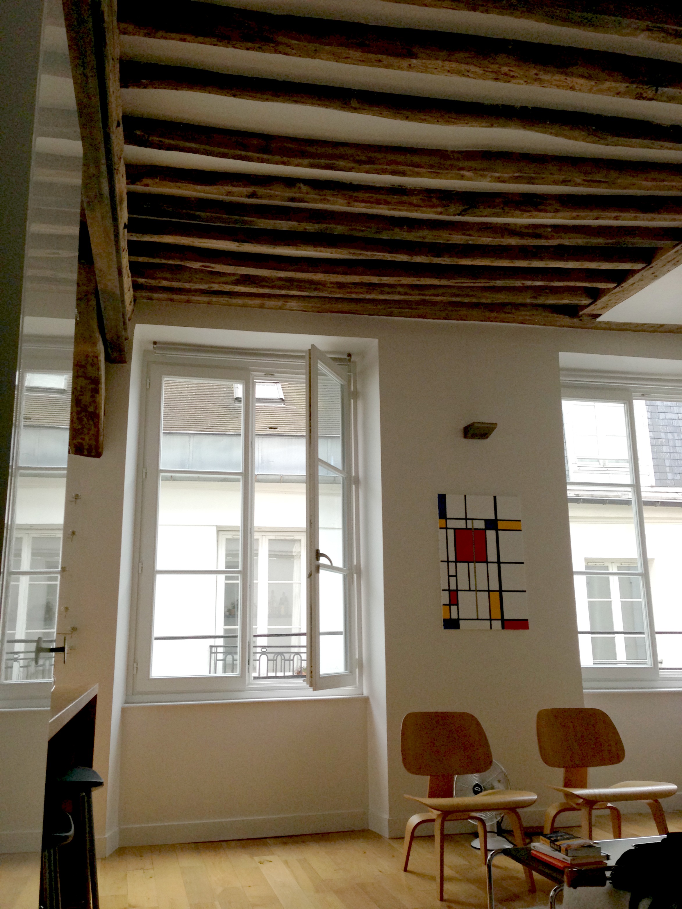 When we arrived in Paris, we had arranged to be picked up at the airport by a chauffeur who drove us straight to our apartment,  and then as we pulled up,  the apt. manager Janet was standing there waiting to show us around.  We were pleasantly surprised at how much we loved the apartment.  It exceeded our expectations.   It’s very open & bright, with big french style windows and high ceilings and old wood beams in the ceiling…and the little street where it’s located is as picture perfect, as we had hoped.