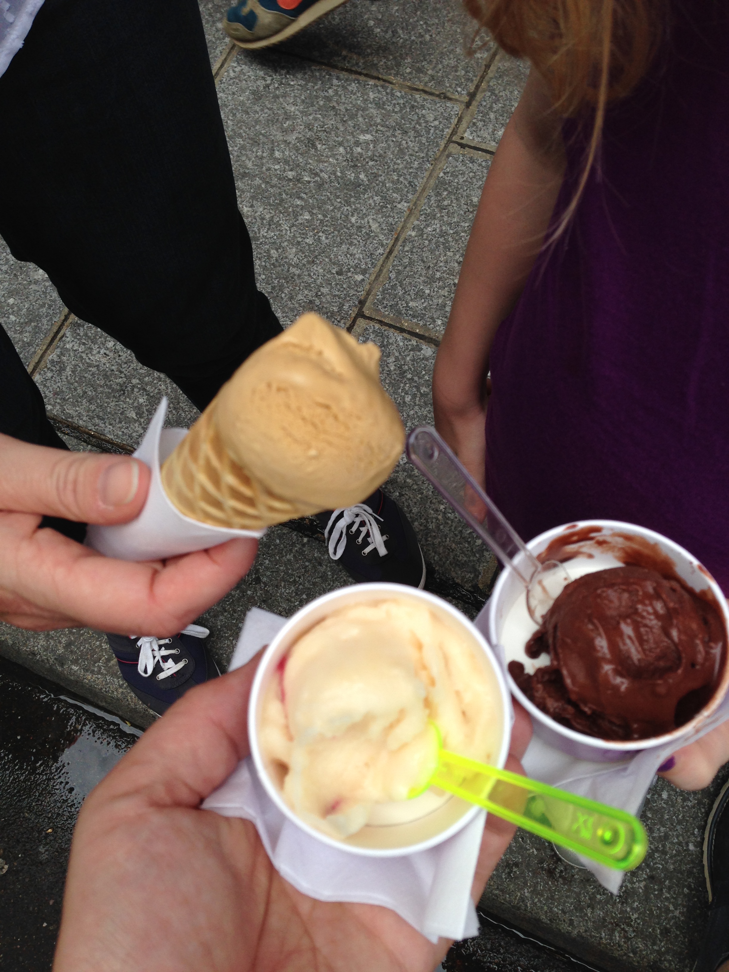 Along the way, we had made our way to the Île Saint-Louis, and we literally walked up on one of the places we had planned to visit…the Maison Berthillon, a very famous ice cream parlor.   It was super delicious and refreshing…and served in a perfect sized portion.  I had peach, Josette had coffee and Lena had dark chocolate (which was the richest ice cream I’ve ever tasted).