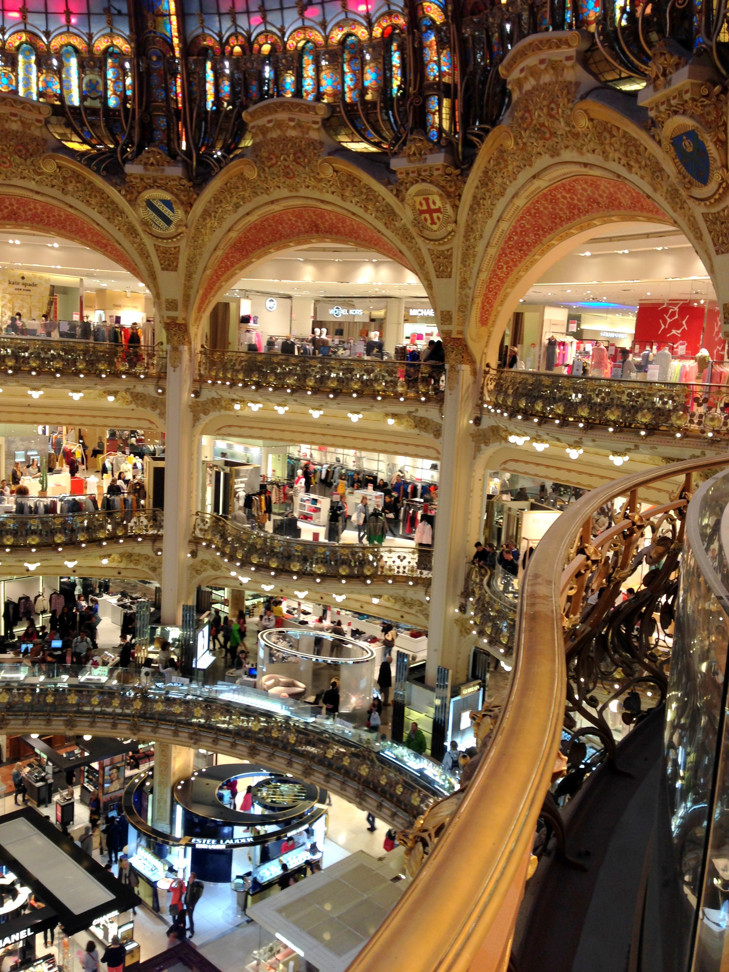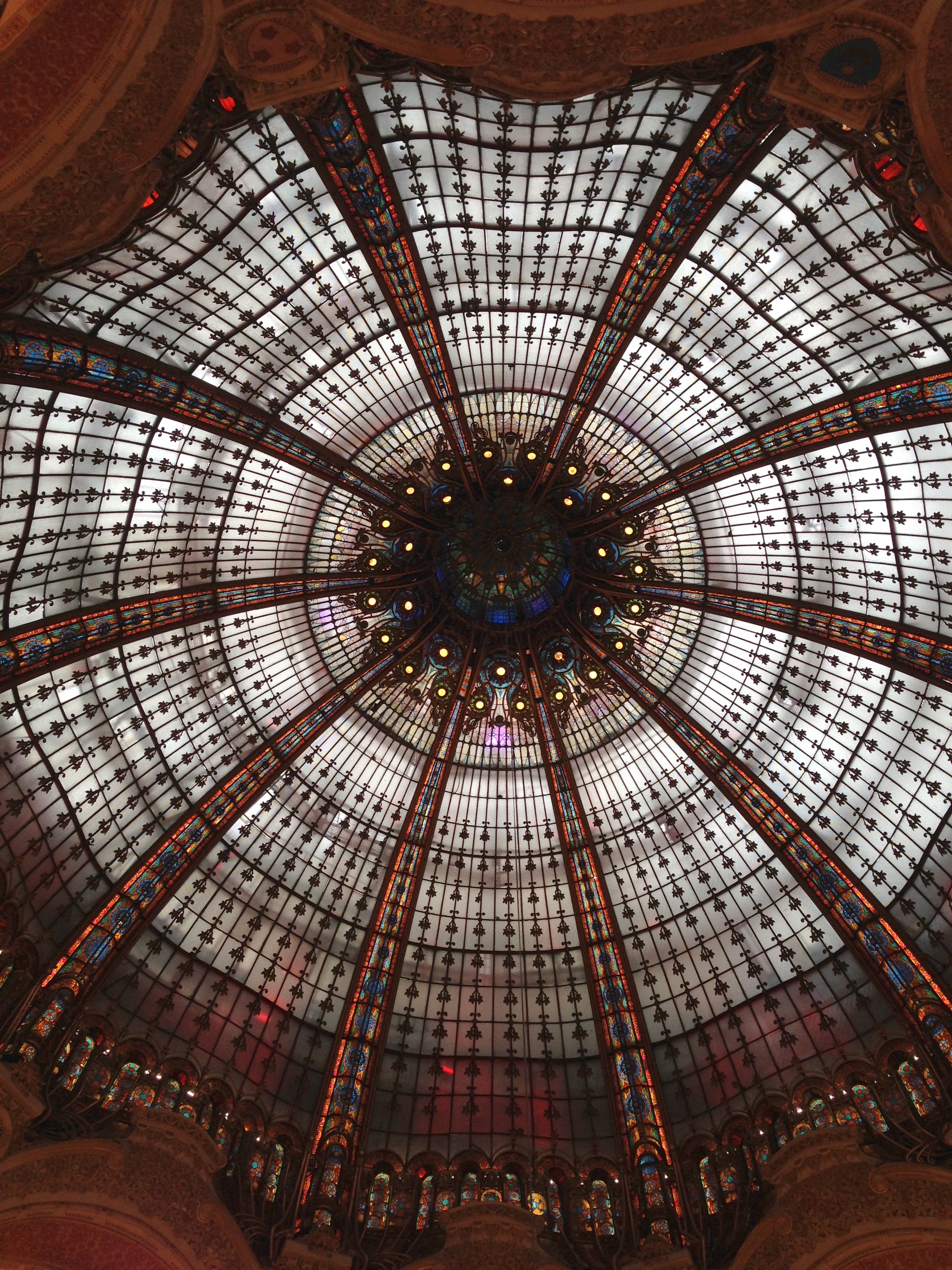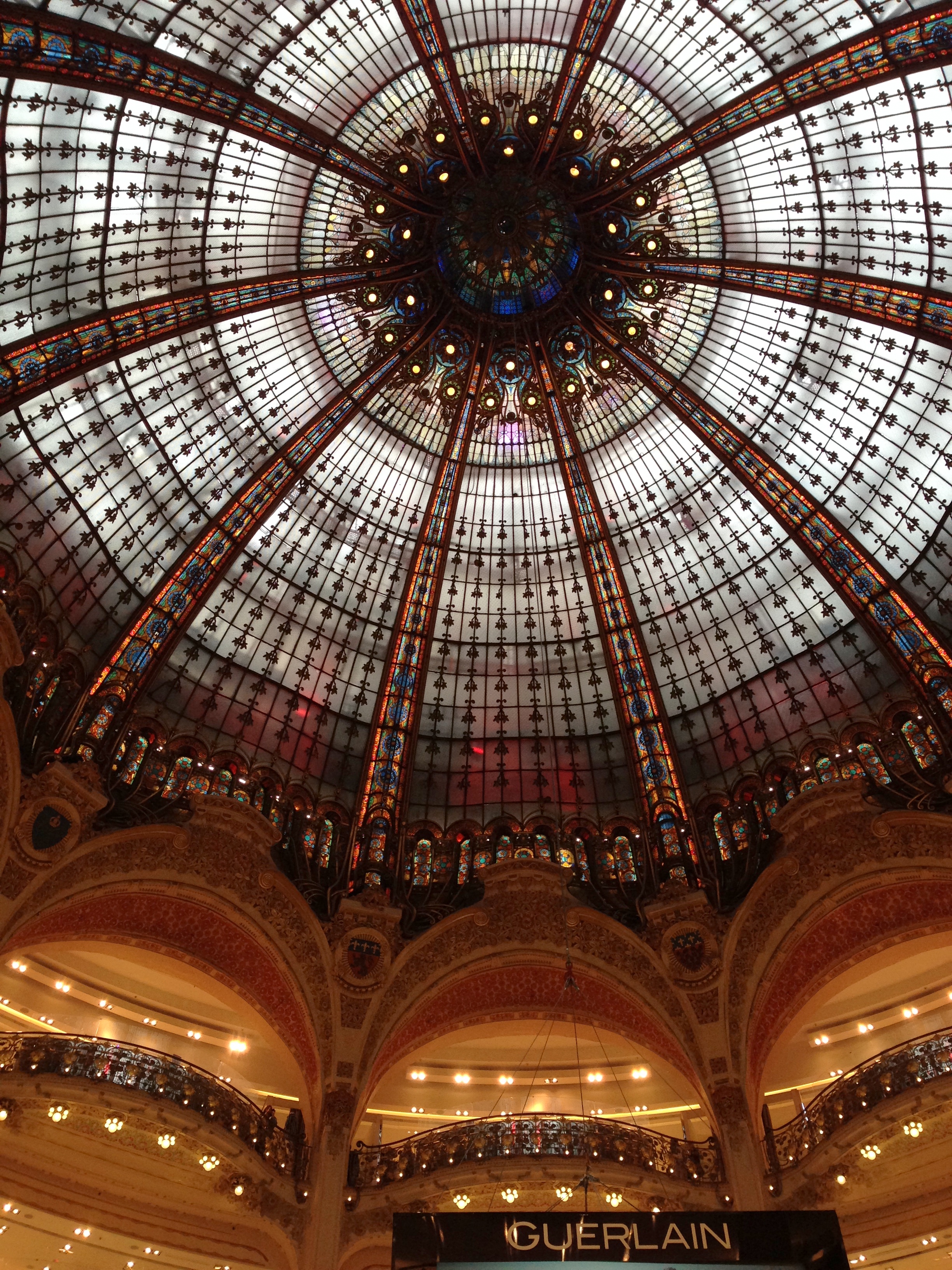And to end the day, we went to the famous Galeries Lafayette department store, right behind the Opera House. It was built in the early 1900’s and has a HUGE round, stained glass dome over the main shopping area, which is in the round as well. We did not do any retail damage here (the Euro is too strong against the US dollar) but we did window shop, and we rested our feet and had a nice cappuccino and a few pastries from the fancy eatery on the top floor. Nice way to end another day in Paris.