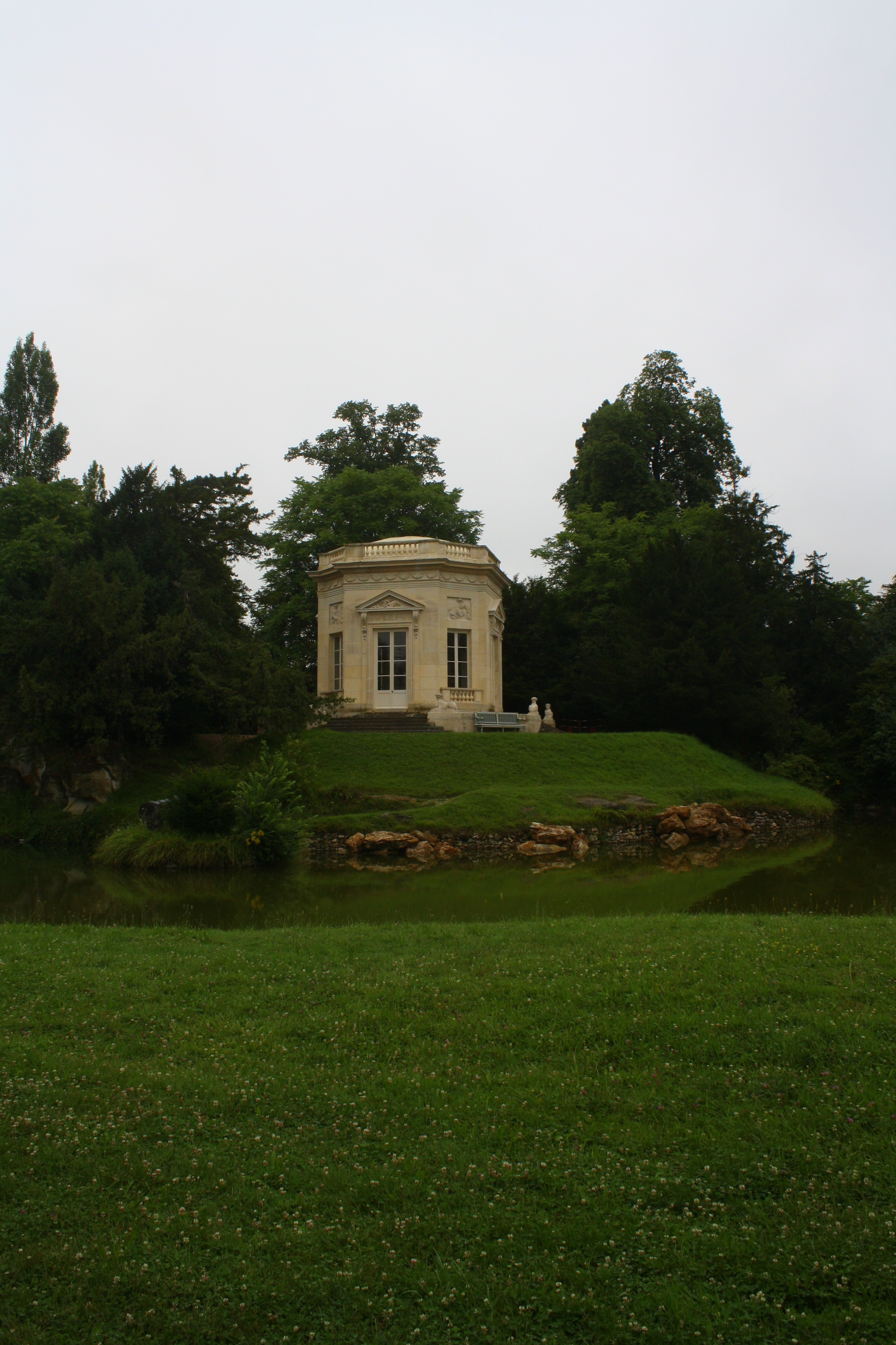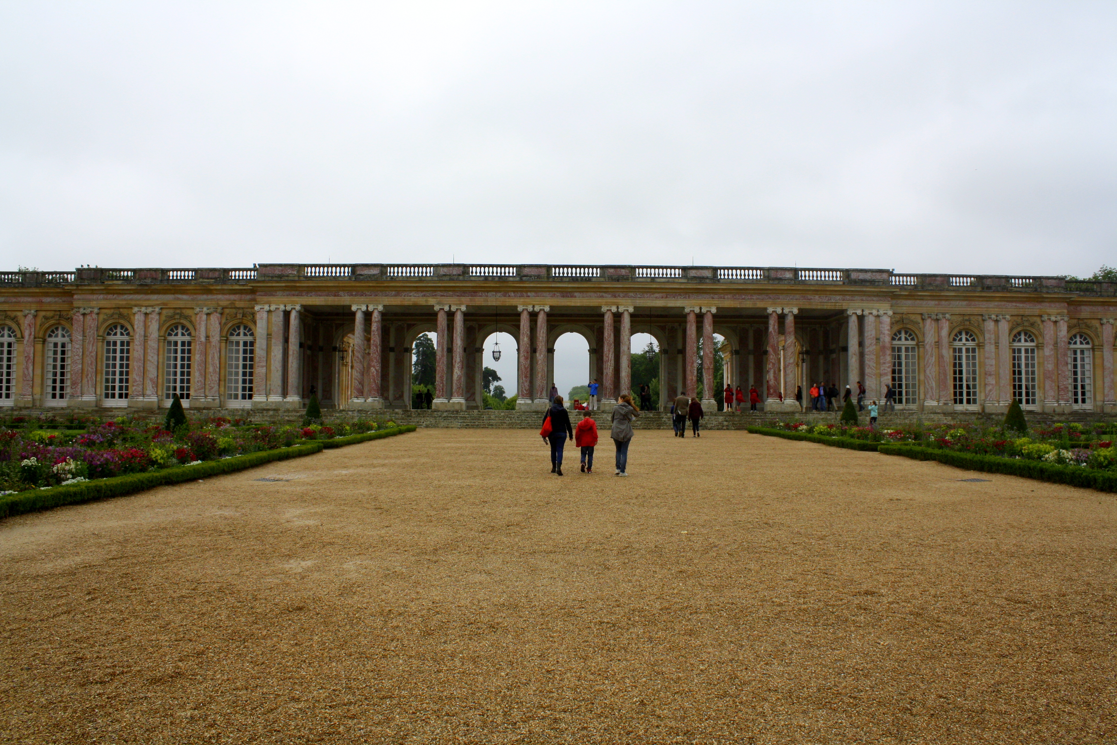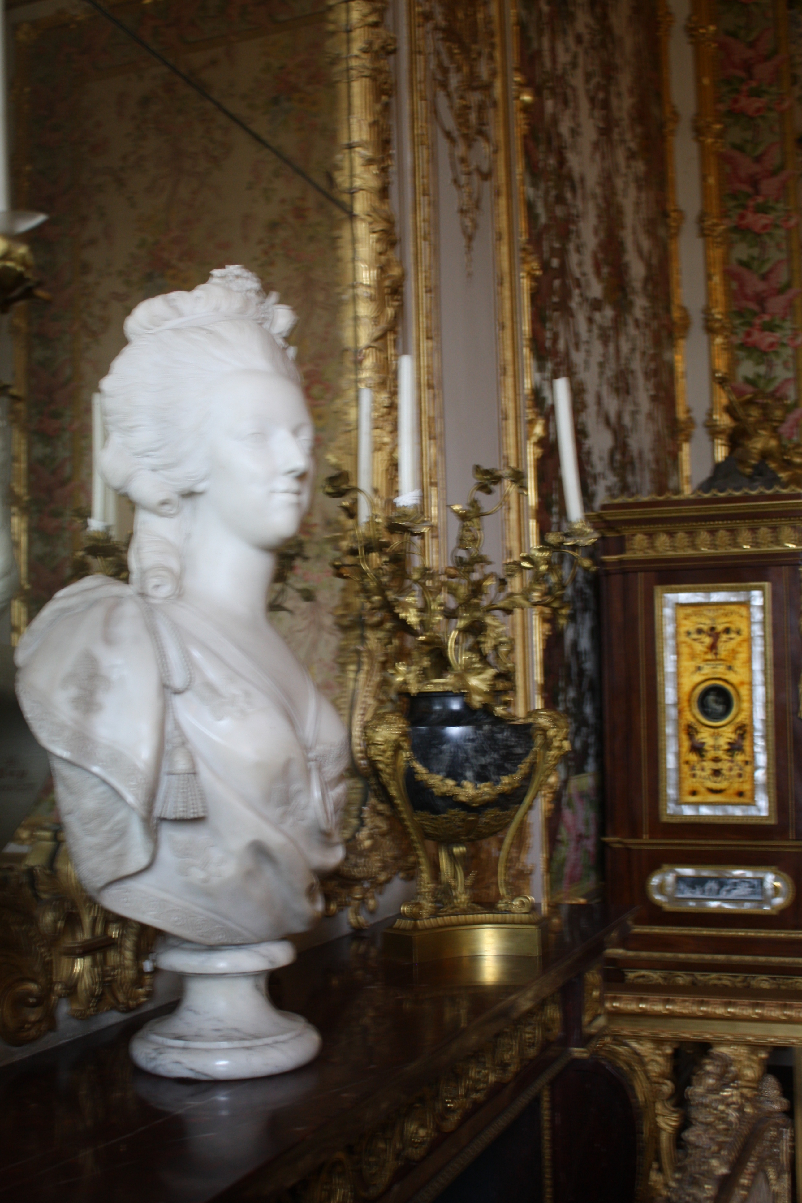 Next up was the smaller “retreat” on the grounds of Versailles…Le Petit Trianon.  It was actually built by Louis XV for his mistress, Madame de Pompadour, but she died before it was complete…so her successor (as mistress) Madame du Barry lived there for a time.  When Louis XVI became King, he gave Le Petit Trianon to 19 year old Marie Antionette, for her own use and enjoyment.  Everyone thinks of Marie Antionette and immediately thinks of the tall wigs, diamonds, huge dresses…”let them eat cake” version of her….but she was actually just a kid when she became Queen.  She was from royalty herself, but nothing compared to the formality and demands of the French Court.  When she was at the Petit Trianon, she could be simple and live care free.  In touring it, It is rather simple in comparison to the rest of Versailles.  She only let her very closest friends come to visit.