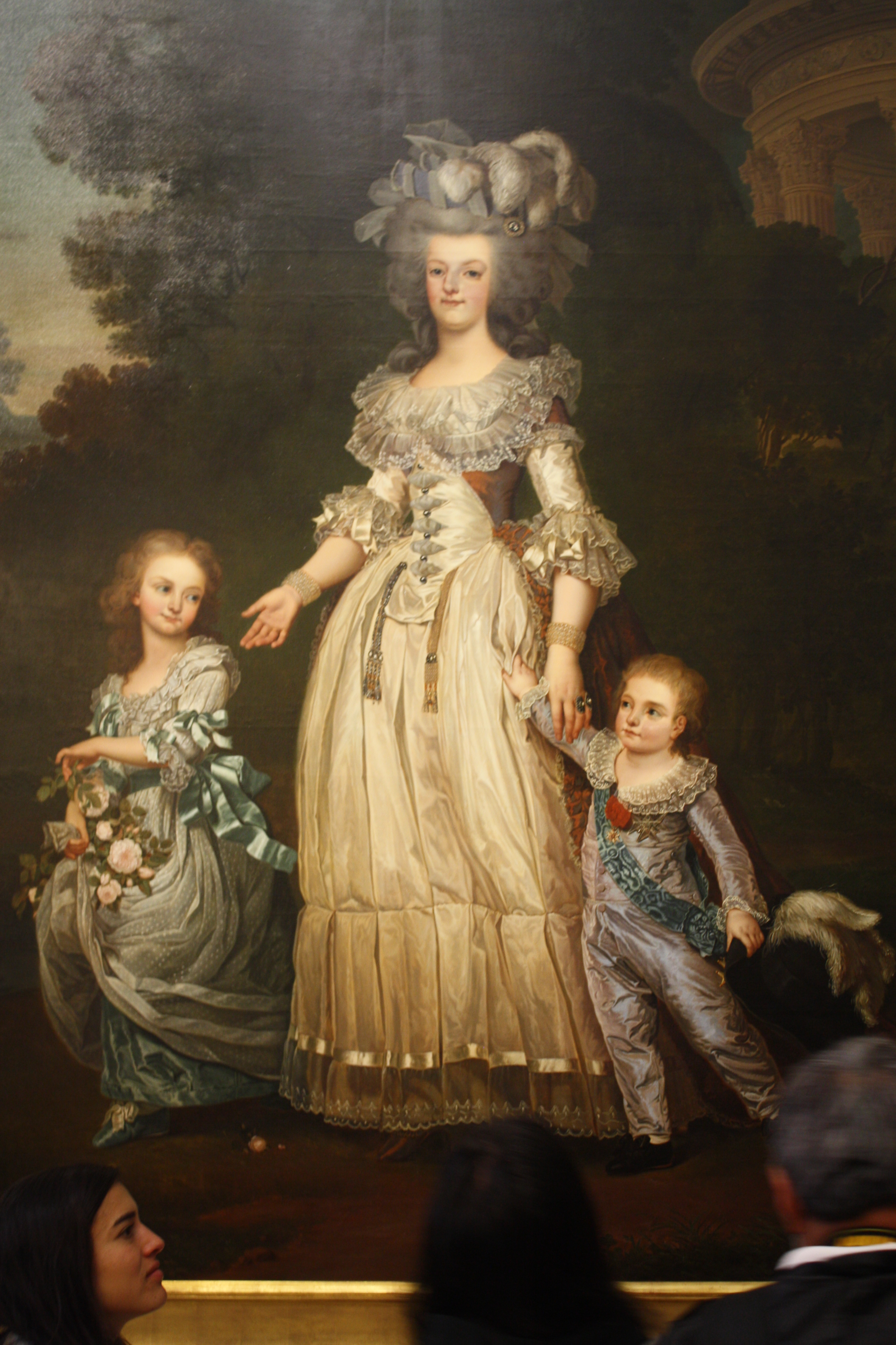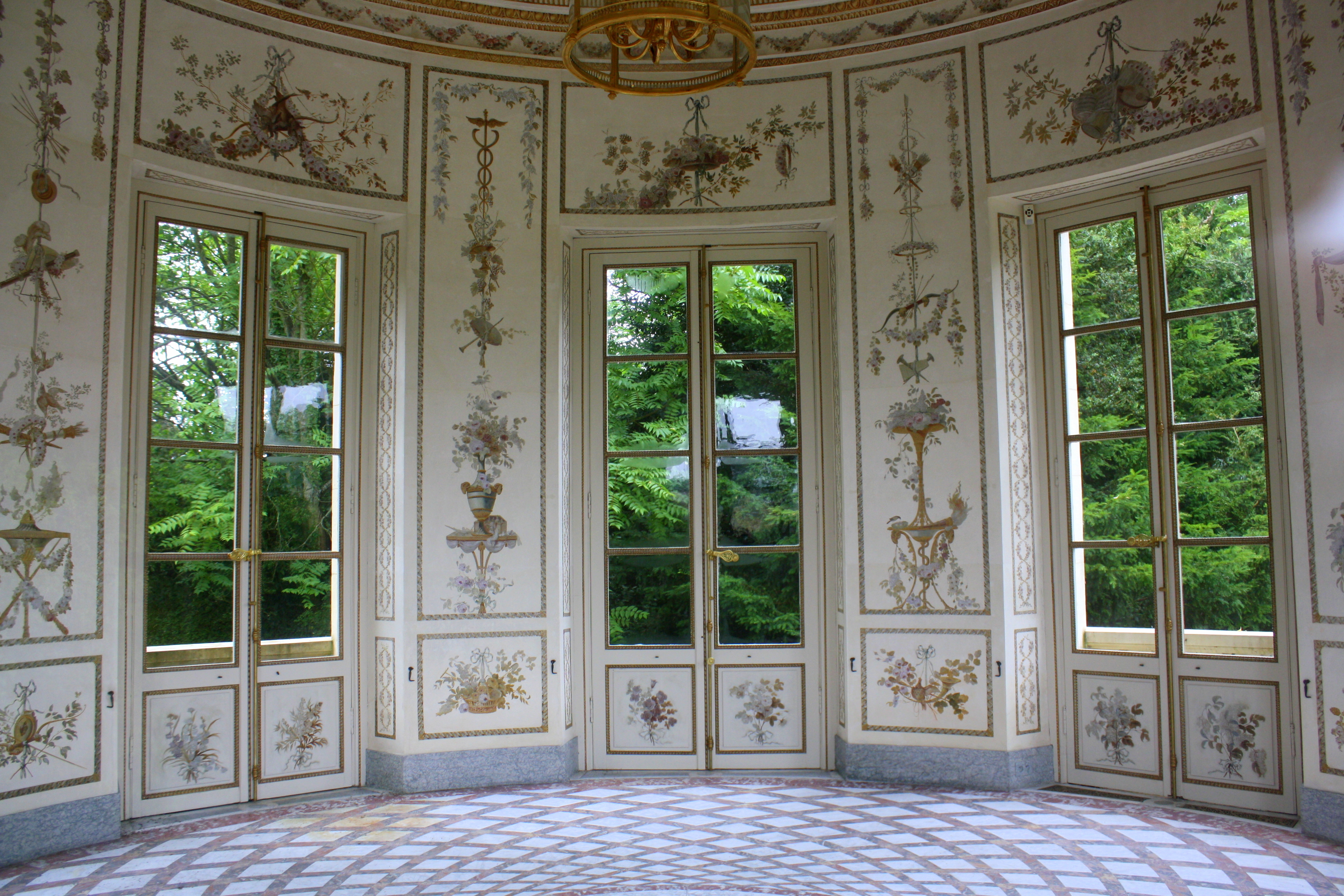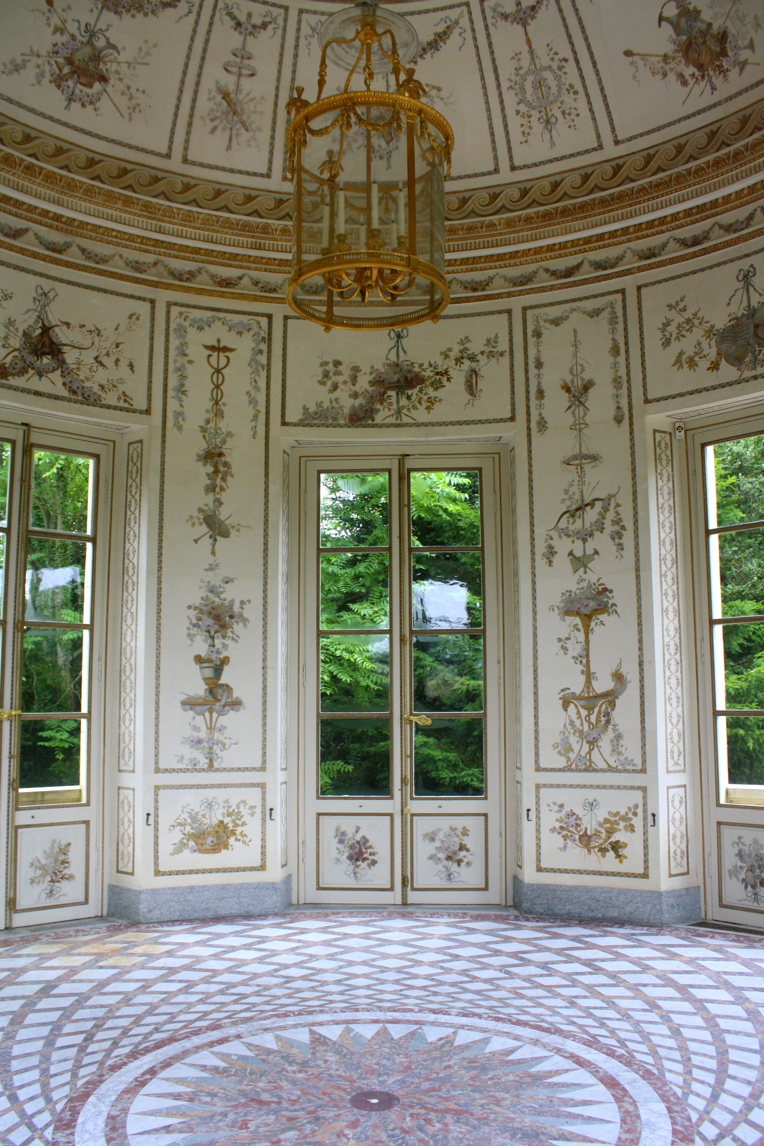 Next up was the smaller “retreat” on the grounds of Versailles…Le Petit Trianon.  It was actually built by Louis XV for his mistress, Madame de Pompadour, but she died before it was complete…so her successor (as mistress) Madame du Barry lived there for a time.  When Louis XVI became King, he gave Le Petit Trianon to 19 year old Marie Antionette, for her own use and enjoyment.  Everyone thinks of Marie Antionette and immediately thinks of the tall wigs, diamonds, huge dresses…”let them eat cake” version of her….but she was actually just a kid when she became Queen.  She was from royalty herself, but nothing compared to the formality and demands of the French Court.  When she was at the Petit Trianon, she could be simple and live care free.  In touring it, It is rather simple in comparison to the rest of Versailles.  She only let her very closest friends come to visit.