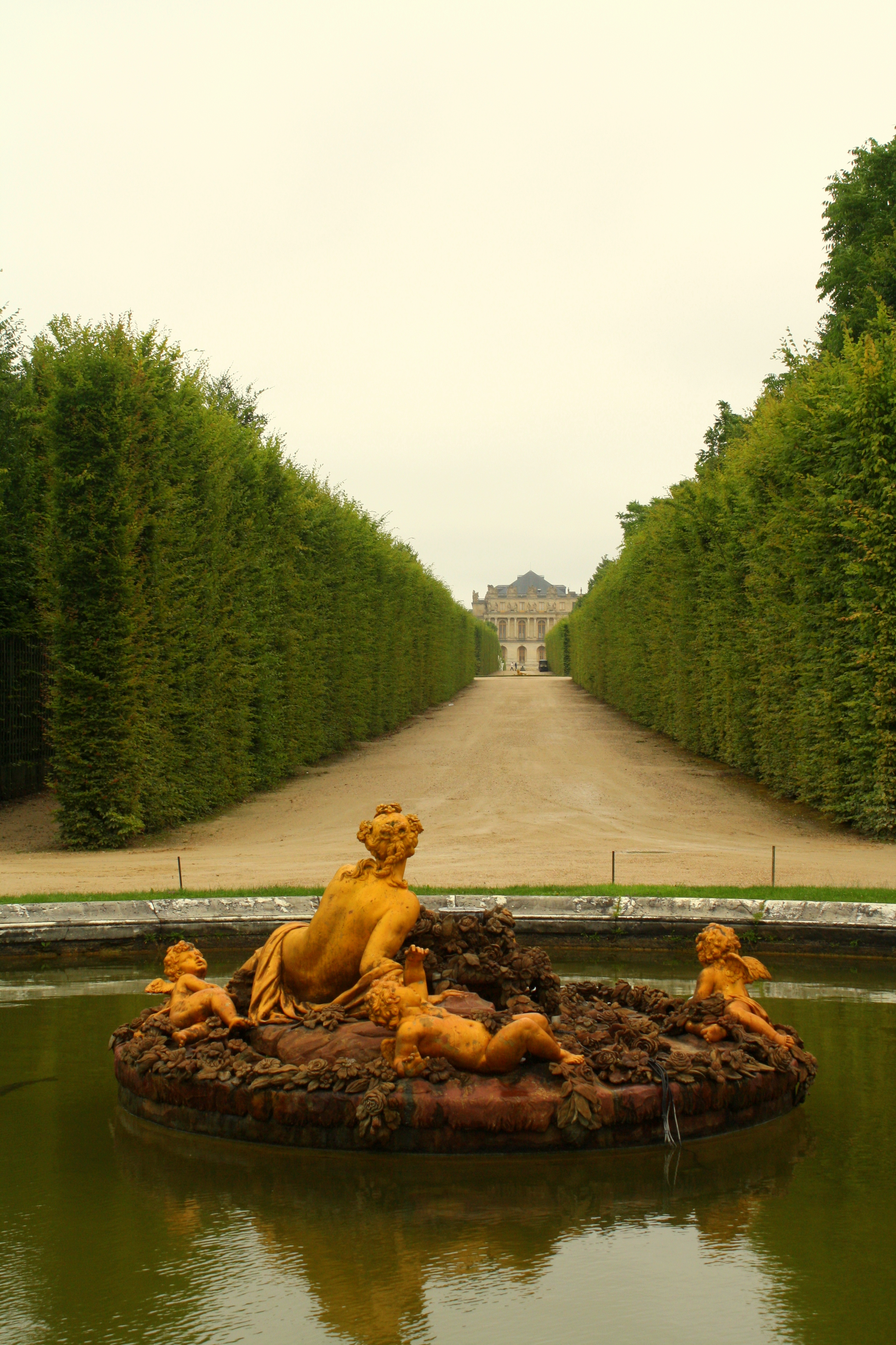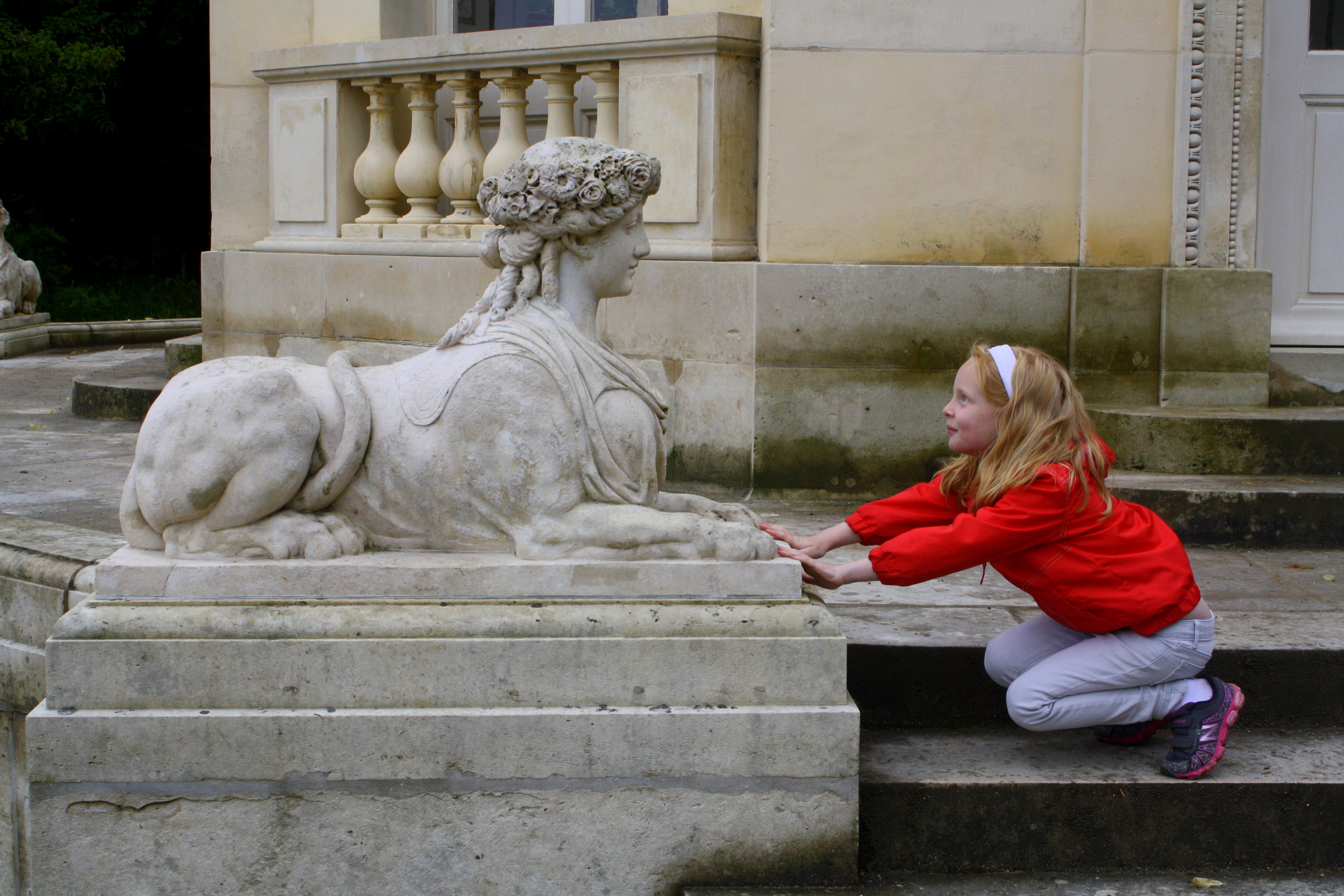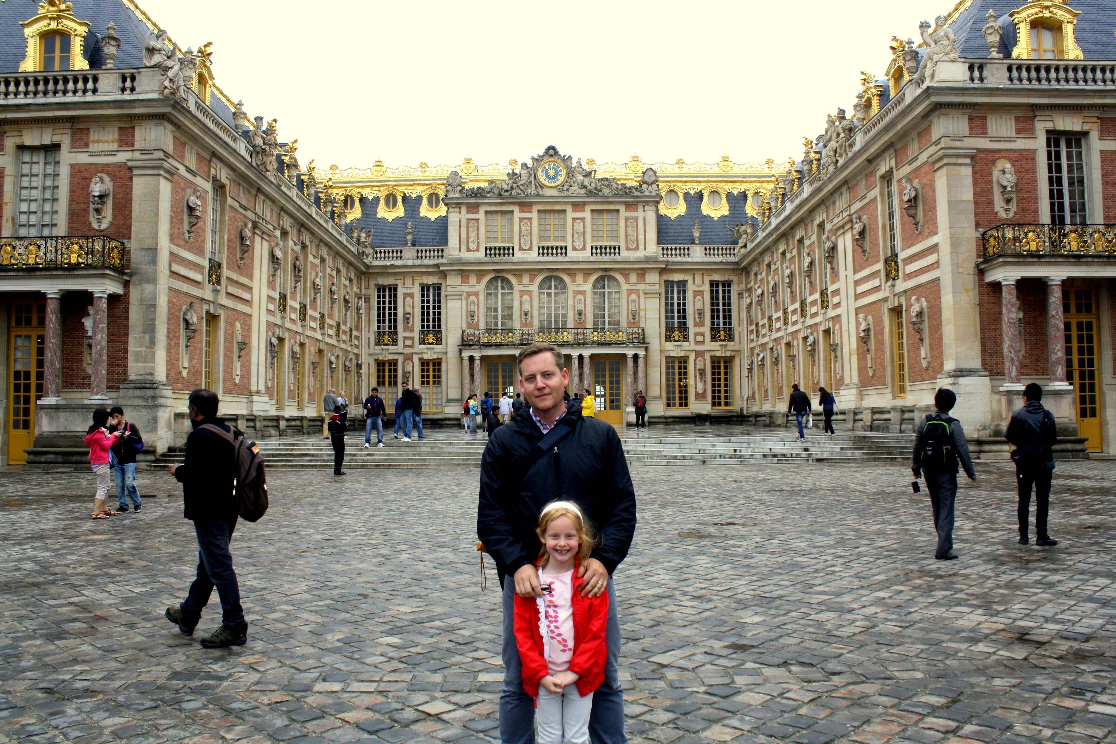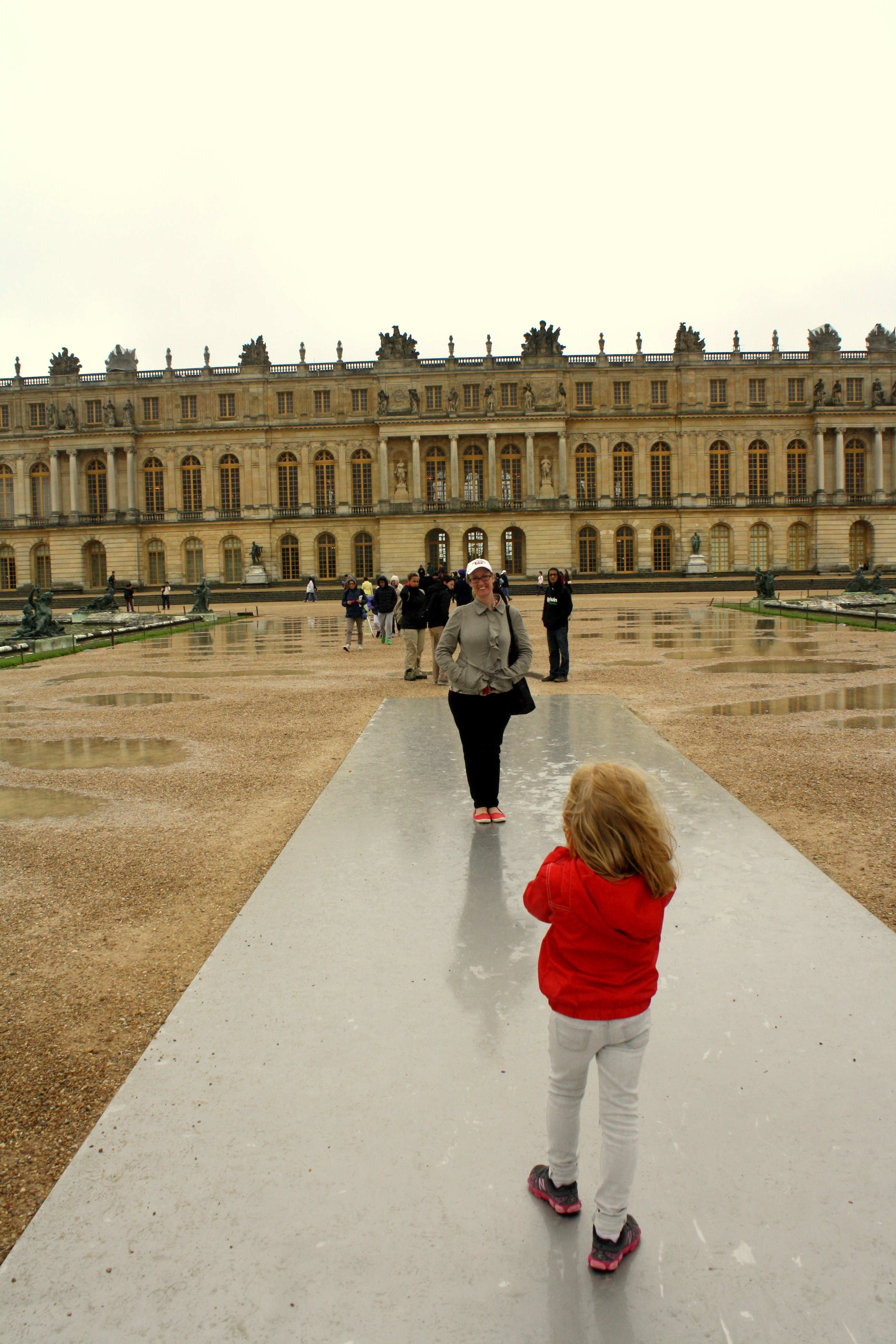 Today was our visit to the Palace of Versailles (the French refer to it as the Chateau du Versailles)…but if you know anything about it, Versailles is much more than just a palace!  The vast gardens as well as all of the other buildings (Grand Trianon and Petit Trianon) make this a massive place to tour on foot.  All told, we walked over 8 miles!   Lena (our 6 year old) is a trooper.  She ran most of those 8 miles.  Even as hardened New Yorkers that walk everywhere we go, I must admit that by days end, our feet were like raw, ravaged pieces of meat.  Not to mention that it was rather muddy and puddle-filled all around the grounds!  Luckily, the rain held off for us all day, but there was a bit of a cloudy, foggy gloom hanging over Versailles, but that did not spoil our visit.