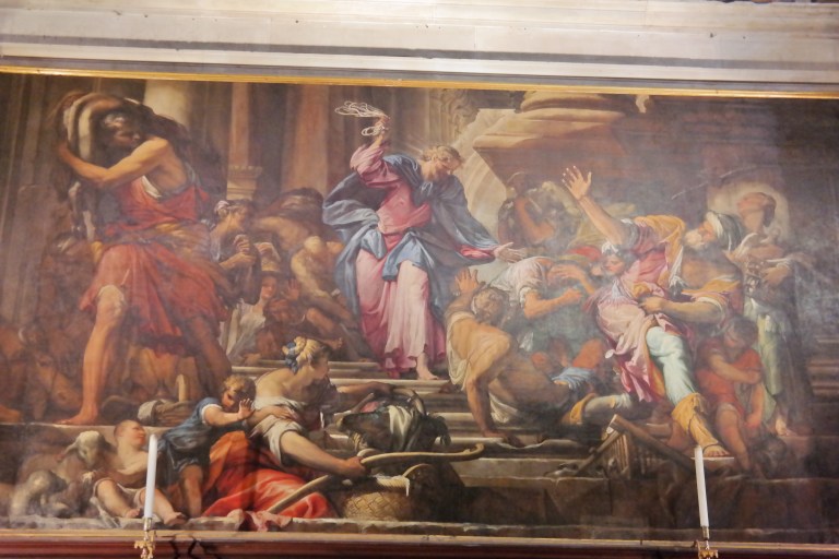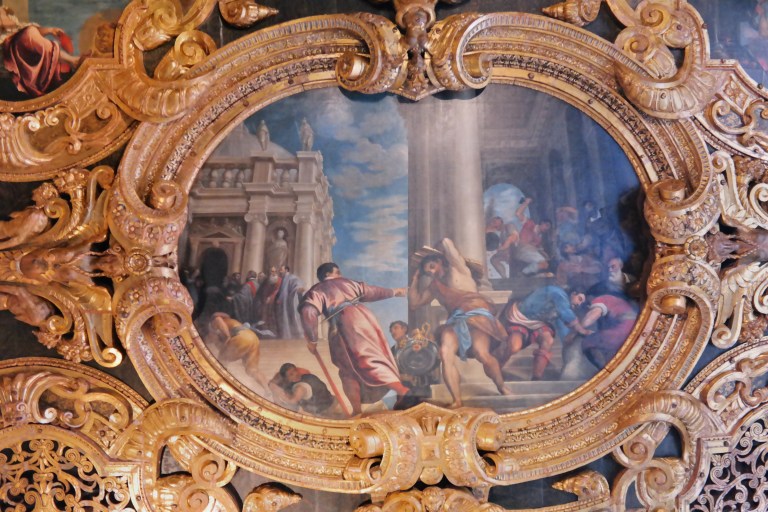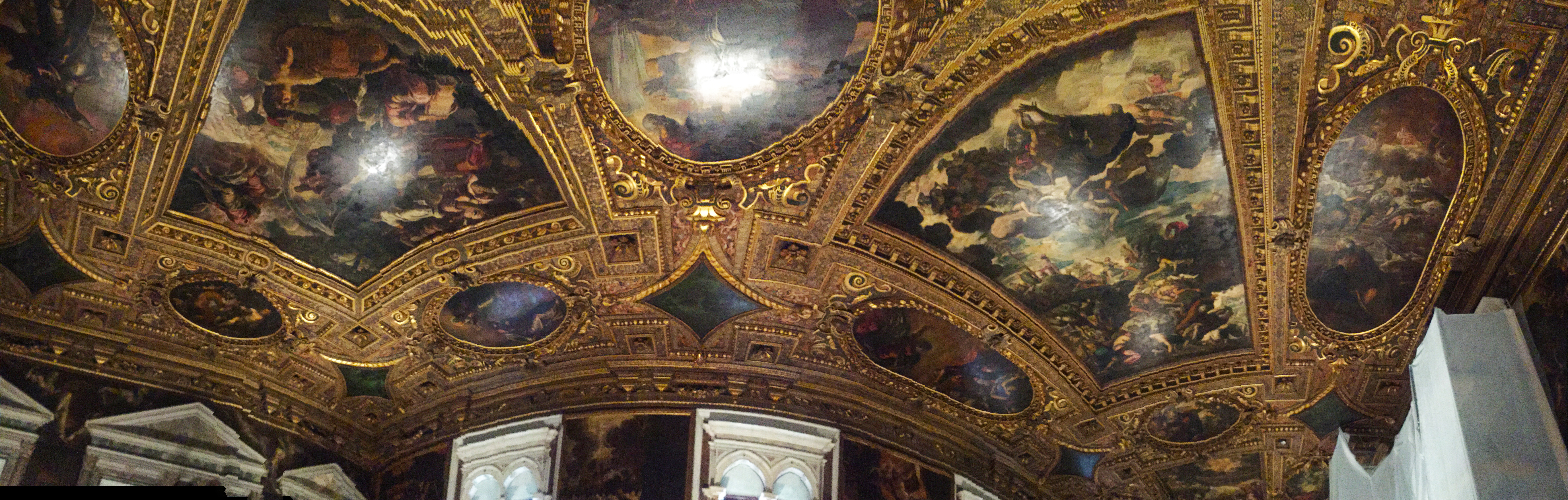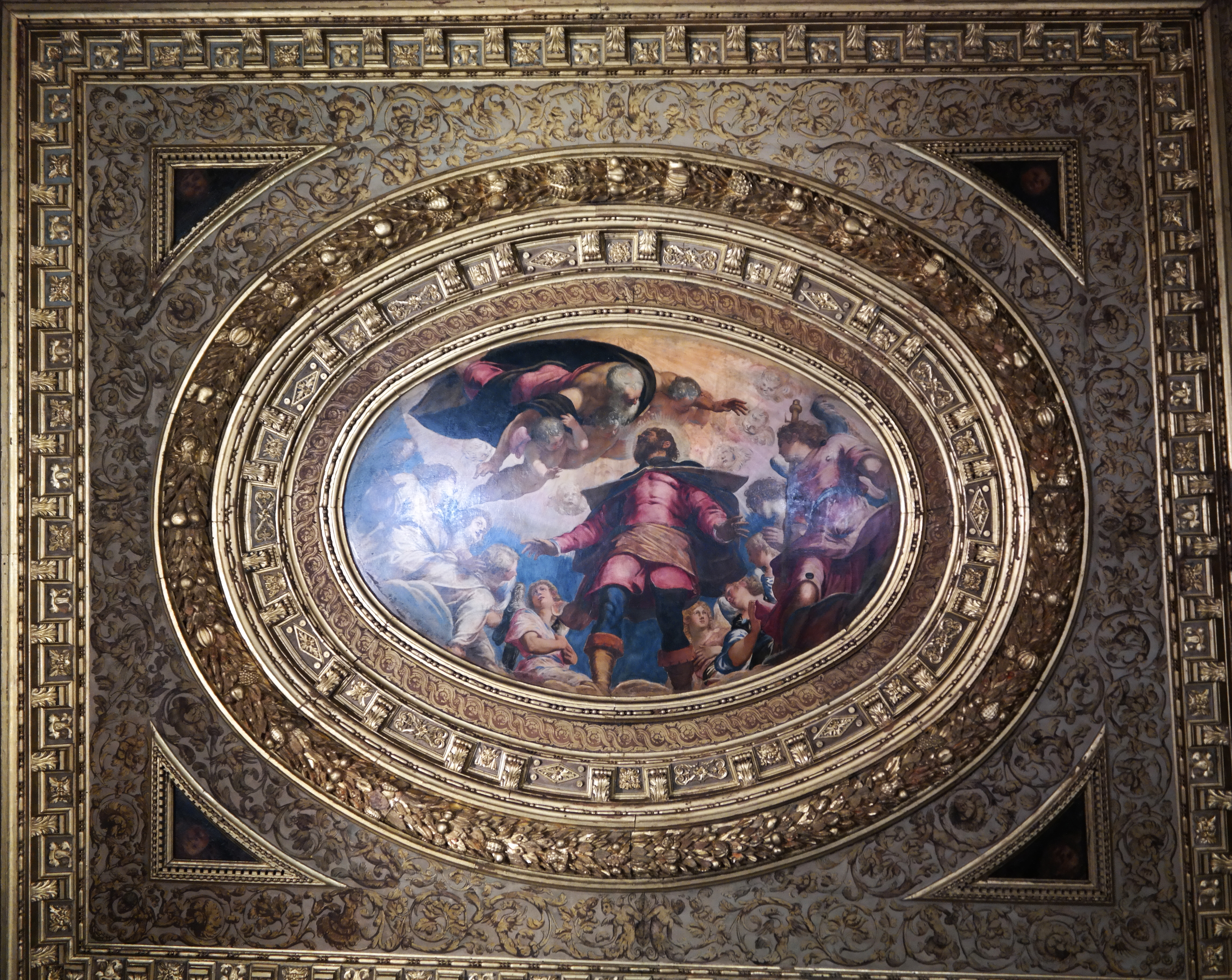This building, started in around 1520, was built by a wealthy fraternal organization dedicated to St. Roch, who was the protector Saint against the Plague.   About 50,000 Venetians had died by the plague up until this point, so this was a serious matter.   Years after the building was completed, in around 1560, the Fraternity looked to hire the best artist to decorate the ceilings of the two main Halls.  They chose Tintoretto.  On the first floor, right off the square, he painted the ceiling showing the story of Mary’s life.  Upstairs, where the Council met, he painted the Old Testament (some of the side rooms showed New Testament depictions, as well).