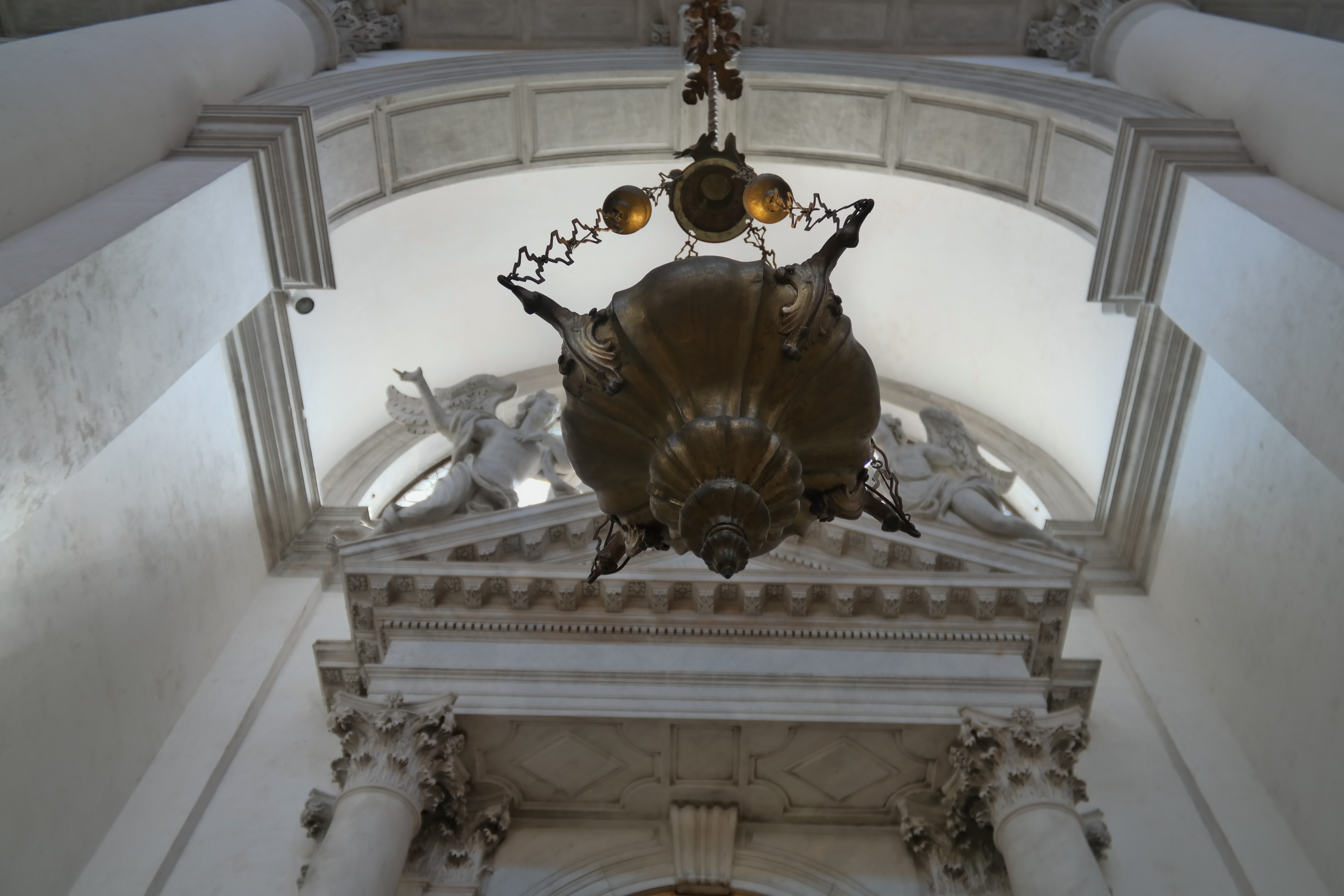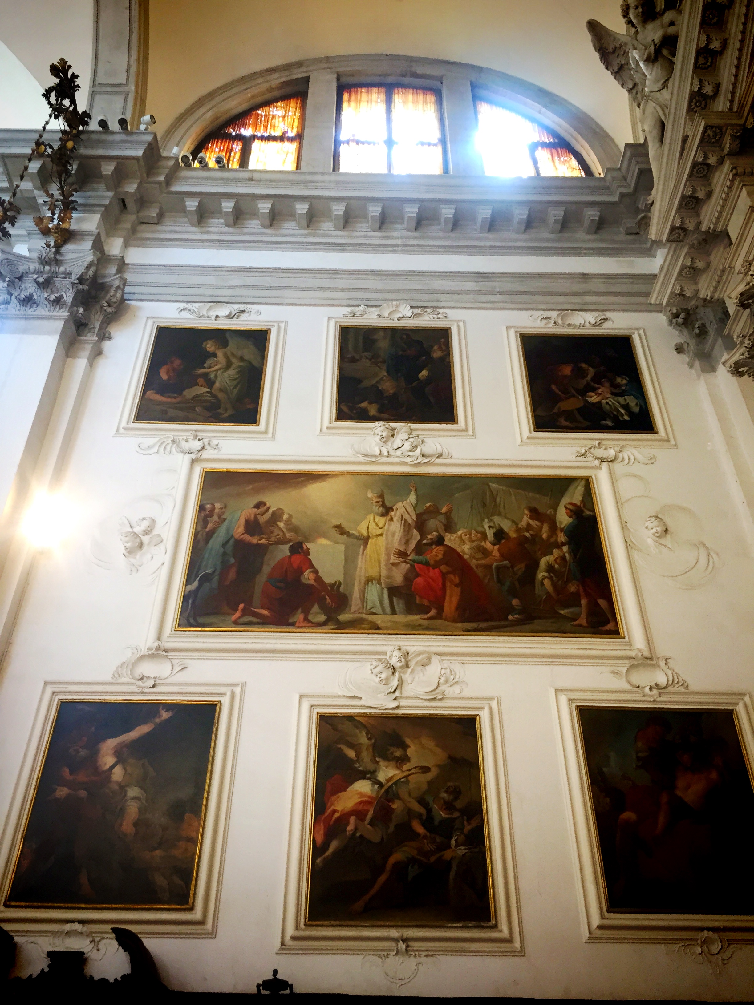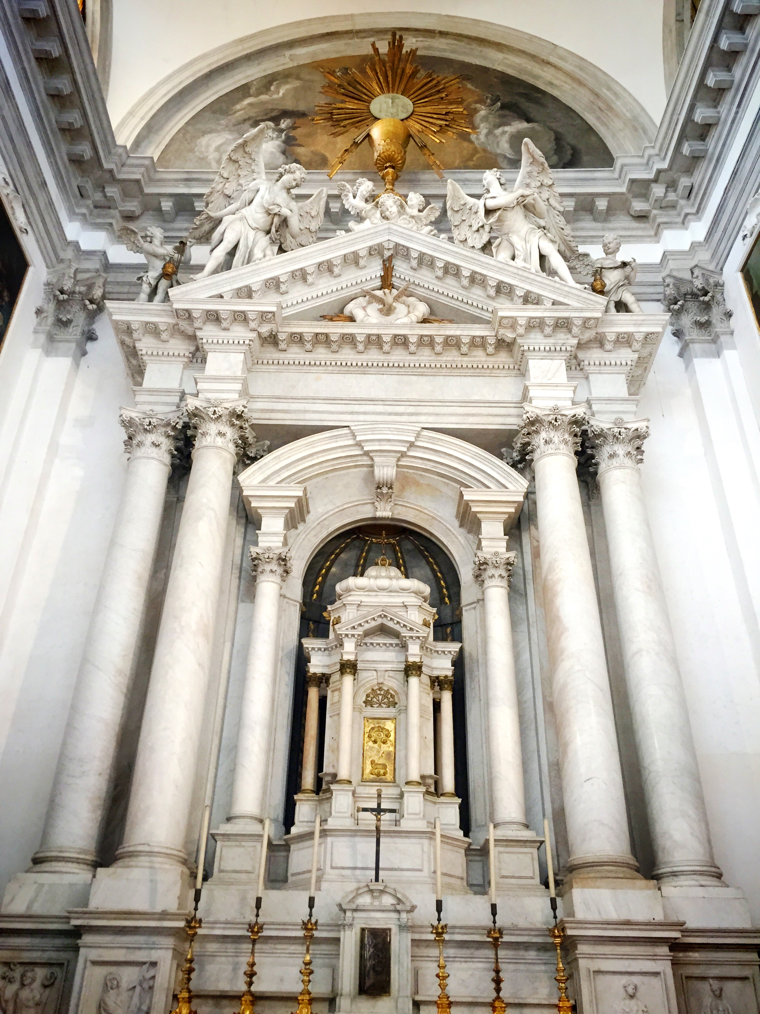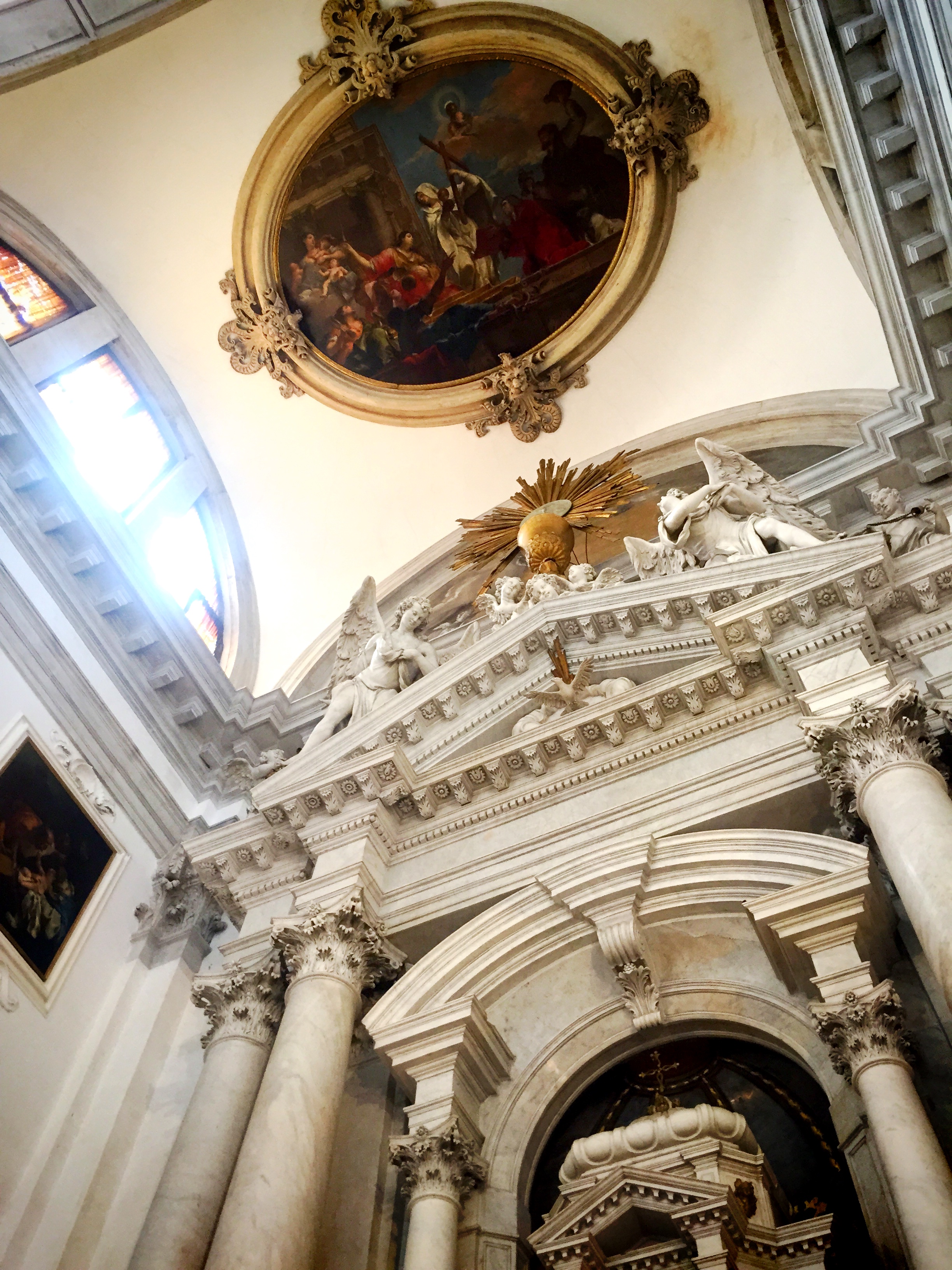 After the intensity of all of the Tintoretto paintings…and they are intense, we did a little retail therapy (we bought some leather bags) and then it was off to the vaporetto (water bus) to see more stuff!  We had purchased a Museum Pass when we arrived that gave you entry into several museums + the Doge’s Palace. So we really wanted to make use of the pass.   We decided to go to the Palazzo Mocenigo, which houses a textile and costume museum.  As we got off the water taxi, we were greeted with the beautiful San Stae church….and you know us….we had to go inside!  This church was built in 1709 by Domenico Rossi.