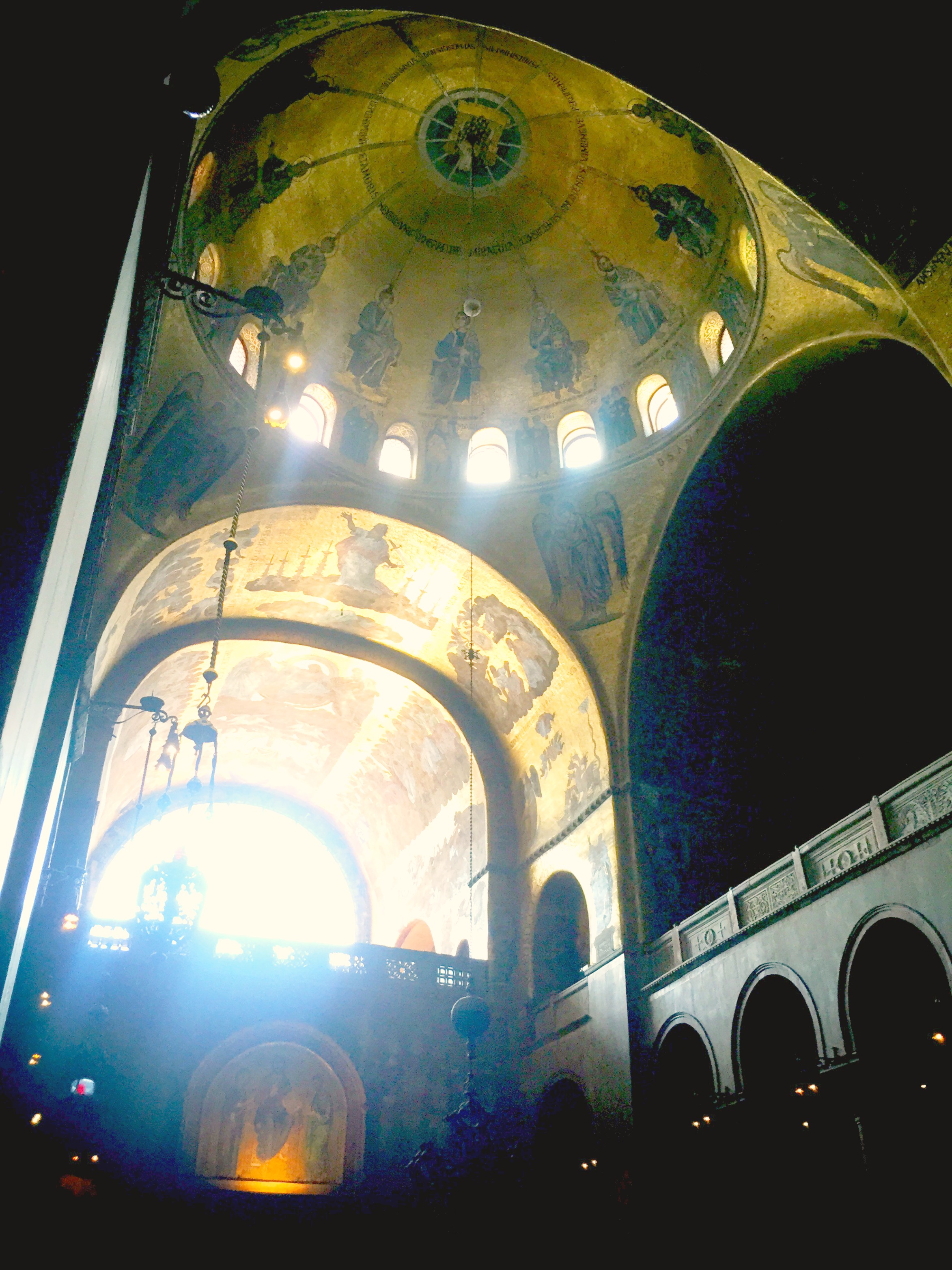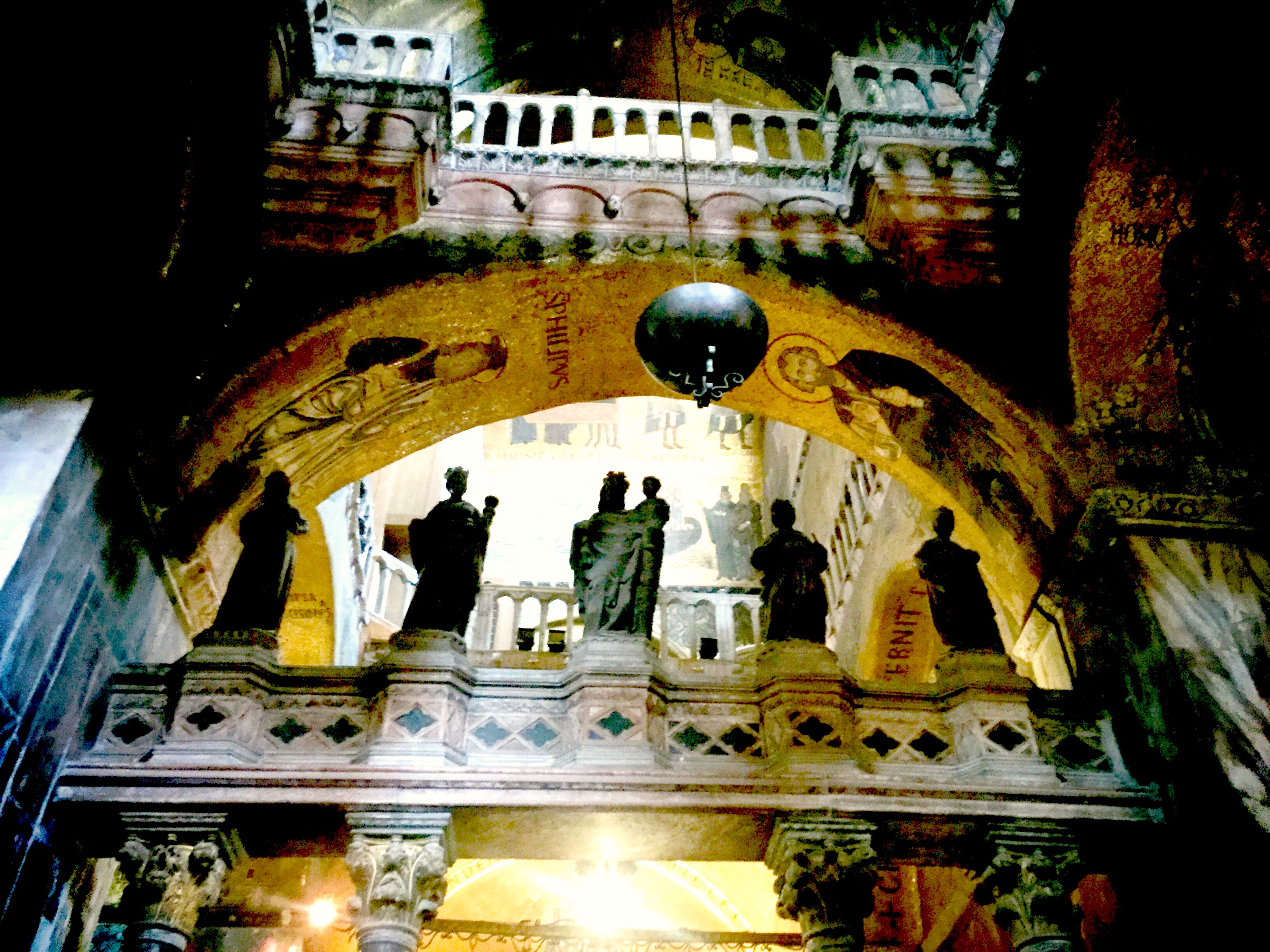 St. Mark is the patron Saint of Venice.  His symbol is the Lion and you see the symbol all over Venice and is even on the flag of Venice.   In about 828 A.D. St. Mark’s remains were located in Alexandria, Egypt, which was a Muslim territory.  Two merchants from Venice “rescued” the body from the Muslims and brought his remains back to Venice in a pork barrel and presented it to the Doge and his wife.  It was decided to inter the remains in Venice and build a grand church over the bones to celebrate St. Mark… and thus construction began…the original church in 976AD (which burned down) and the existing one in 1063.  The church was based on the Greek Cross plan, as are the great churches in Constantinople (now Istanbul, Turkey)…thus its Byzantine look.