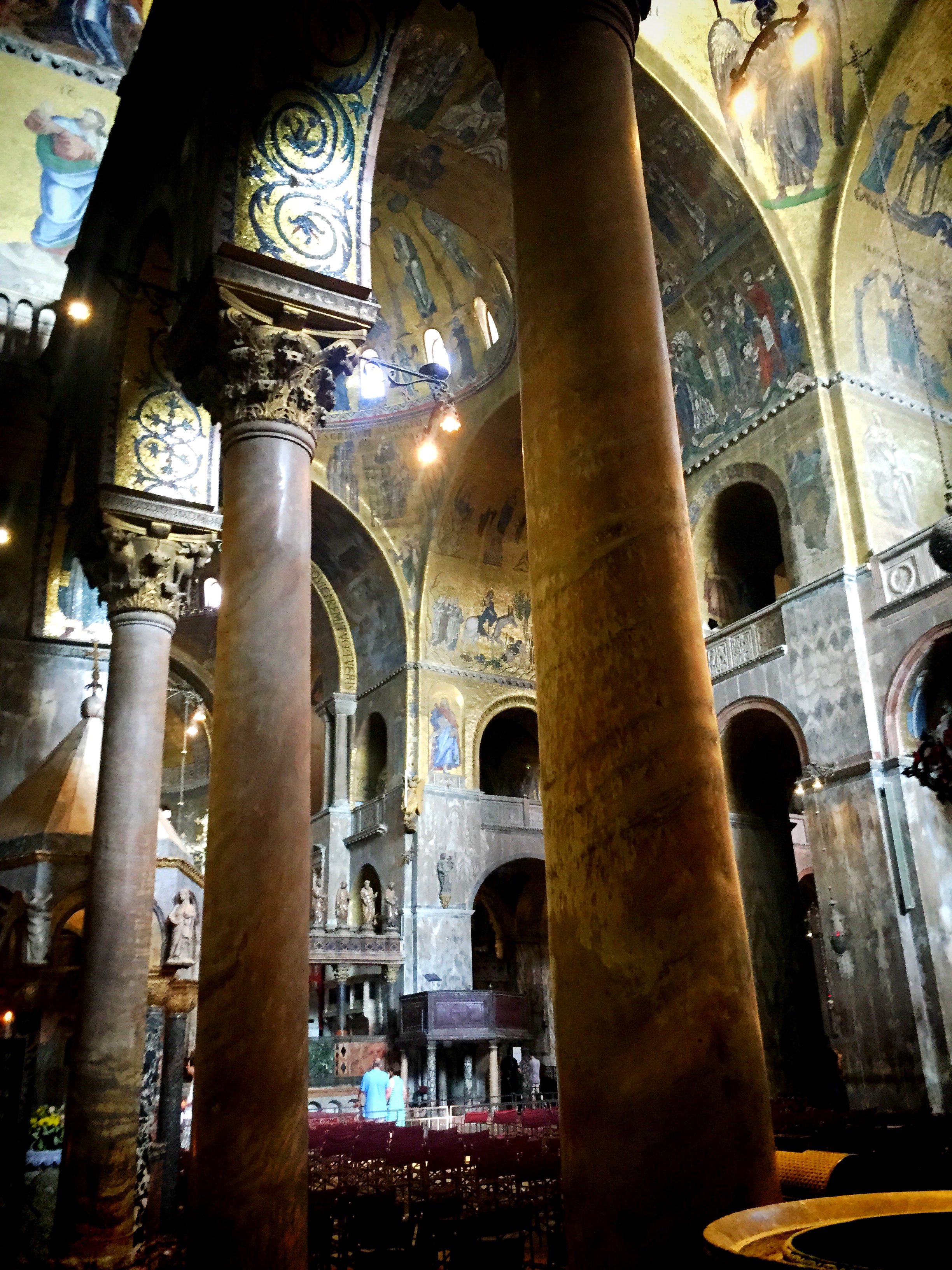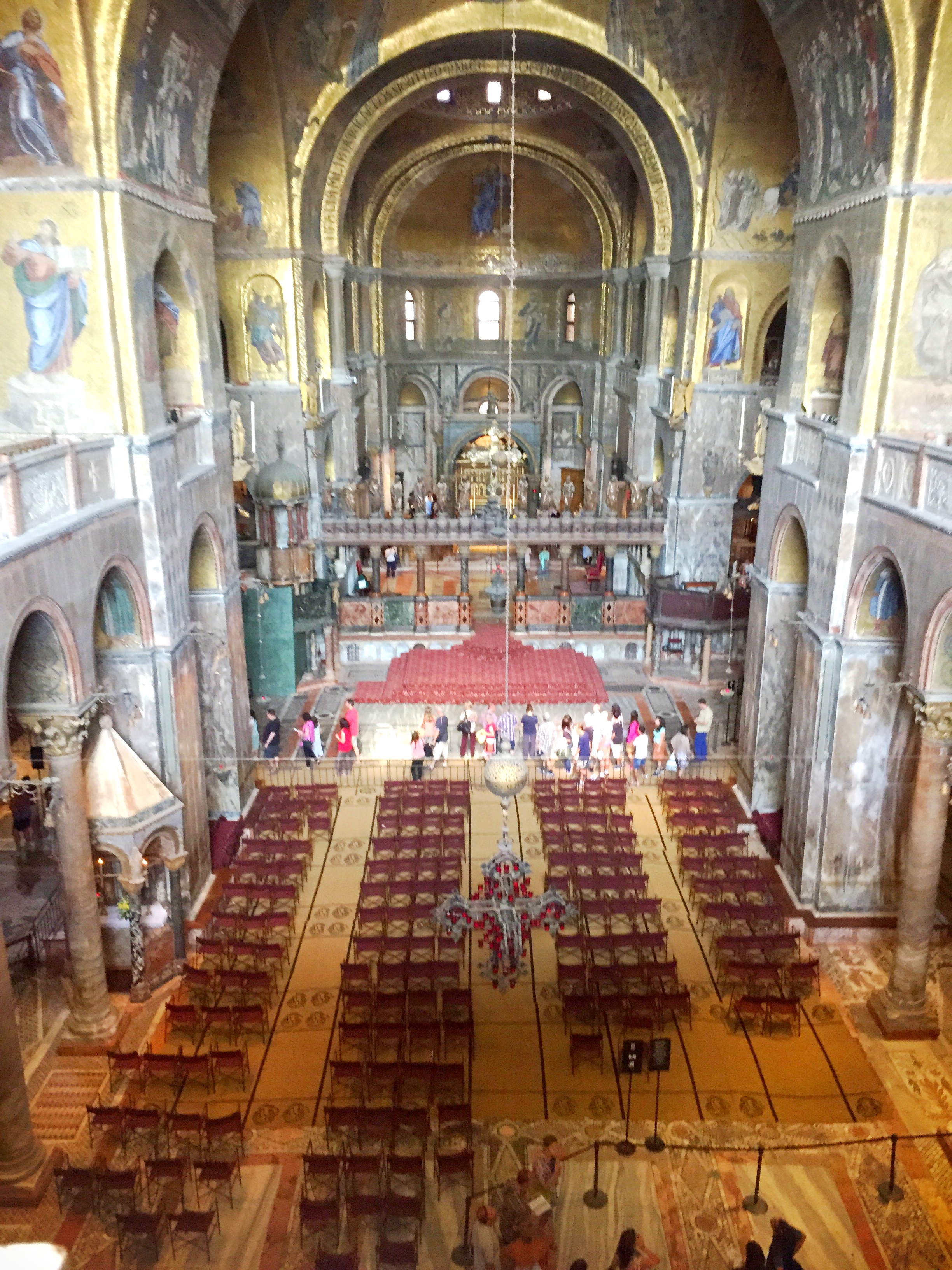 Interestingly, much of the interior and exterior decoration is an amalgamation of things that were ransacked from other people and places by the Venetians.  Tiles, columns, architraves…even the famous bronze horses were stolen by the Venetians in about 1255 and brought back to be mounted on the front of the Church.  Years later, Napoleon would steal the horses and take them back to Paris to be mounted on a triumphal arch!  So this Basicilica is like bric-a-brac design.