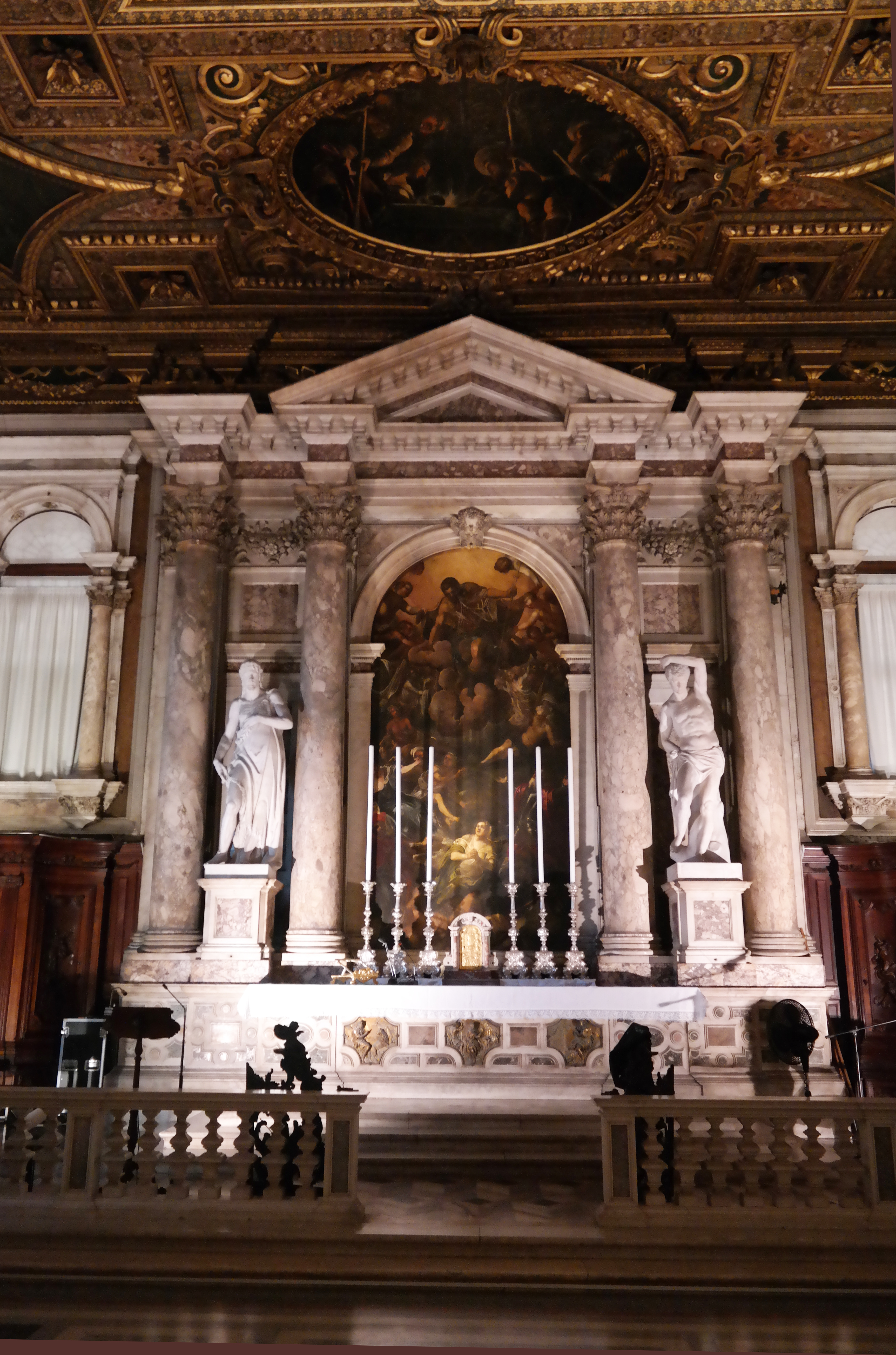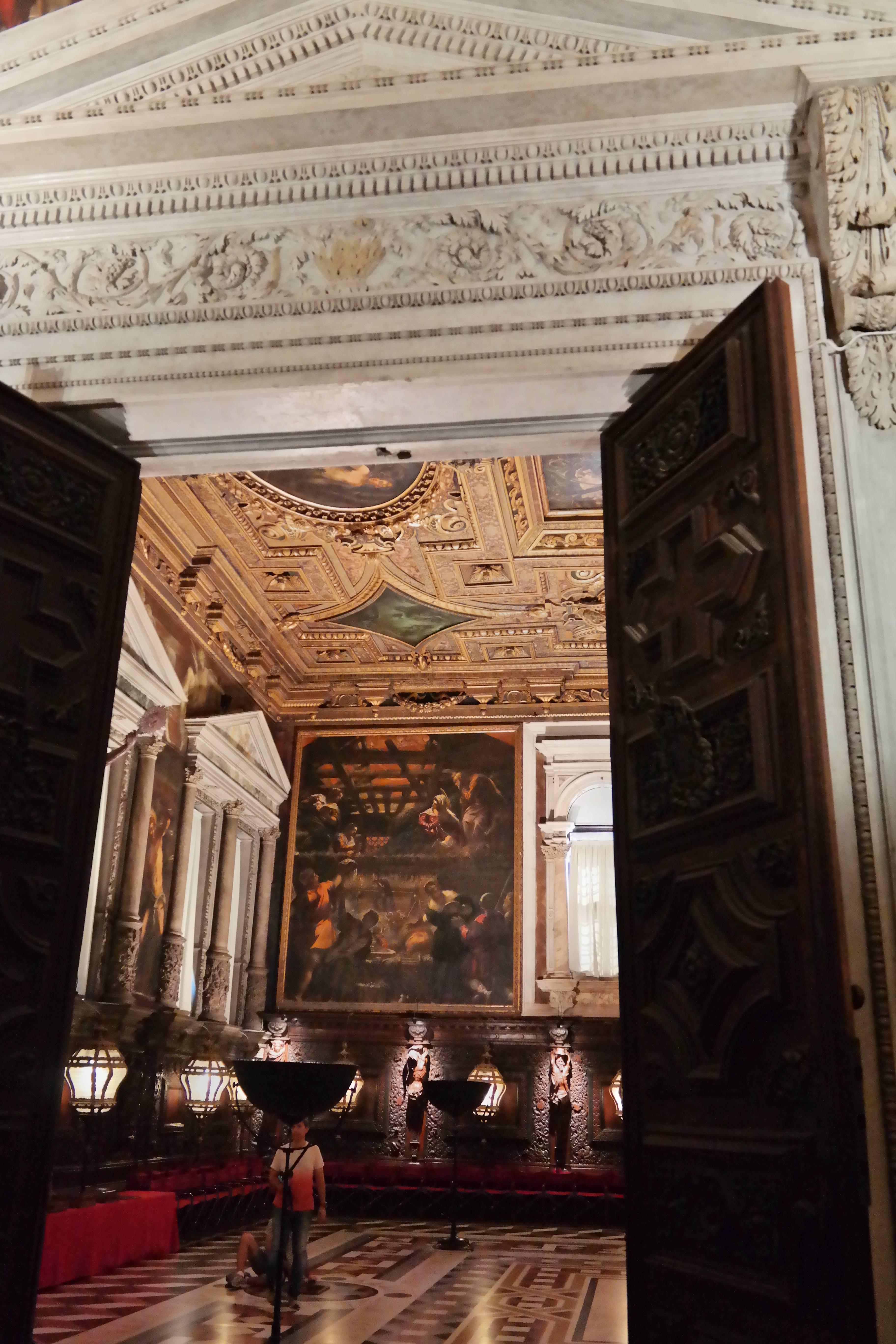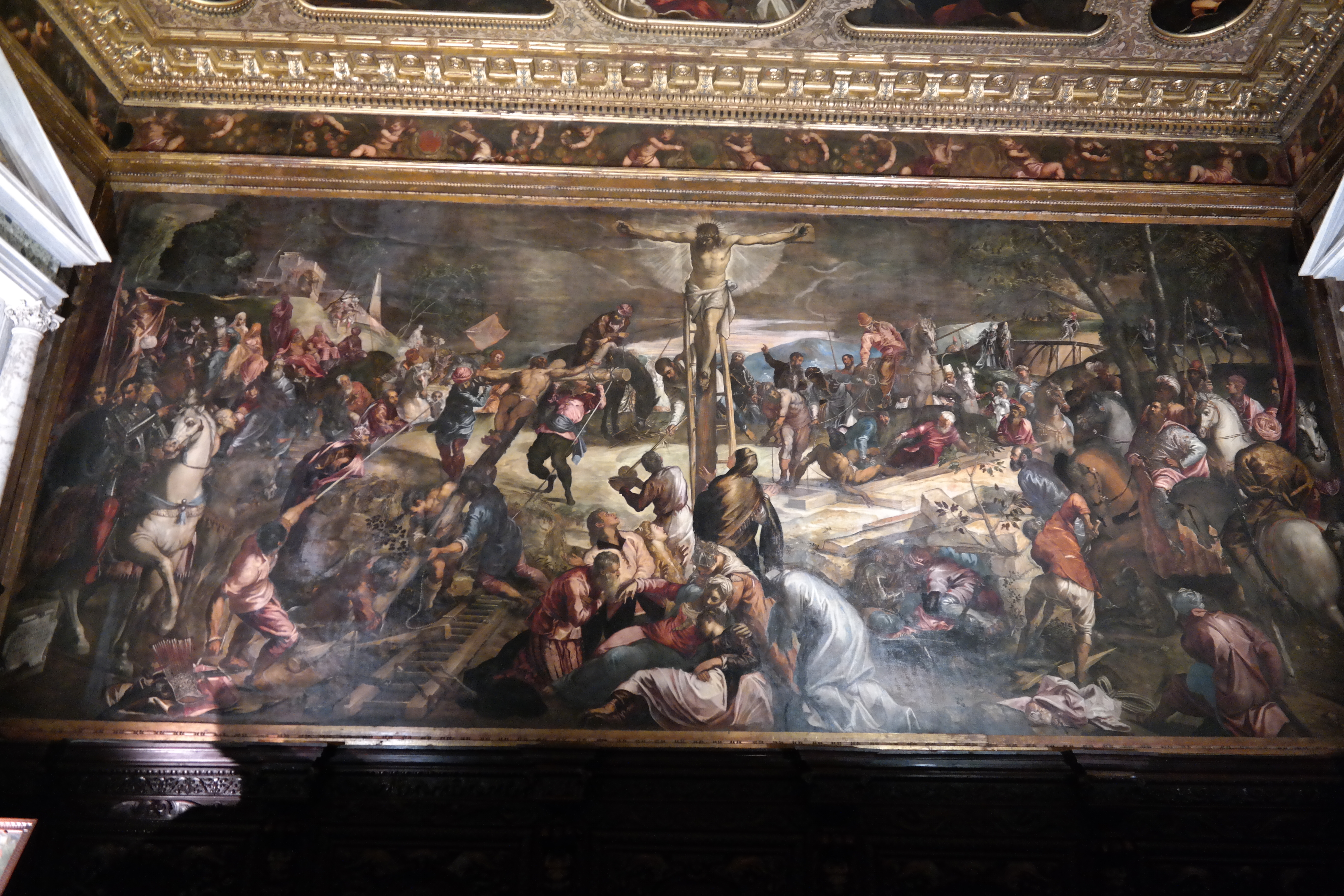 As much of the art is on the ceiling,  they provide mirrors that you can hold in your hands and walk around in order to actually see the Tintoretto works on the ceiling.  The upper room had very intricately carved wood panels that were absolutely amazing.