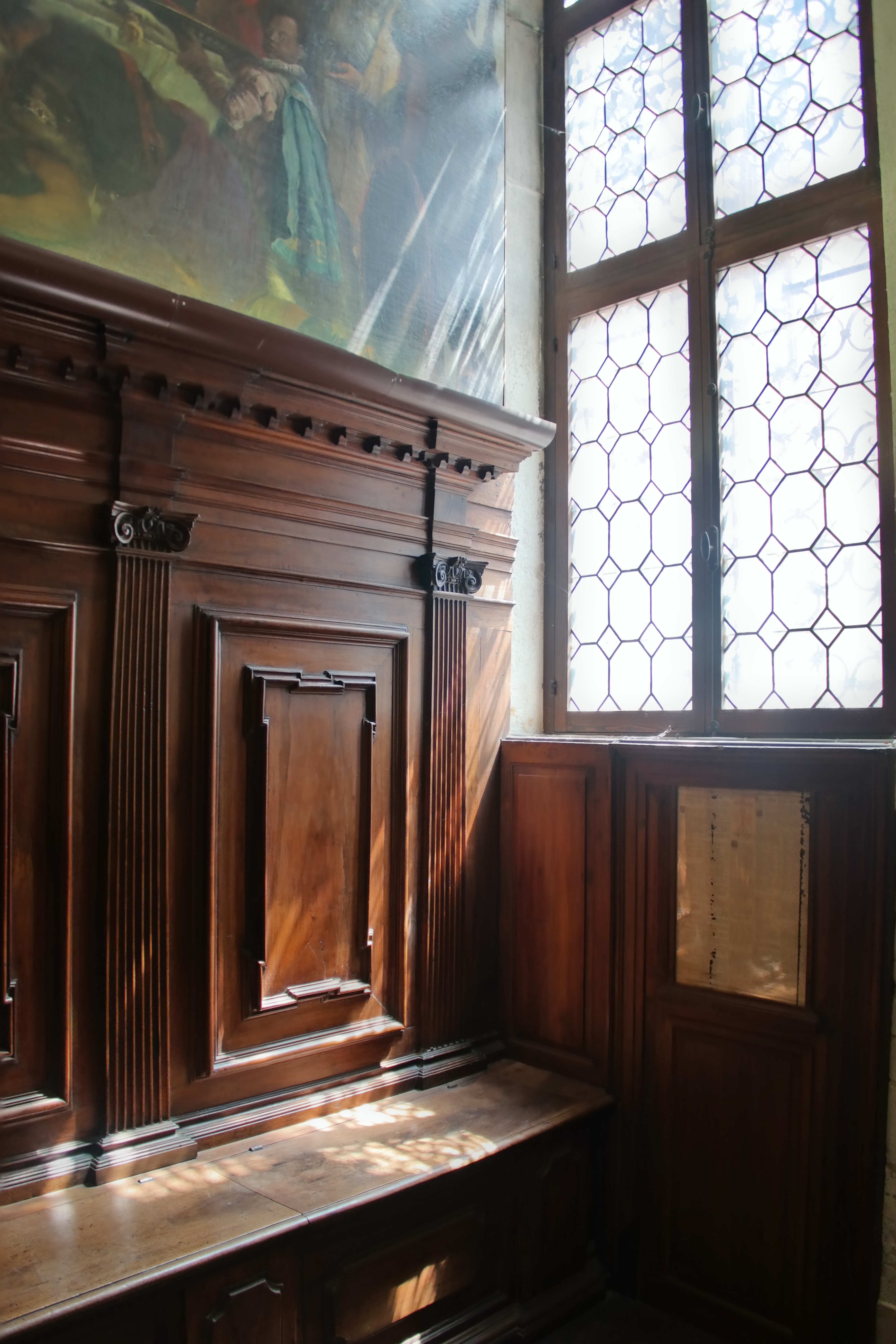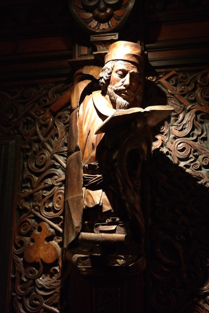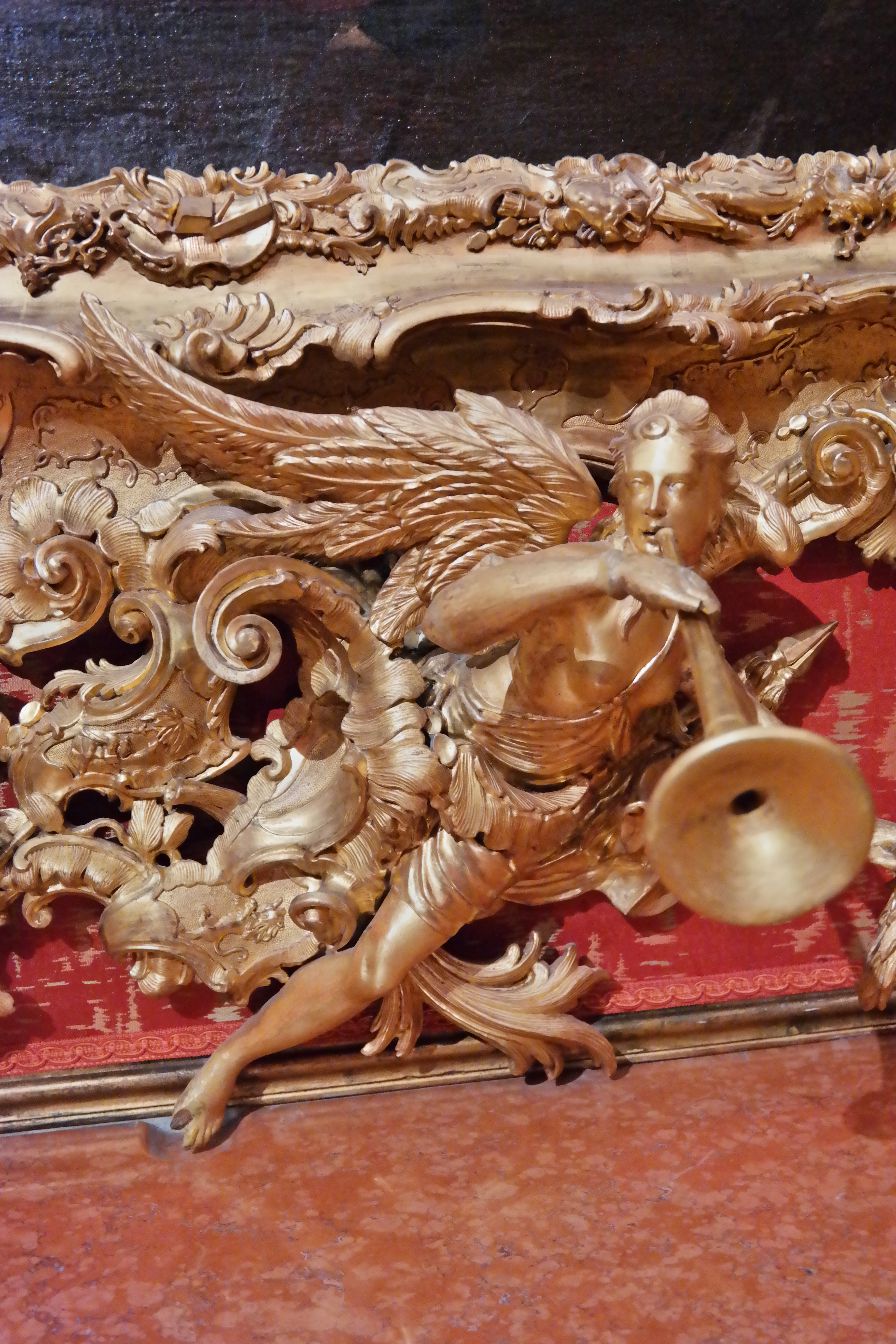 As much of the art is on the ceiling,  they provide mirrors that you can hold in your hands and walk around in order to actually see the Tintoretto works on the ceiling.  The upper room had very intricately carved wood panels that were absolutely amazing.