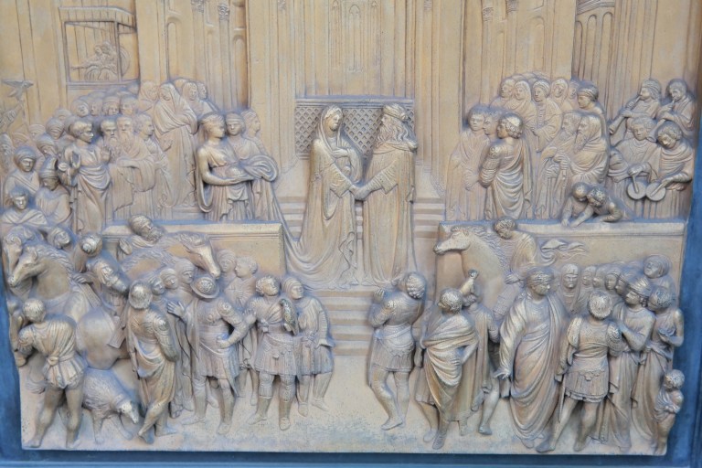 The Baptistery is also known for it’s famous bronze doors…two sets for each entry. These intricately sculpted doors tell various New or Old Testament stories from the Bible. One set famously called the “Gates of Paradise”.