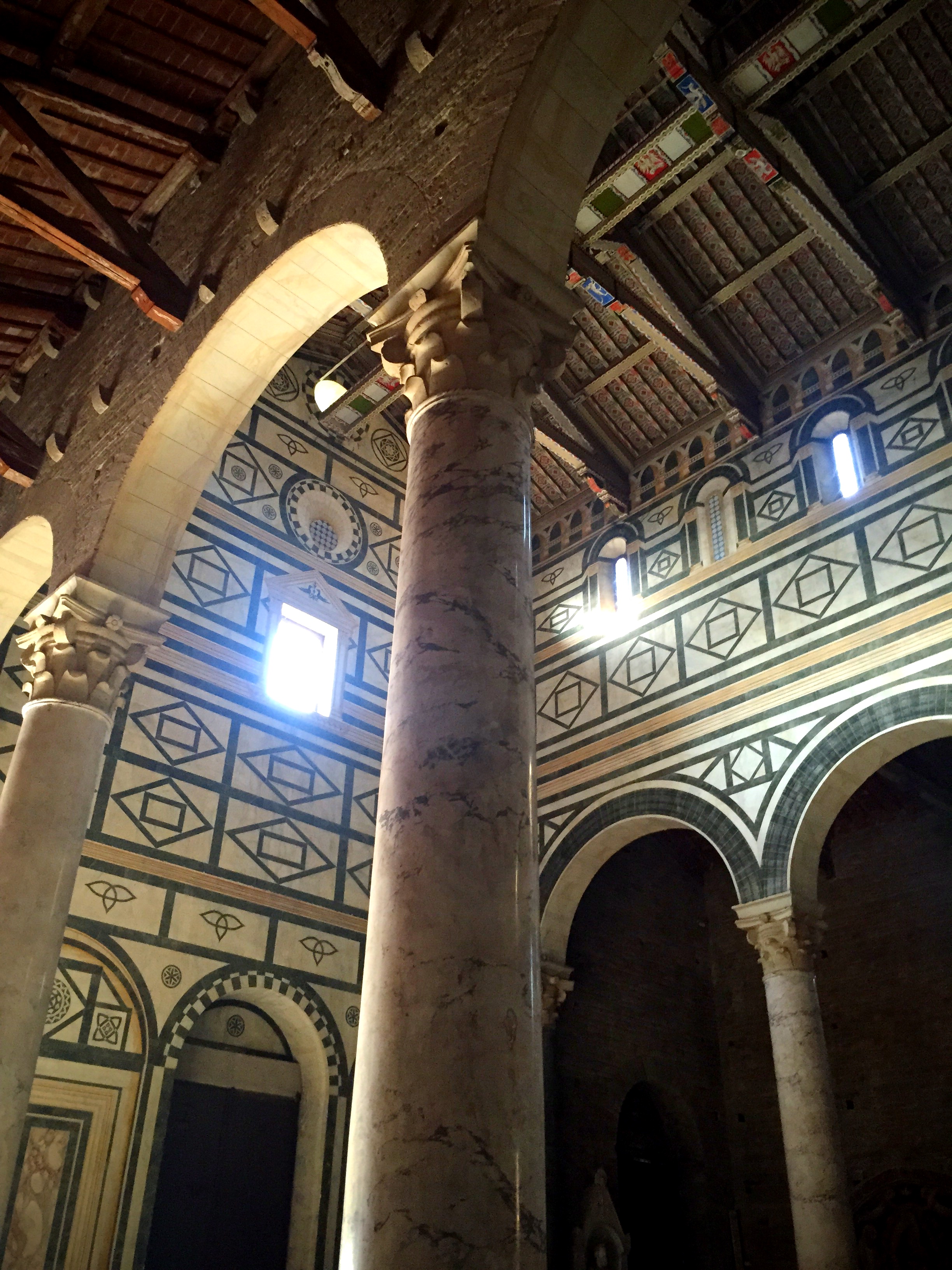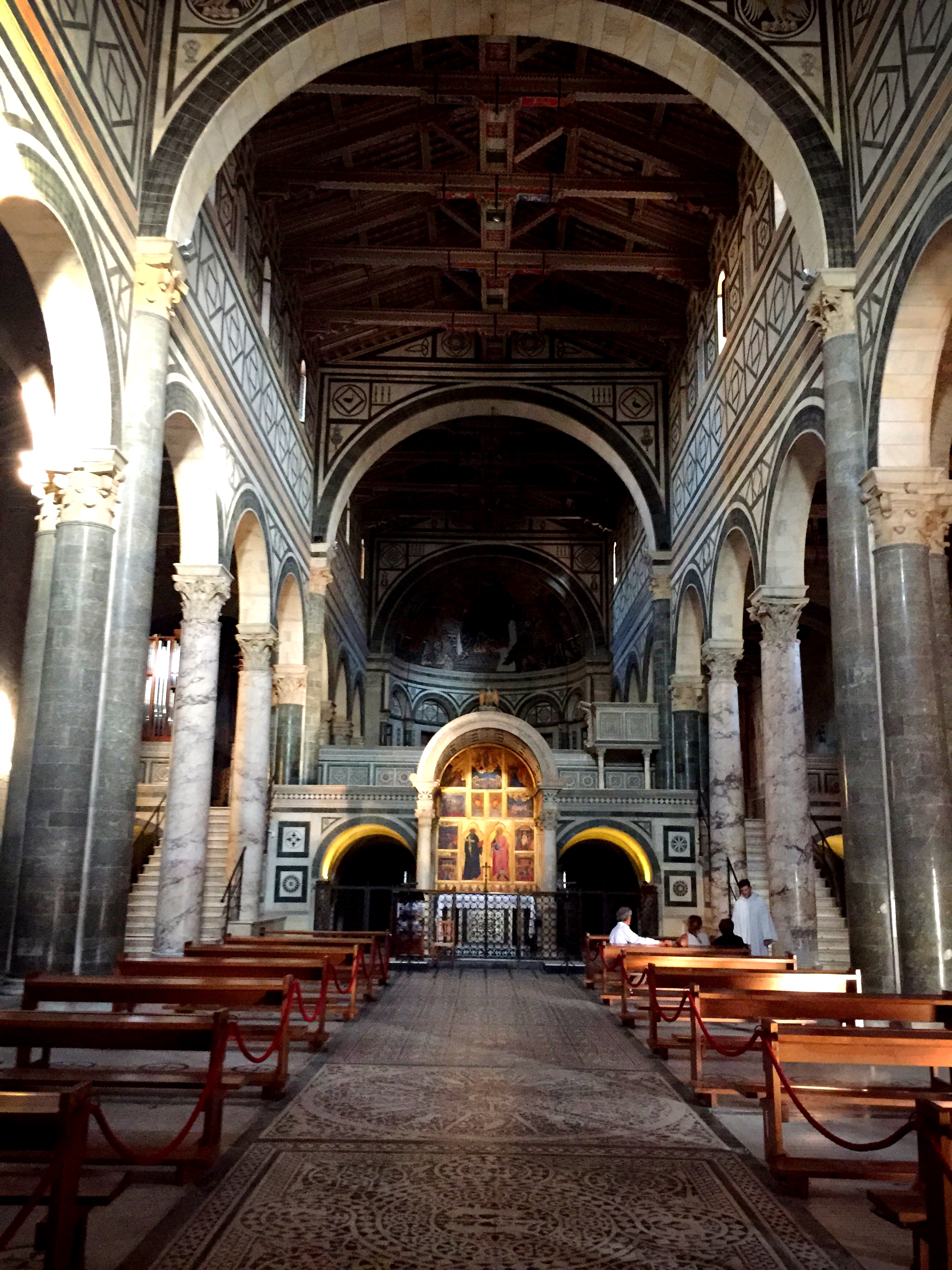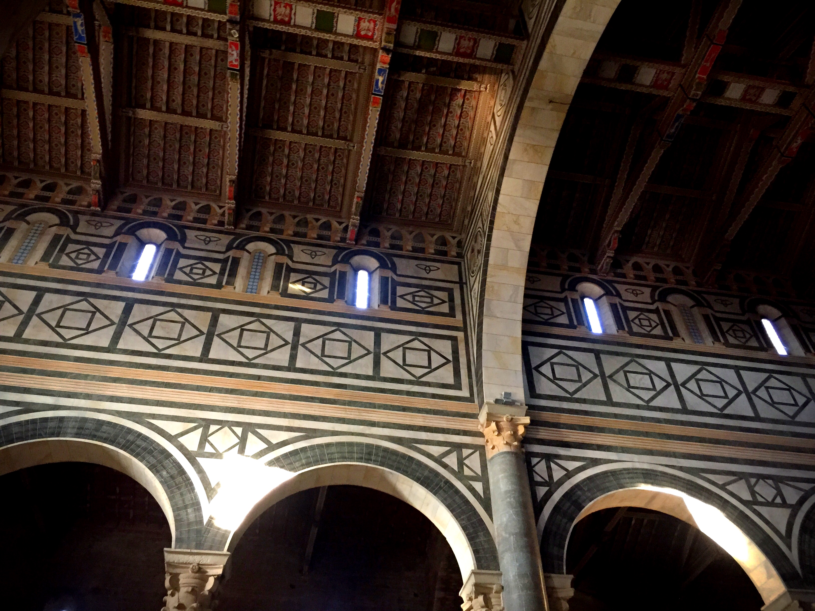 San Miniato was built in about 1018 and honors St. Miniato, who had been serving in the Roman army but was found out to be Christian. Brought before the Roman Emperor, he was given the punishment of being thrown to the panthers in the local Colosseum….but the animals would not attack him, so they decided to behead him. After the beheading, St. Miniato got up, picked up his head and climbed up what was then called Mons Fiorentinus. And this is where the church honoring him would be built years later.