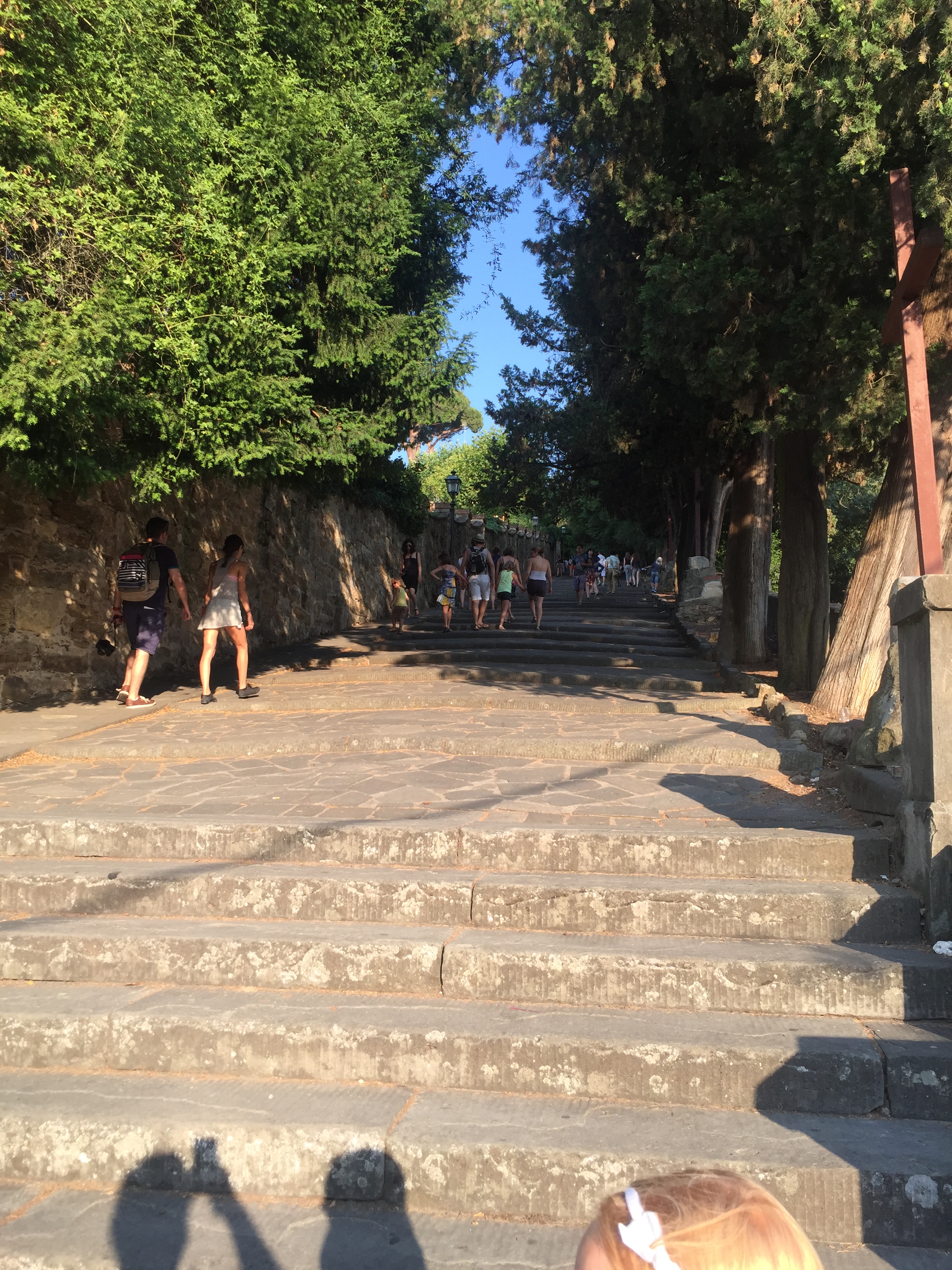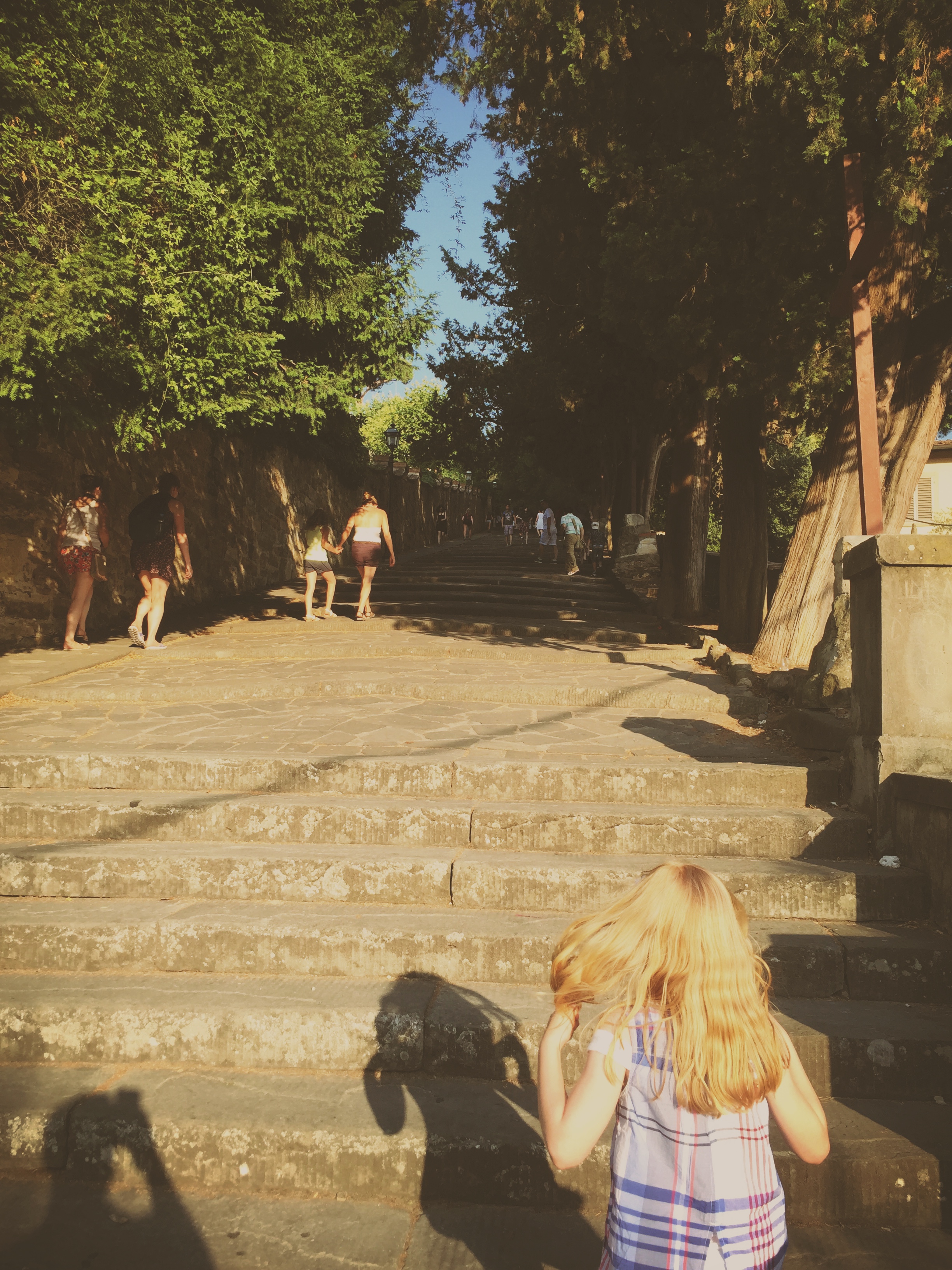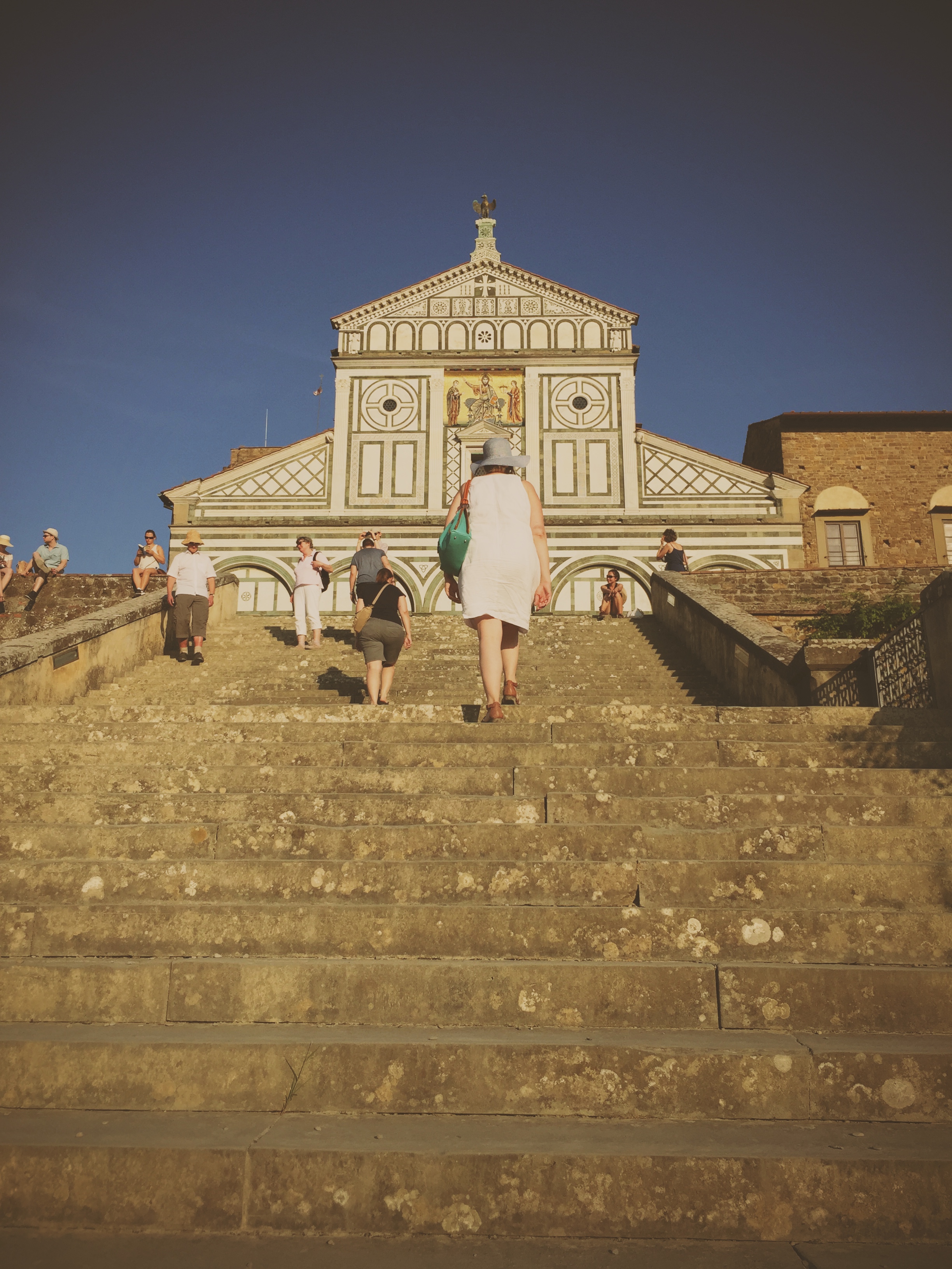 On our way out, we sat on the steps of San Miniato to take in the view of Florence. While sitting there, I happened to look up and I saw a familiar face. I thought…I know that woman…she was elegantly dressed in a cream lace dress…she looked sophisticated. And then it clicked in my tired, sun-baked brain…it was the actress Helen Mirren and her husband. I knew it was her, but then some bold young woman came up and asked to have her picture taken, and Ms. Mirren graciously agreed..so it confirmed by suspicions.