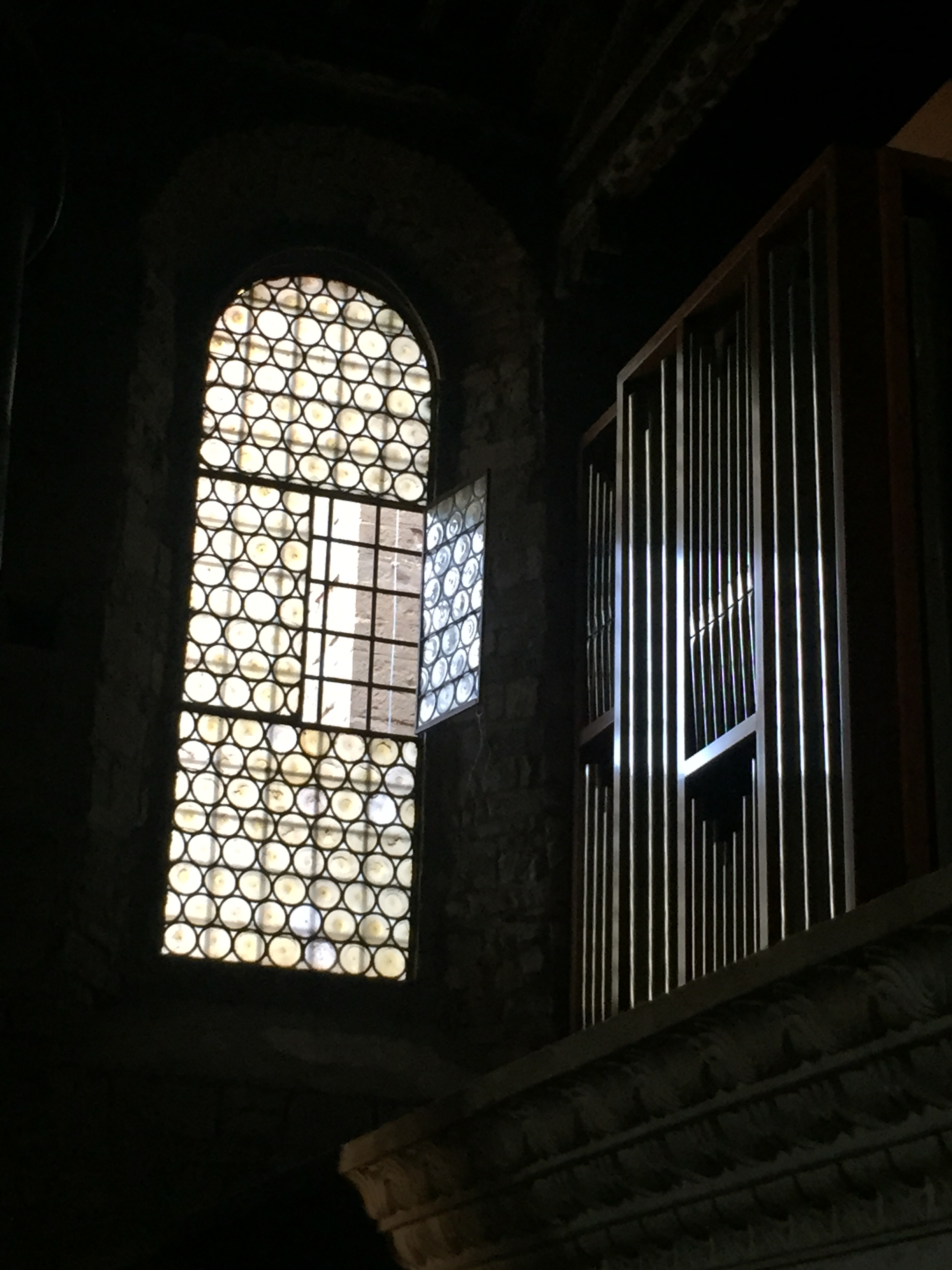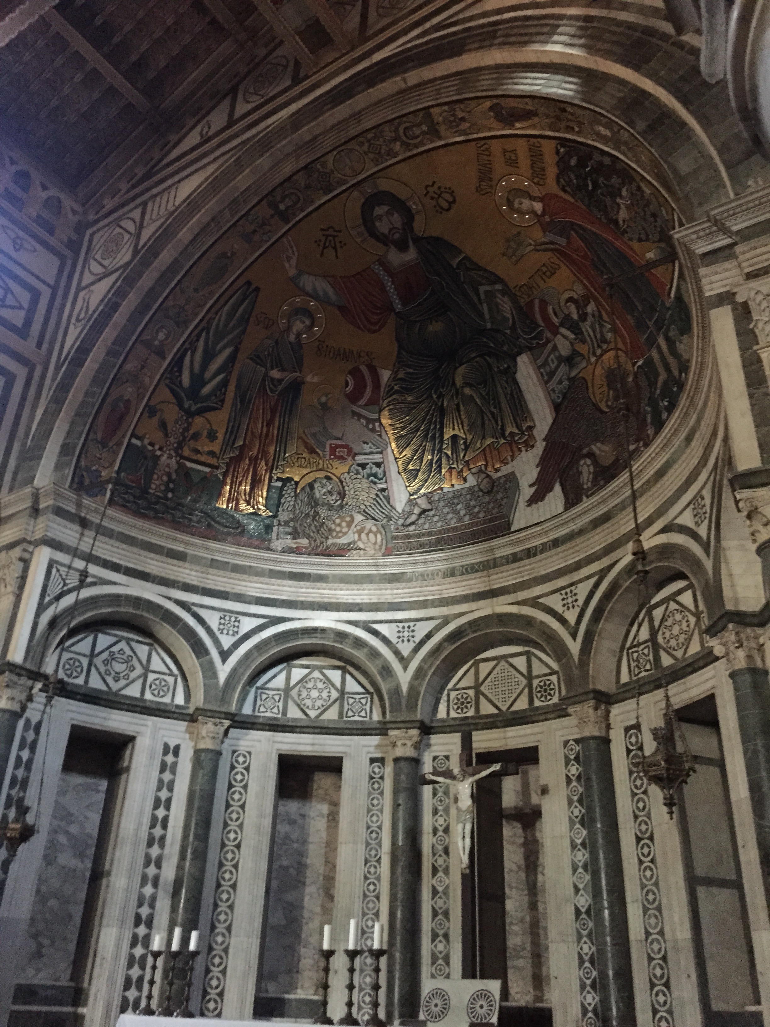 They are actually restoring the stained glass window from the Duomo and have it resting inside the Baptistery. It’s interesting to get to see a huge stained glass window like this up close.