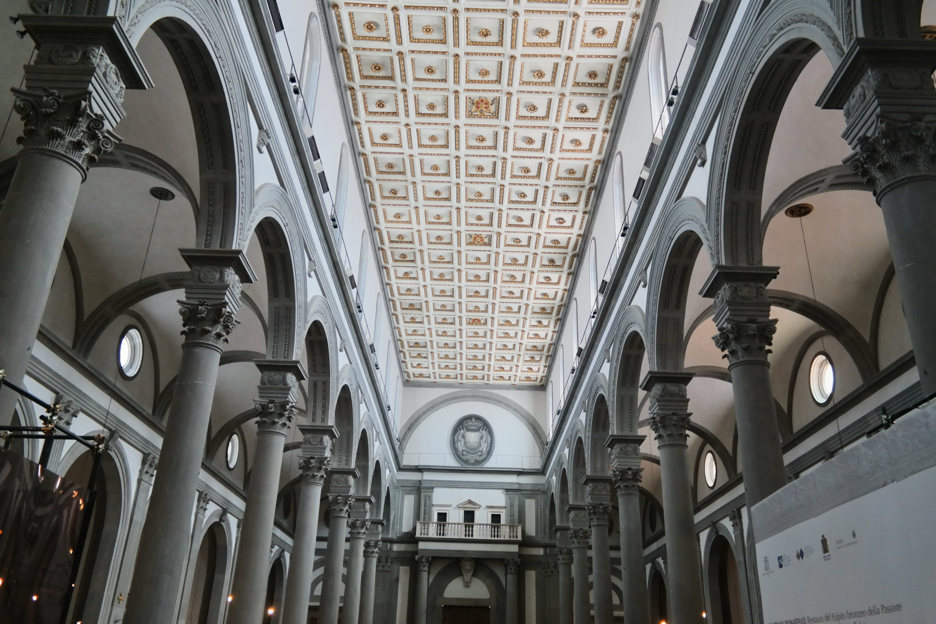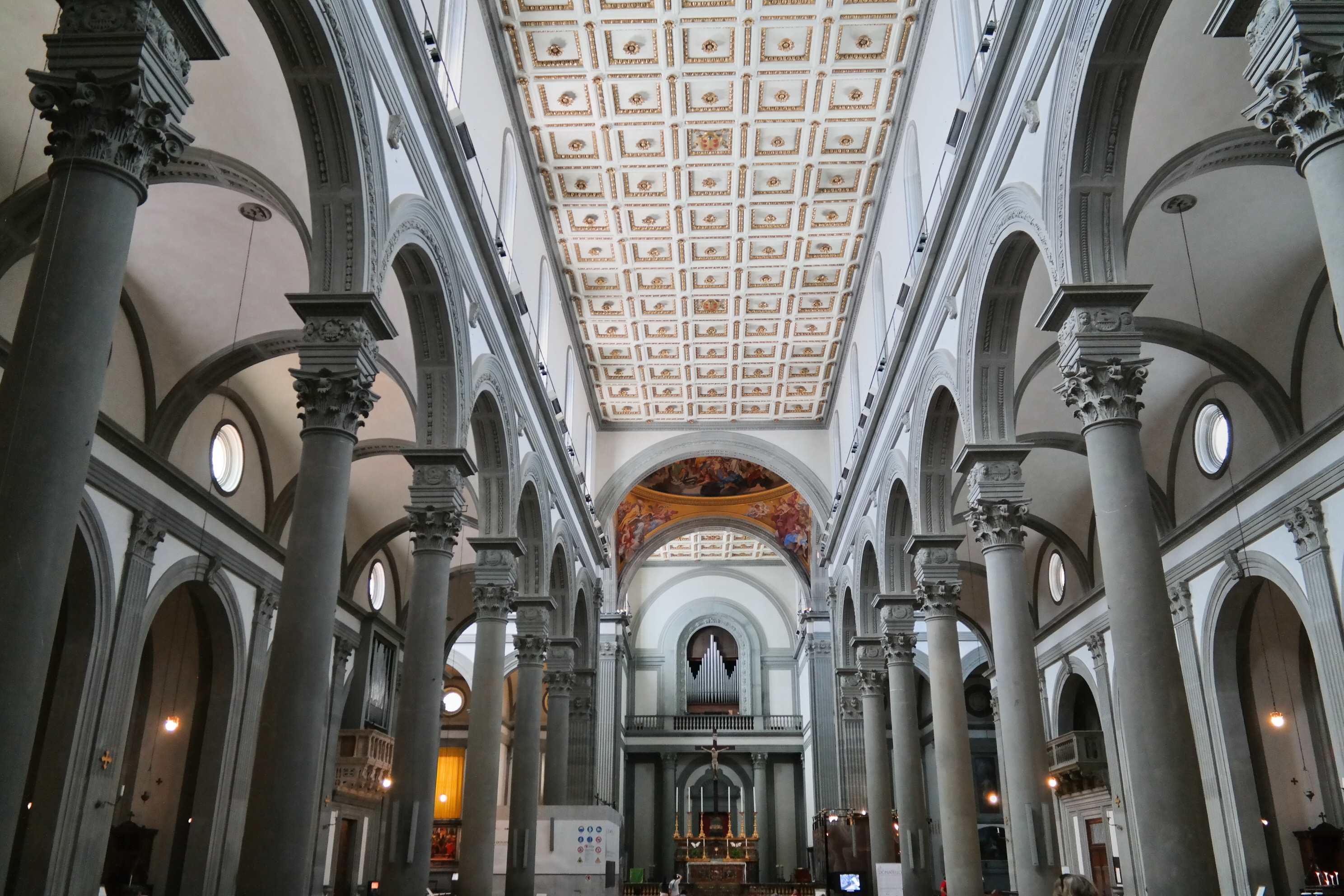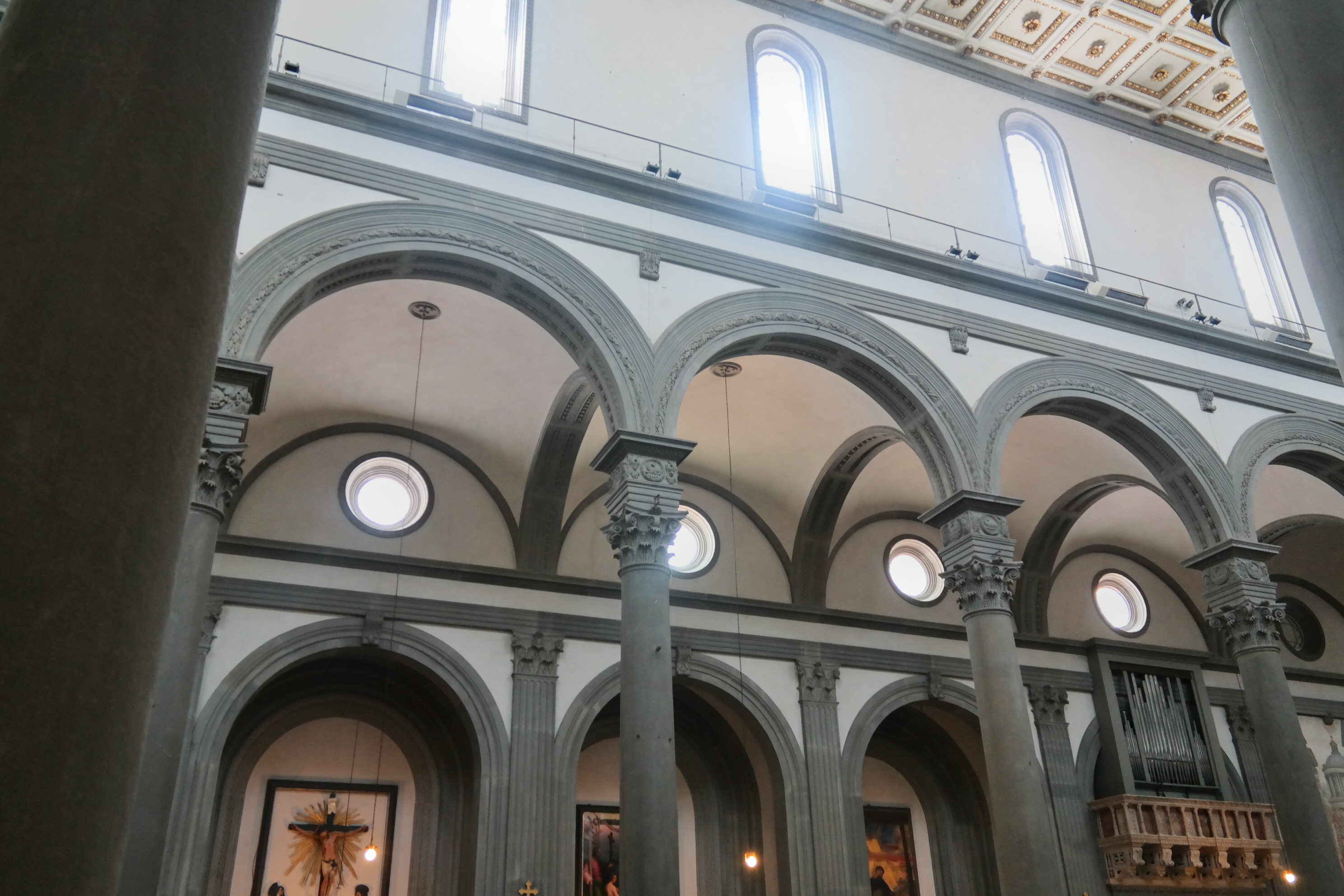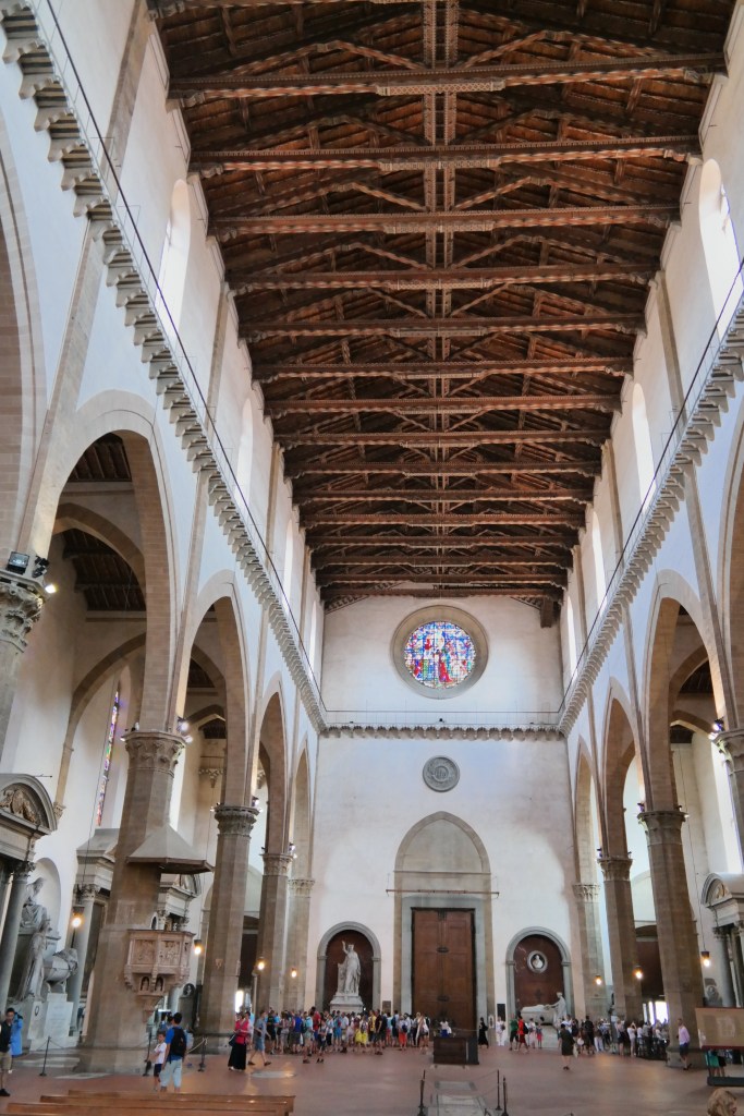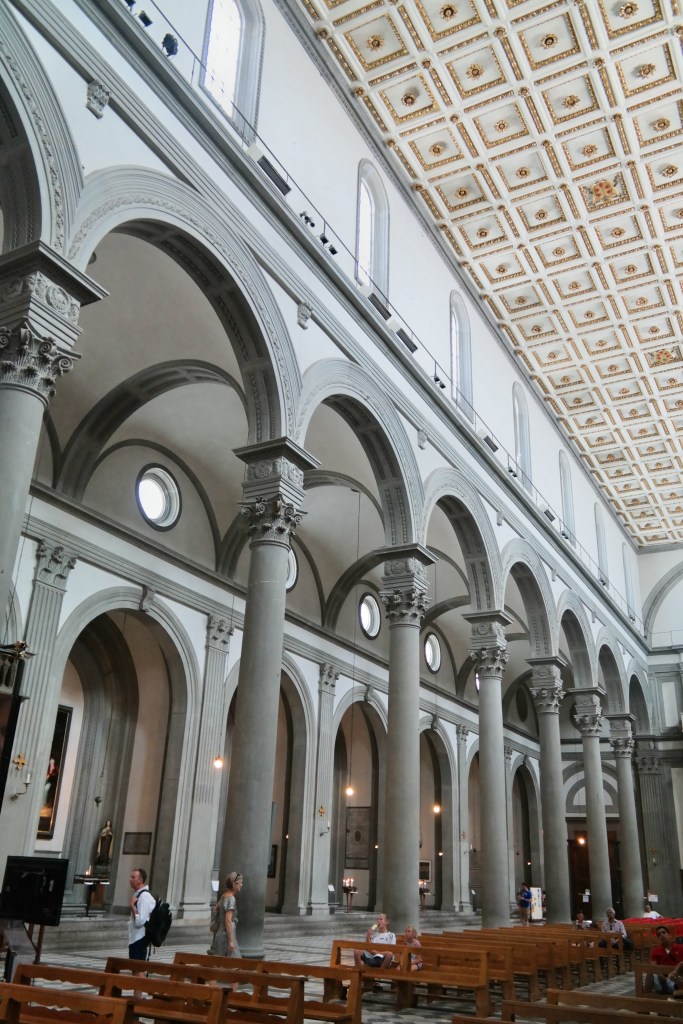 And then, finally inside the actual church, which is attached to all of these chapels and libraries…the Church of San Lorenzo, started the 15th century was designed (n part) by Brunellschi. This is a true Renaissance church. You will notice the clean, ordered precise approach to the architecture…no gothic, arched windows or stained glass…rather a clarity and light-filled church with a pure, corinthian-columned nave.