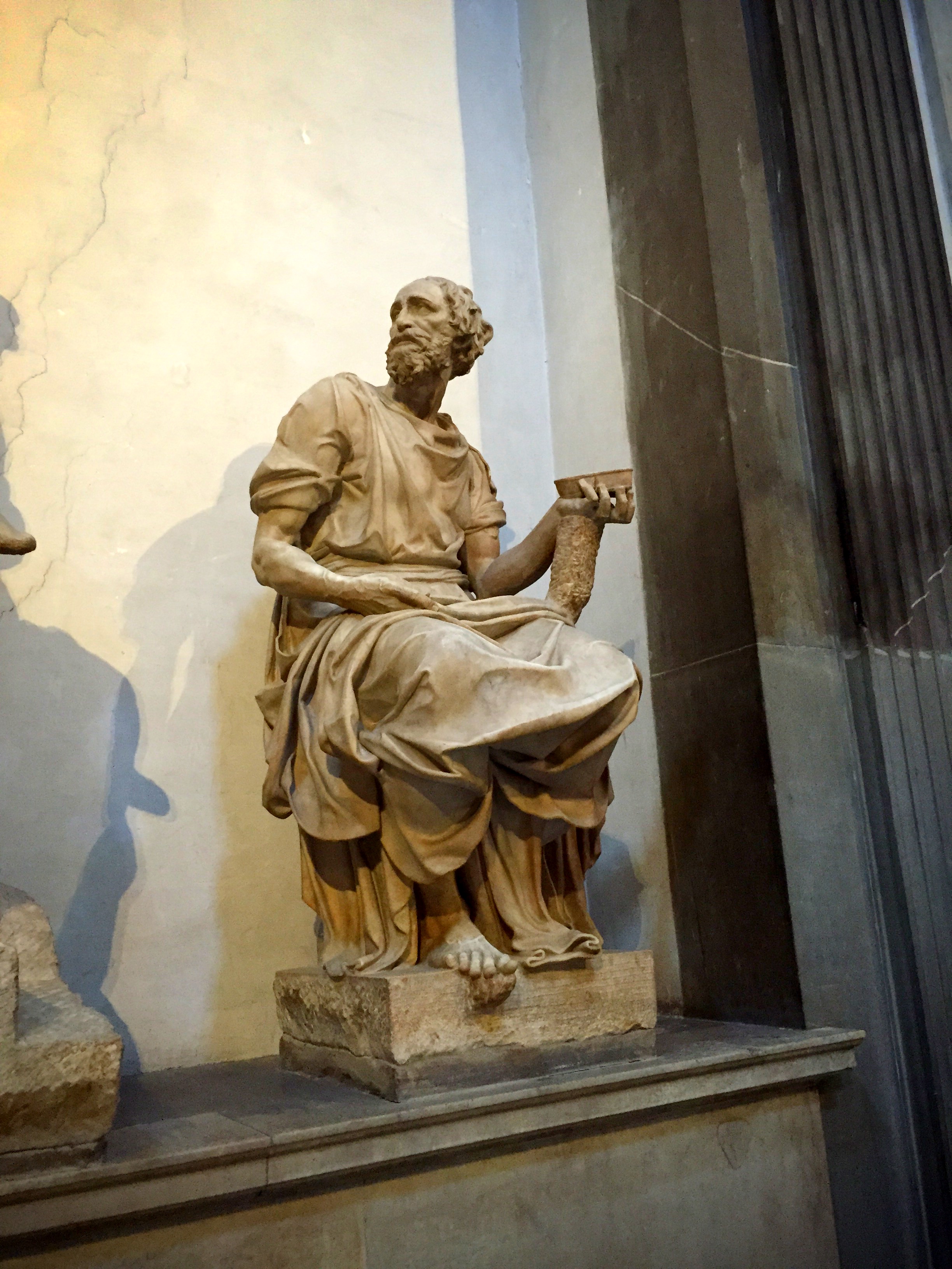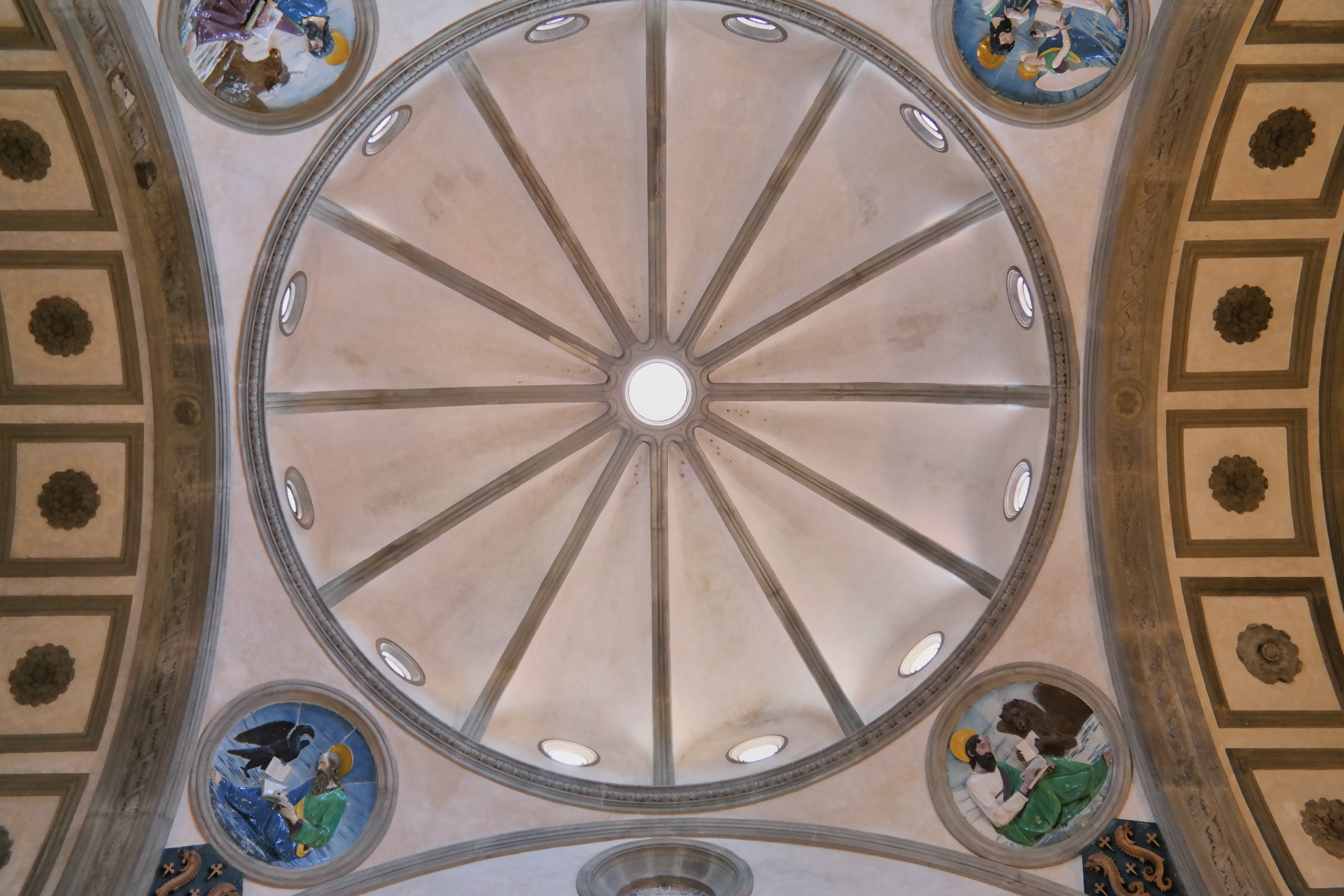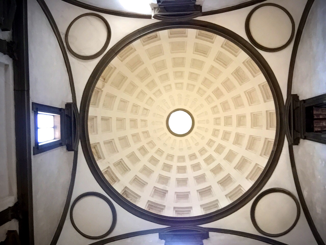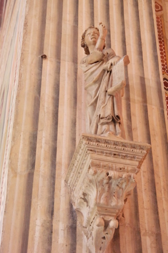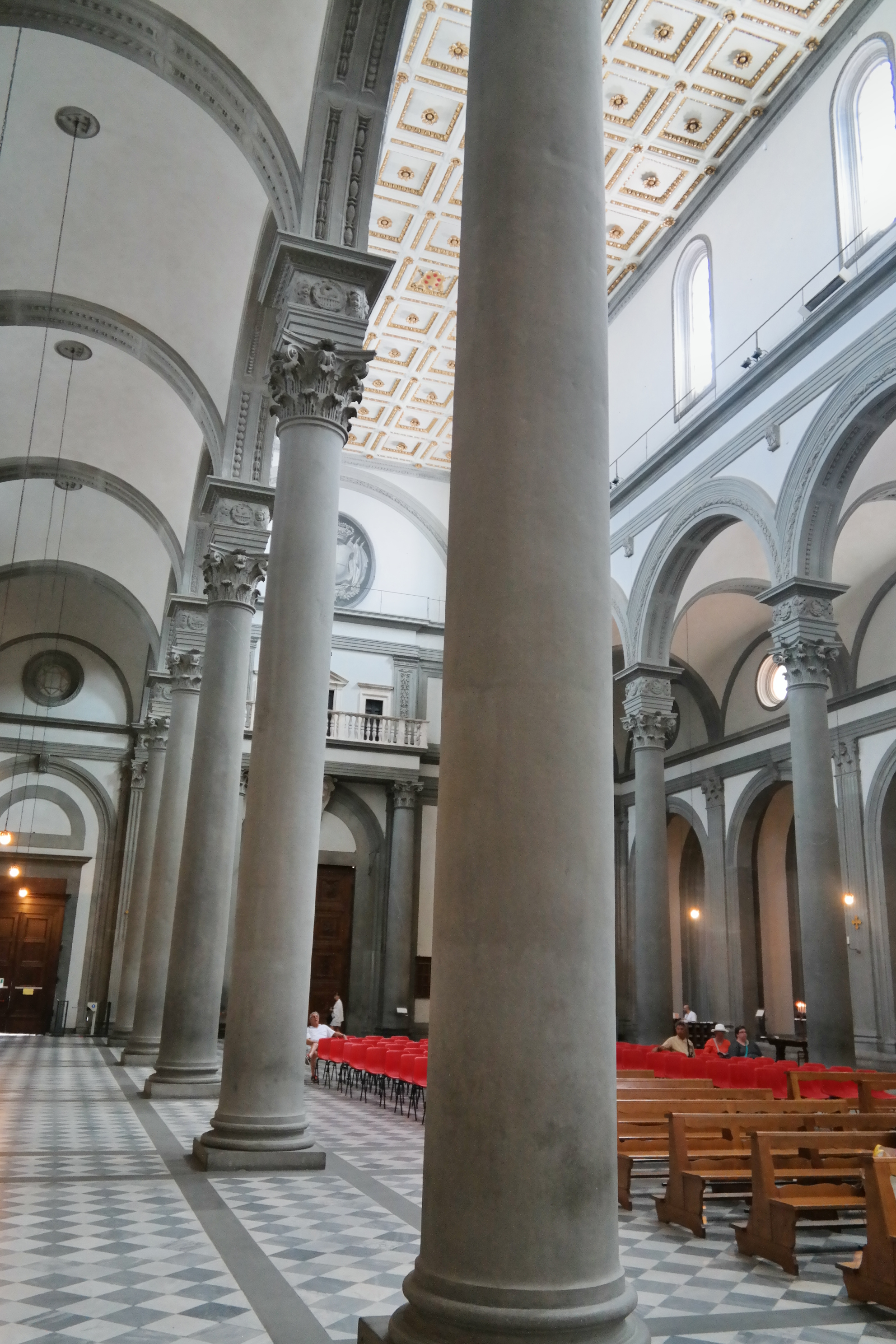 And then, finally inside the actual church, which is attached to all of these chapels and libraries…the Church of San Lorenzo, started the 15th century was designed (n part) by Brunellschi. This is a true Renaissance church. You will notice the clean, ordered precise approach to the architecture…no gothic, arched windows or stained glass…rather a clarity and light-filled church with a pure, corinthian-columned nave.
