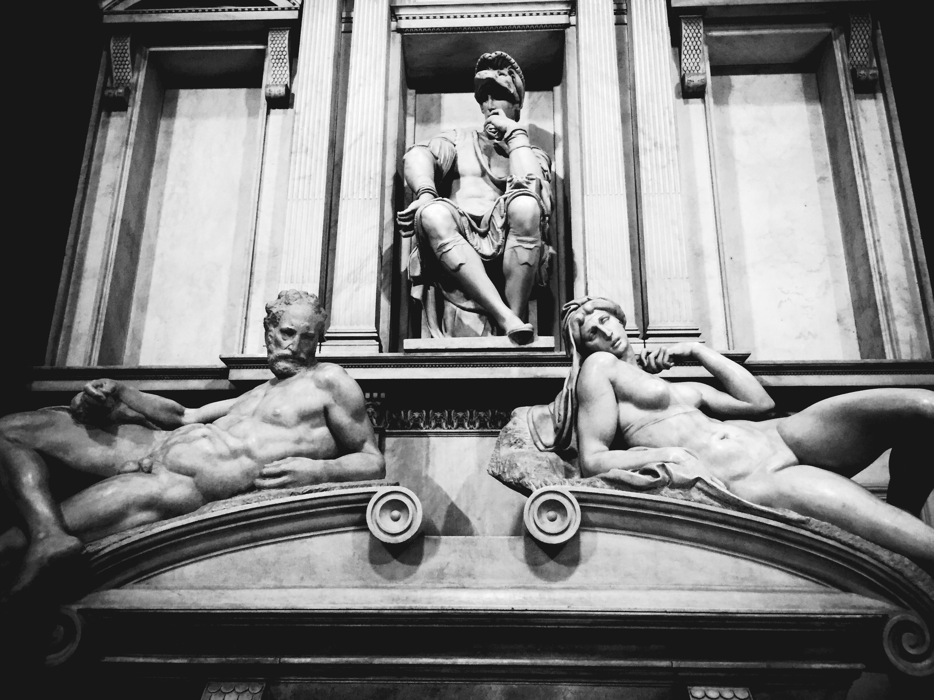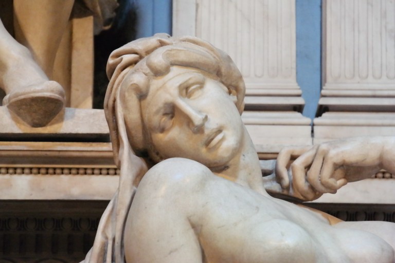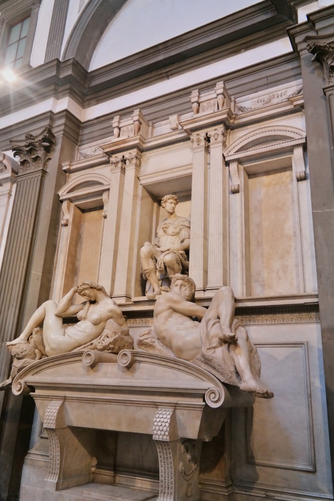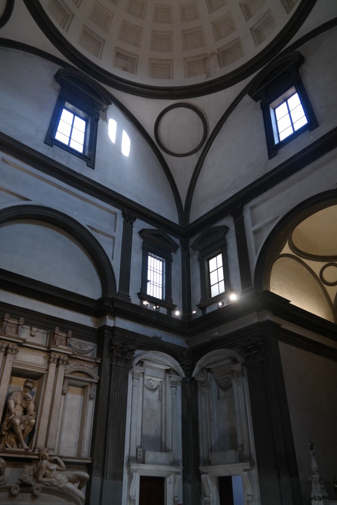 Next on the agenda was the Medici Chapels which are part of the Church of San Lorenzo. It’s a very complex story, but basically, in the early 1500’s, the Medici family decided to build some family mausoleums at the San Lorenzo church–the church the Medici family considered “their” church and close to their Palace. They hired Michelangelo to design the New Sacristy space and complete sculptures for the sarcophagi. He never actually completed what we was hired to do…but what he did complete was magnificent.