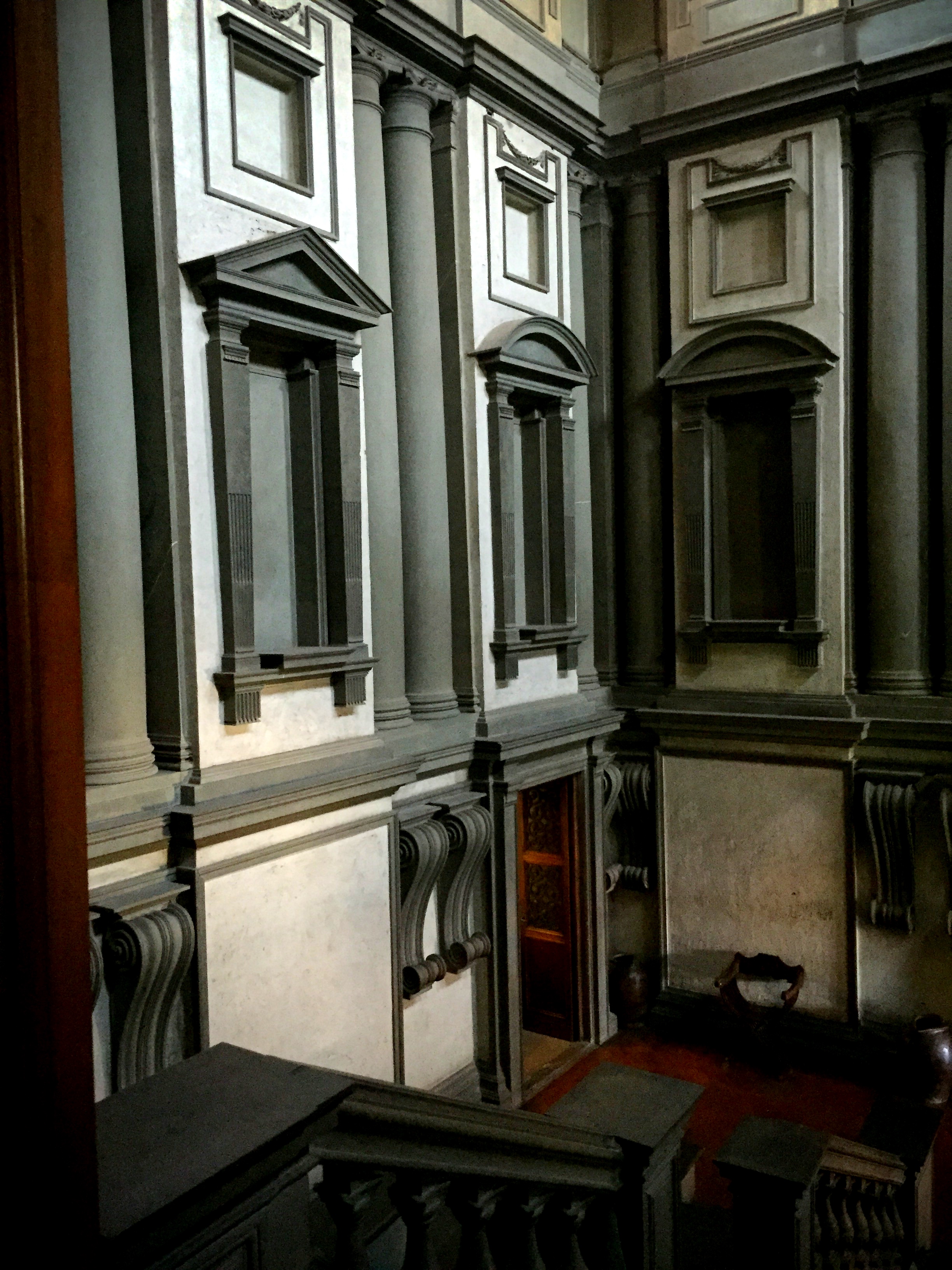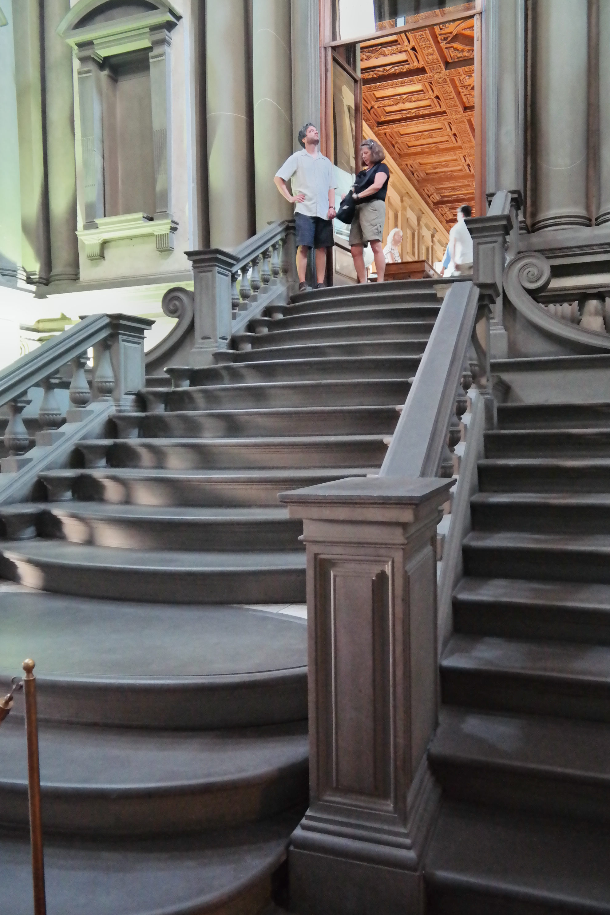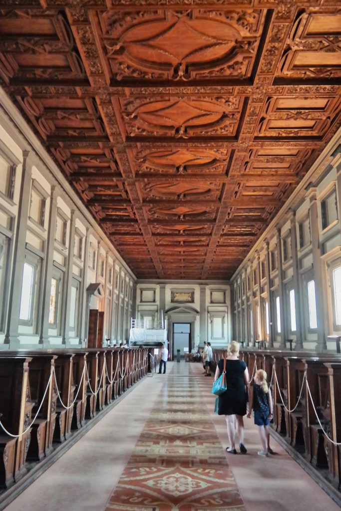 Before we left the San Lorenzo complex, we had to see inside the church and visit the famous Laurentian Library. The design was conceived by Michaelangelo…but in the end, it was his pupils that had to carry out the construction…receiving verbal and written instructions from the temperamental genius who was back in Rome. The famous vestibule with its dramatic stairs are a highlight. But in the reading room…you see how the Medici family wanted to show that they were not only super wealthy…but part of intelligent society. The library contains over 11,000 manuscripts and 4500 early printed books.