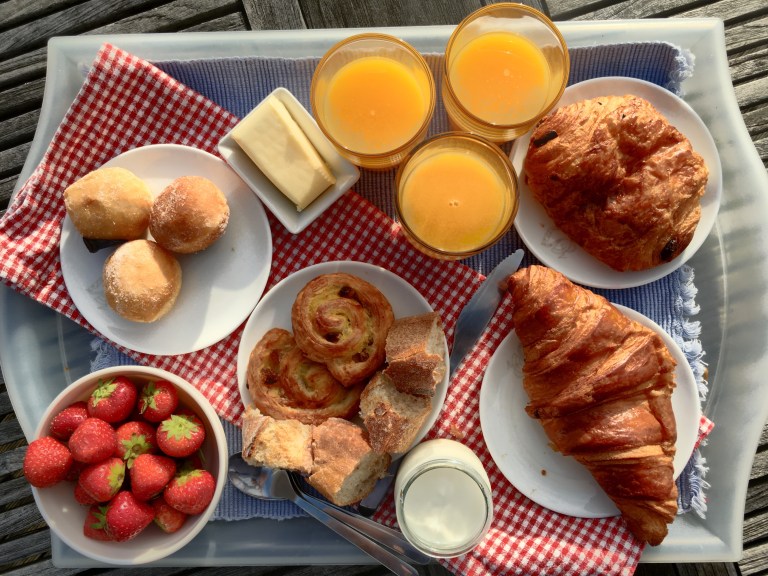 After delighting in the nice weather, I ran down to the boulangerie and got the usual, and after finally waking up the youngest of our Trio, we were able to enjoy breakfast up on the roof overlooking the City as it came to life.  New York has some amazing bakeries, but literally nothing compares to the pastries in Paris. And fruit in Europe is simply better. The strawberries sold in European stores and markets are small by American standards, but they are very ripe, similar to those you would pick at a strawberry patch….and very unlike the huge, hollow, tasteless ones we get at our stores. You will taste a strawberry or a raspberry as it is supposed to taste.