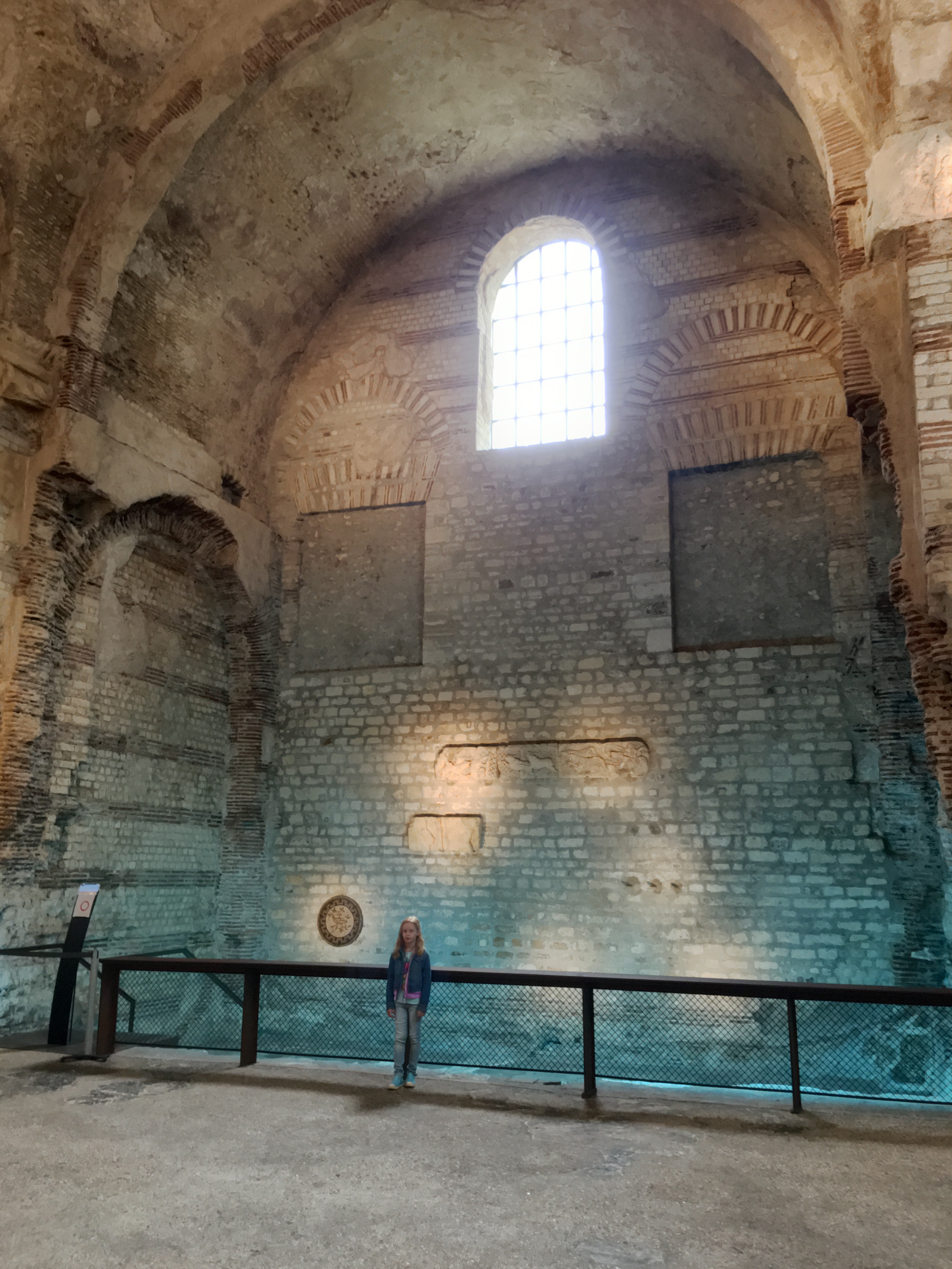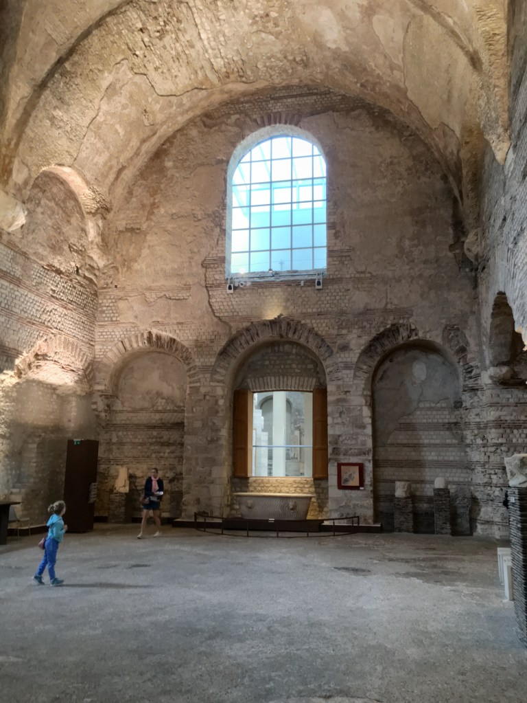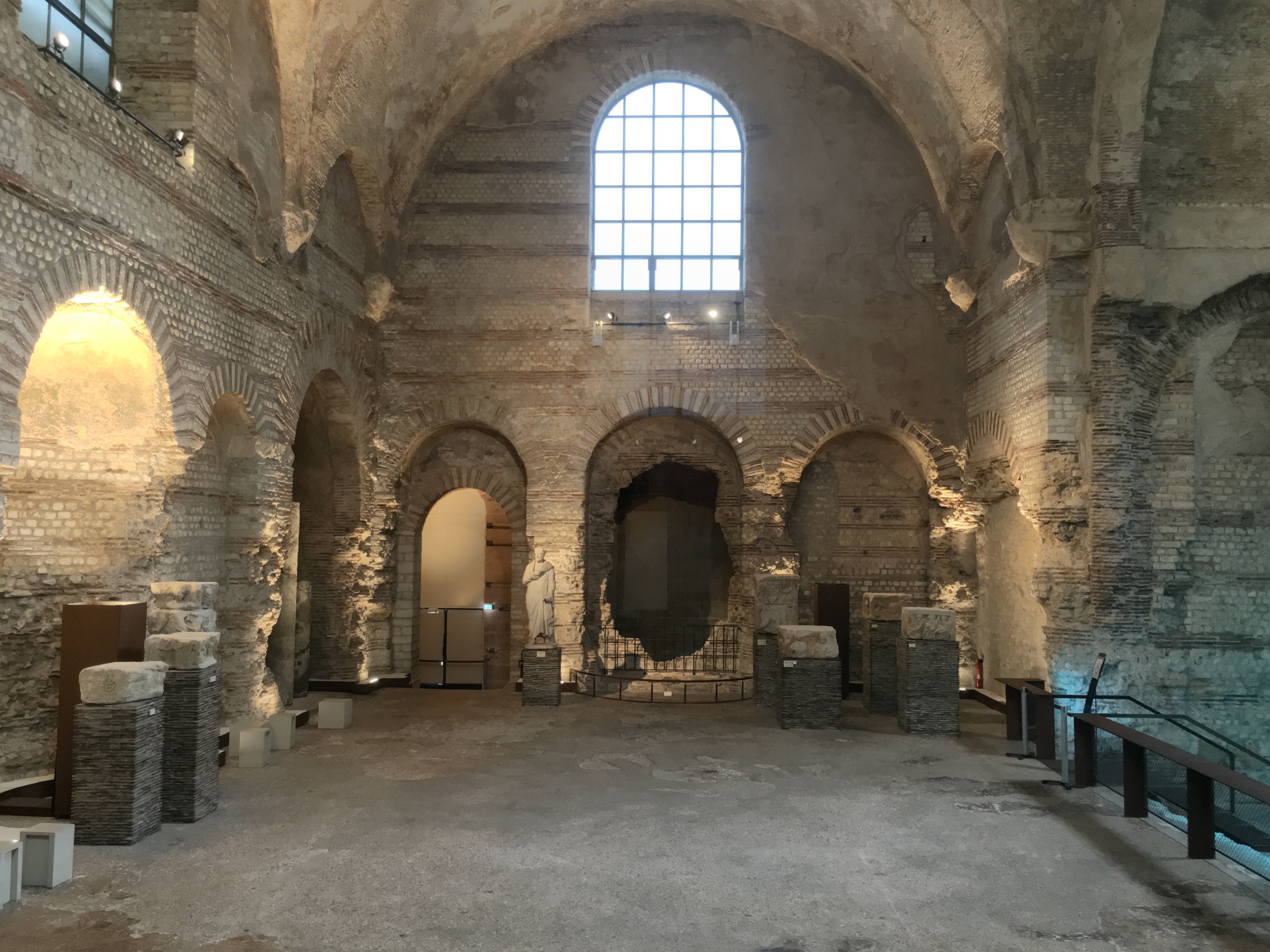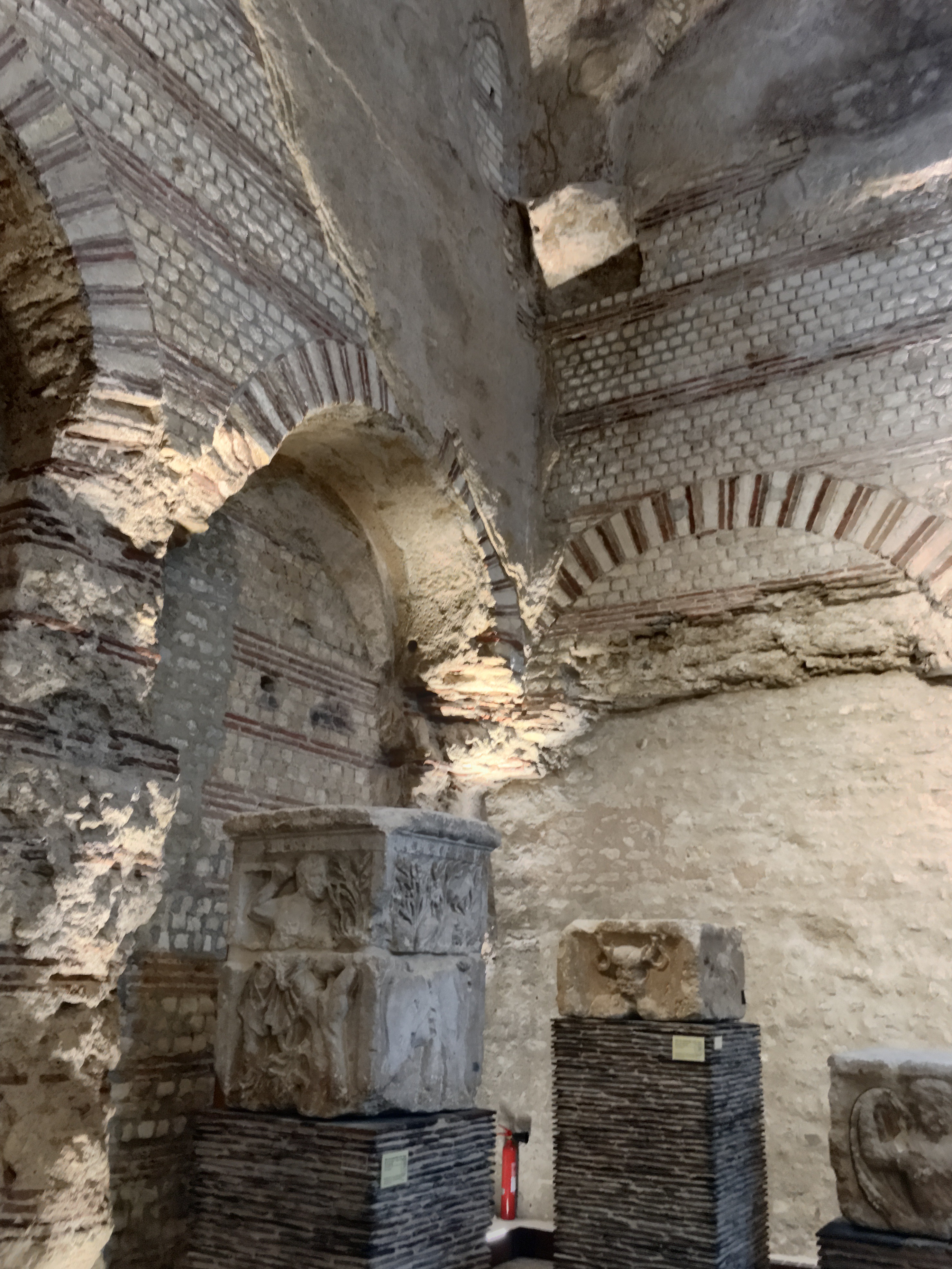 I don’t know enough details about the former Roman Baths from the 3rd century A.D., but you can see the remnants of the Roman facility and actually walk thru the frigidarium. It is vast and has a distinctive mineral/sulfur smell (one that we actually noticed when we were in the Roman Baths in England and at Roman ruins in Italy last summer).