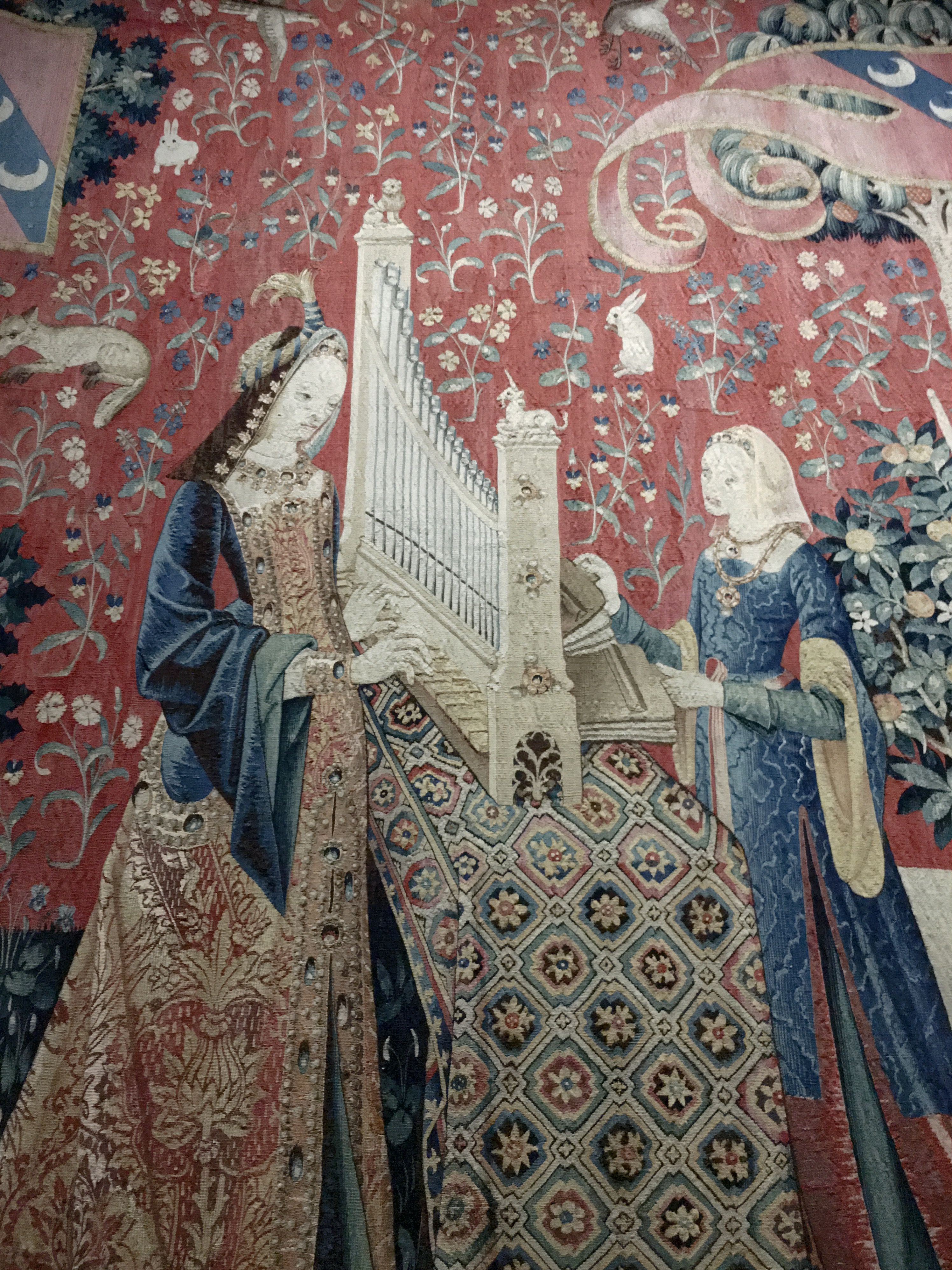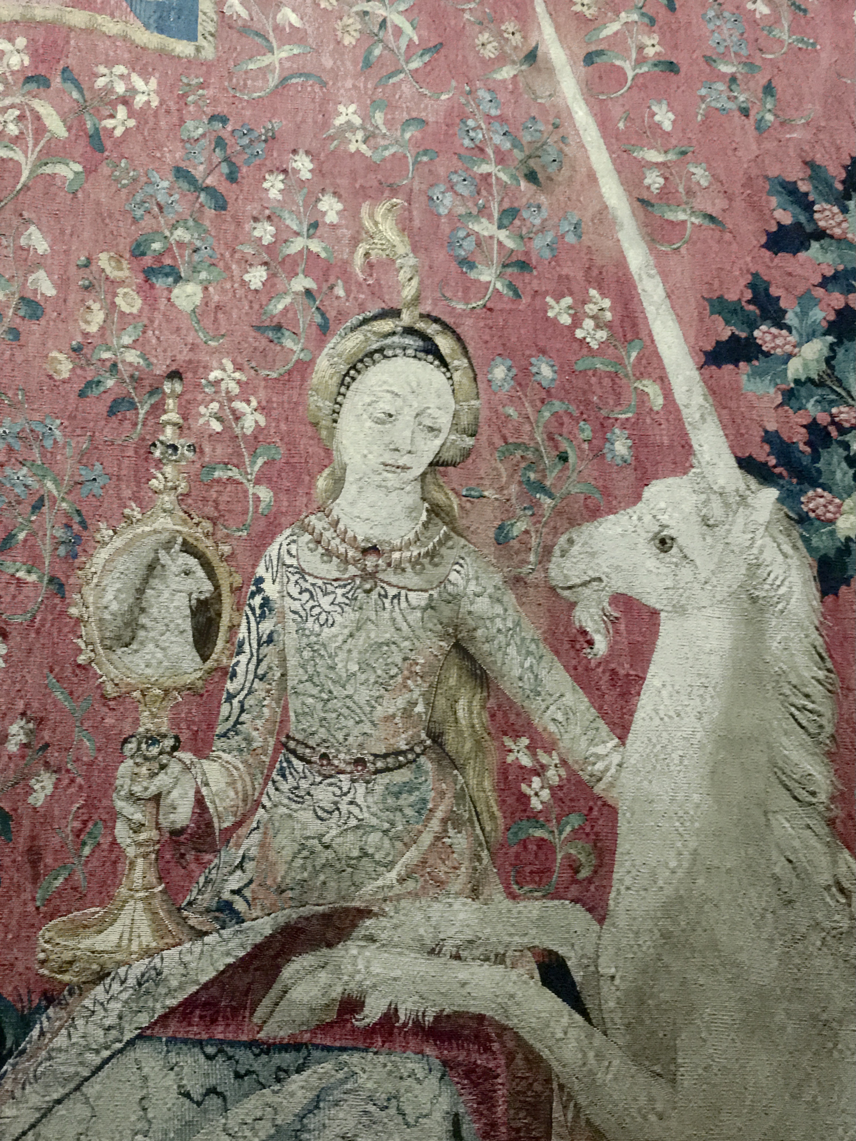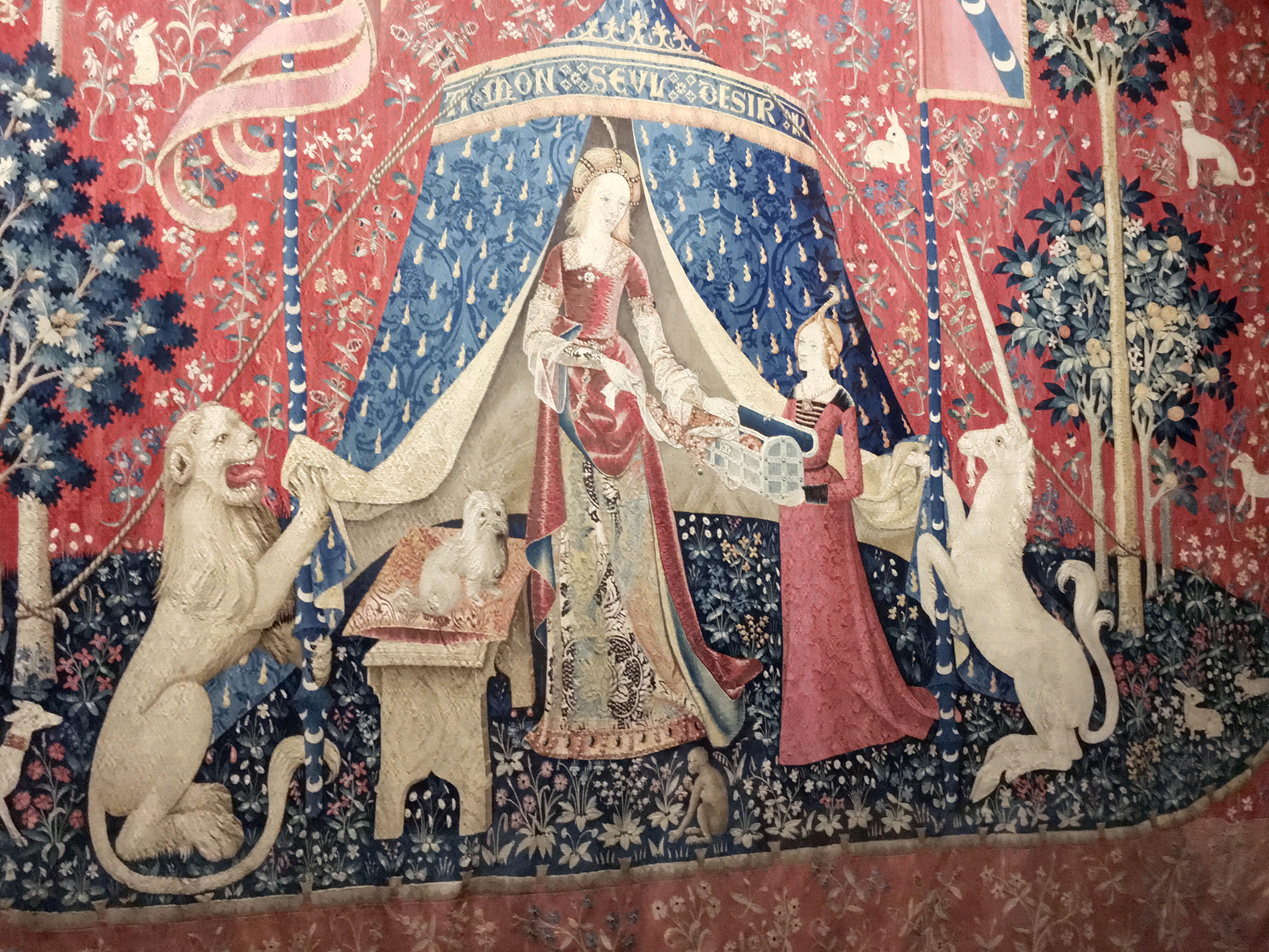 The museum is housed in a former hotel (or private mansion) built for an abbot of Cluny around 1585-ish (actually, the building is a century older than that, but it was gutted and remodeled in the late 1500’s). Much of the charm of the museum is the building itself.  They have an amazing collection of medieval artifacts from Paris (and France in general), most notably home to the “Lady and The Unicorn” tapestries, created in about 1500.  No one knows for sure what the series of tapestries is about….probably the senses (touch, taste, smell, etc.) but everyone agrees that in sheer size, detail, and vibrant color, they are a marvelous medieval artifact.