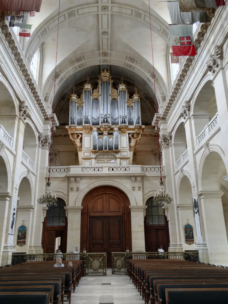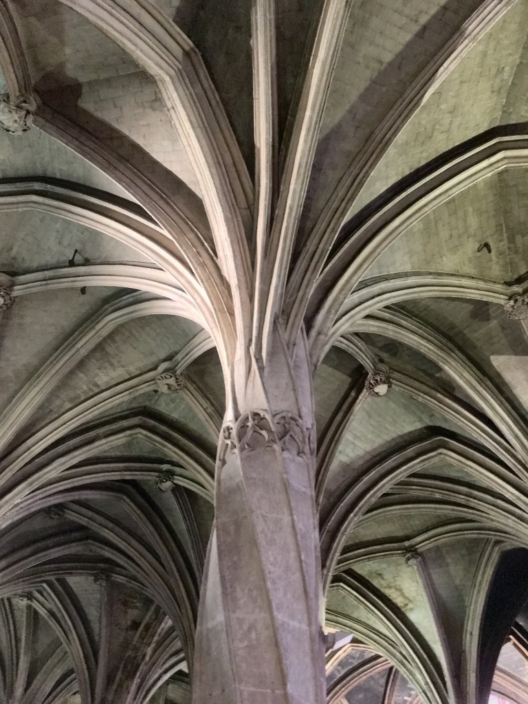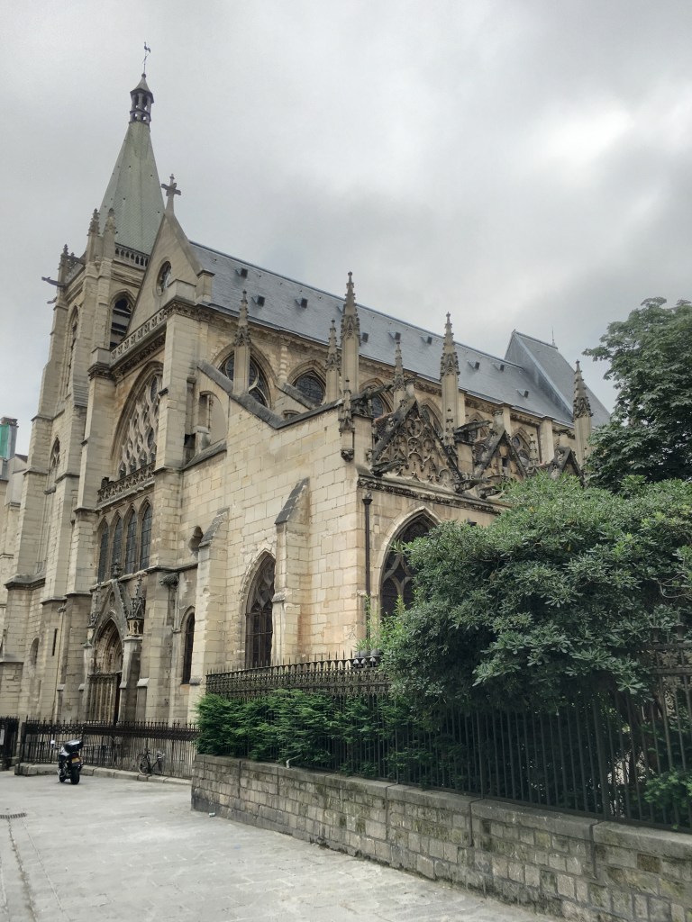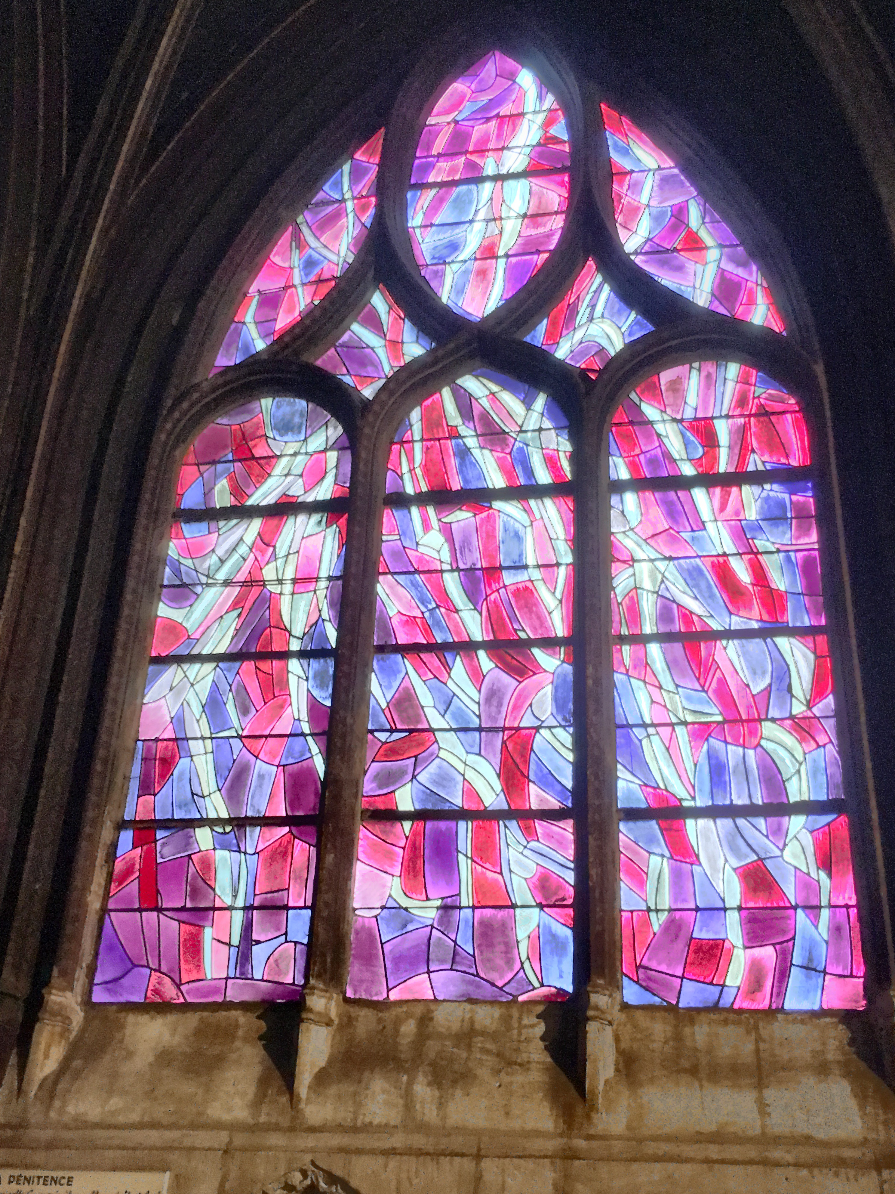 Just around the block was our next stop for the day, the  Church of Saint-Séverin, the oldest church on the Left Bank, begun in the 1200’s.  It’s a lovely church, after a visit, is not in my top 20 in Europe that we’ve visited thus far. Most interesting to me was the odd, palm tree-like column found at the rear of the church and the modern, 1970’s stained glass windows by Jean René Bazaine representing the sacraments.
