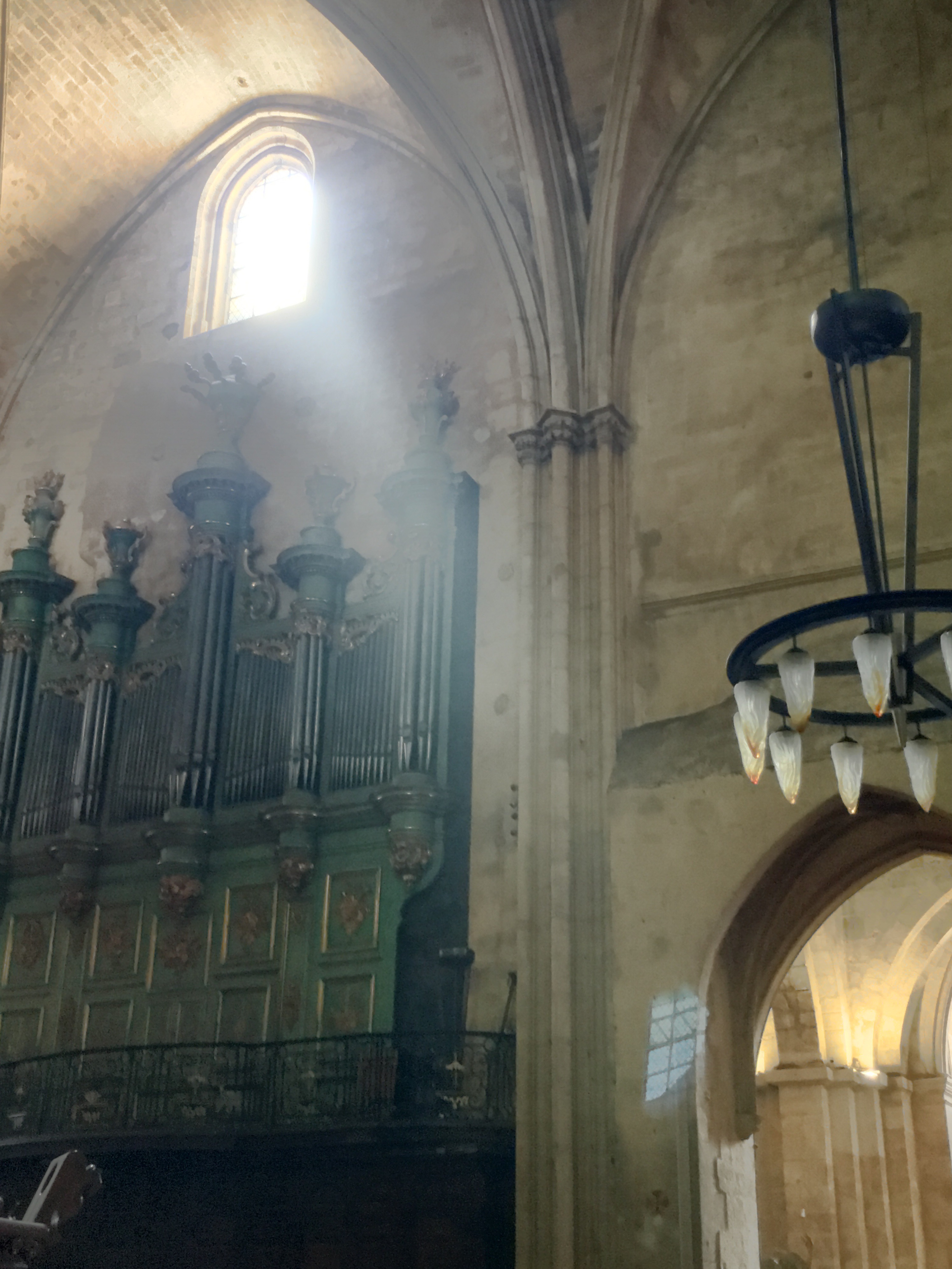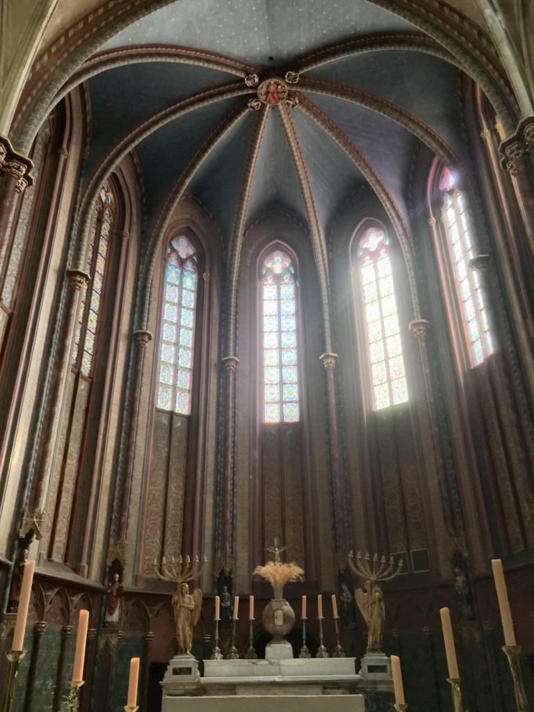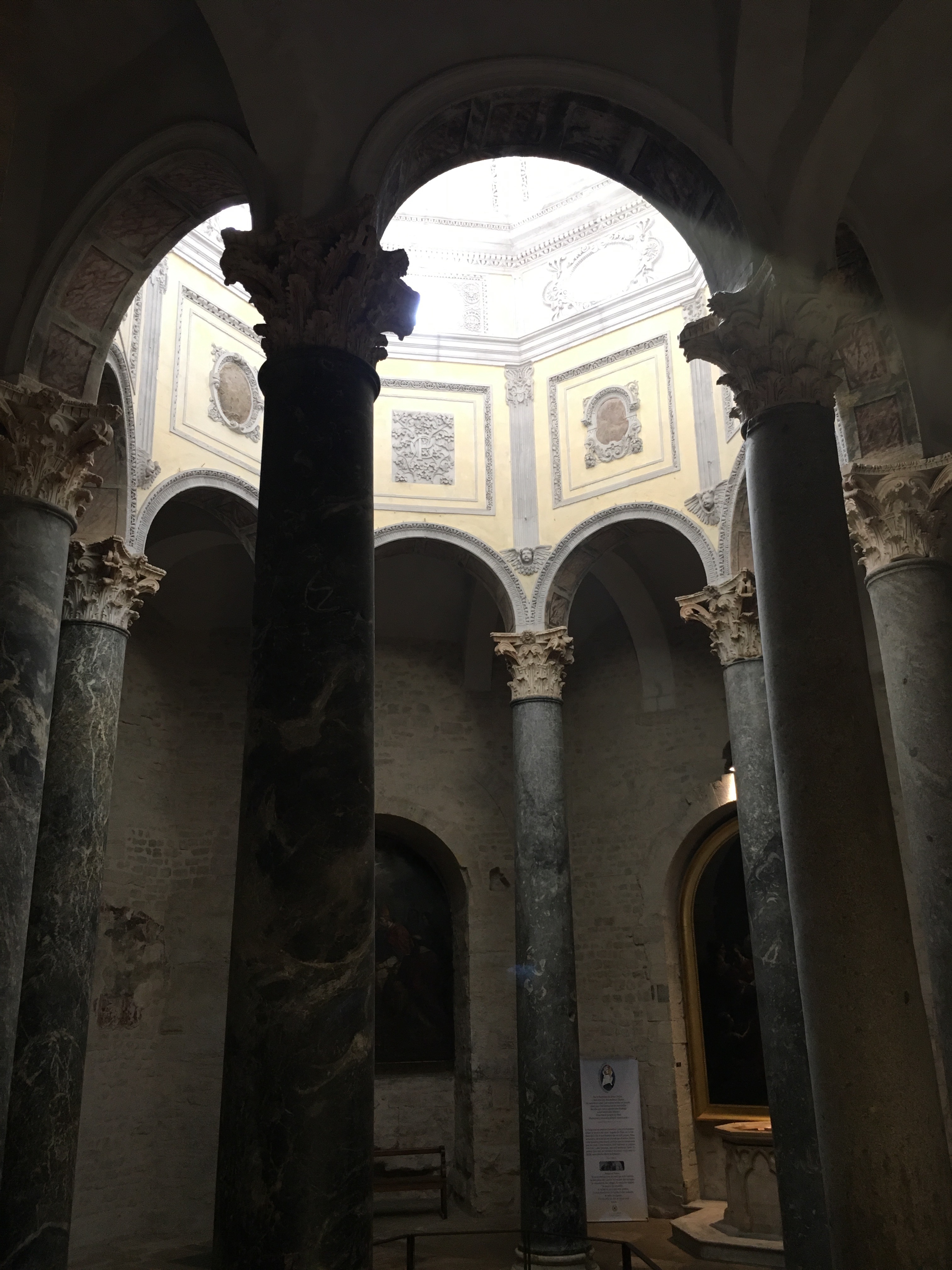 One of the first buildings we came upon was the Cathédrale Saint-Sauveur d’Aix-en-Provence, or the Aix Cathedral of the Holy Savior.  I didn’t know anything about the Cathedral until after our visit, when I had a chance to read some information about it.  It has a pretty fascinating history that dates back to the year 500 A.D. when the Baptistery was constructed on top of an old Roman Forum (but they used the Roman era Corinthian columns in the Baptistery design).   The remainder of the church, including the bell tower, was constructed in the 12th century right up thru the 1400’s, with pauses during the Black Death and the Hundred Year’s War.  In hindsight, you can definitely see the distinct styles in the church…areas with more Romanesque arches and columns, and then the more graceful gothic additions, and even touches of the Renaissance, such as the dome in the Baptistery.