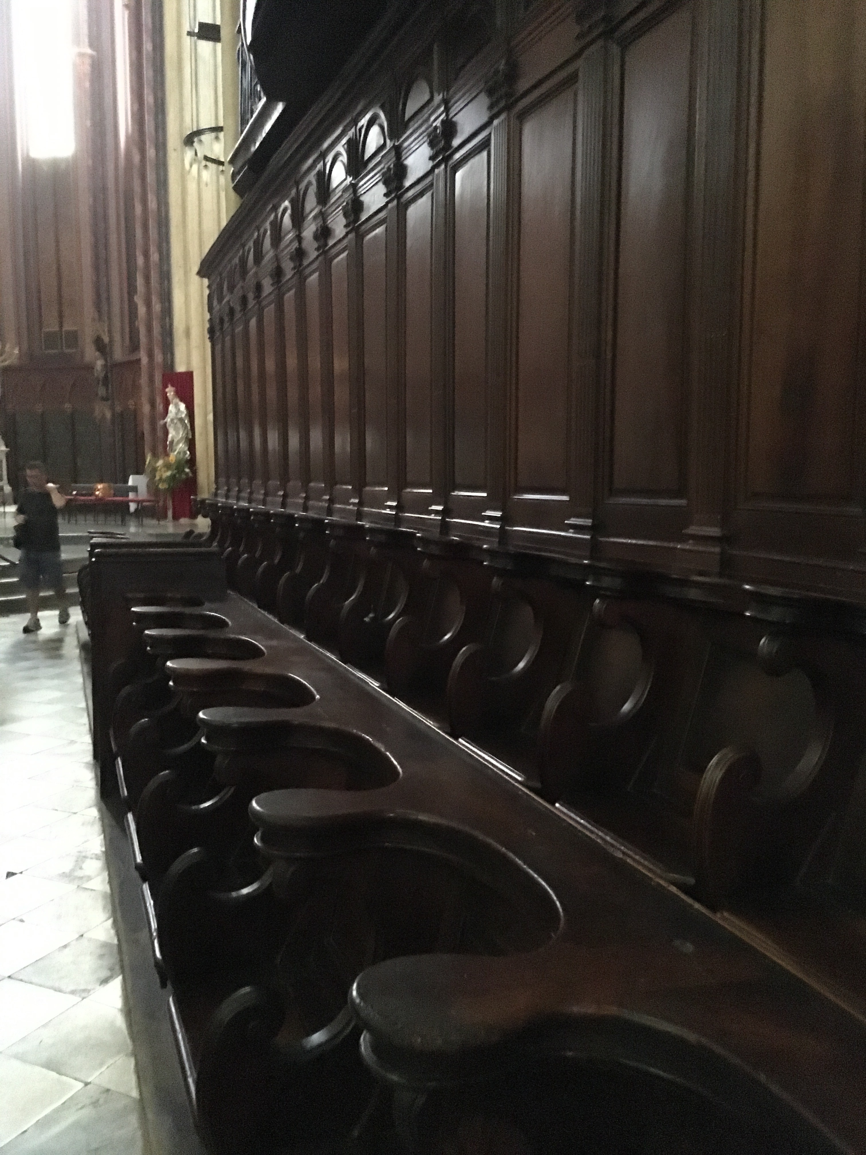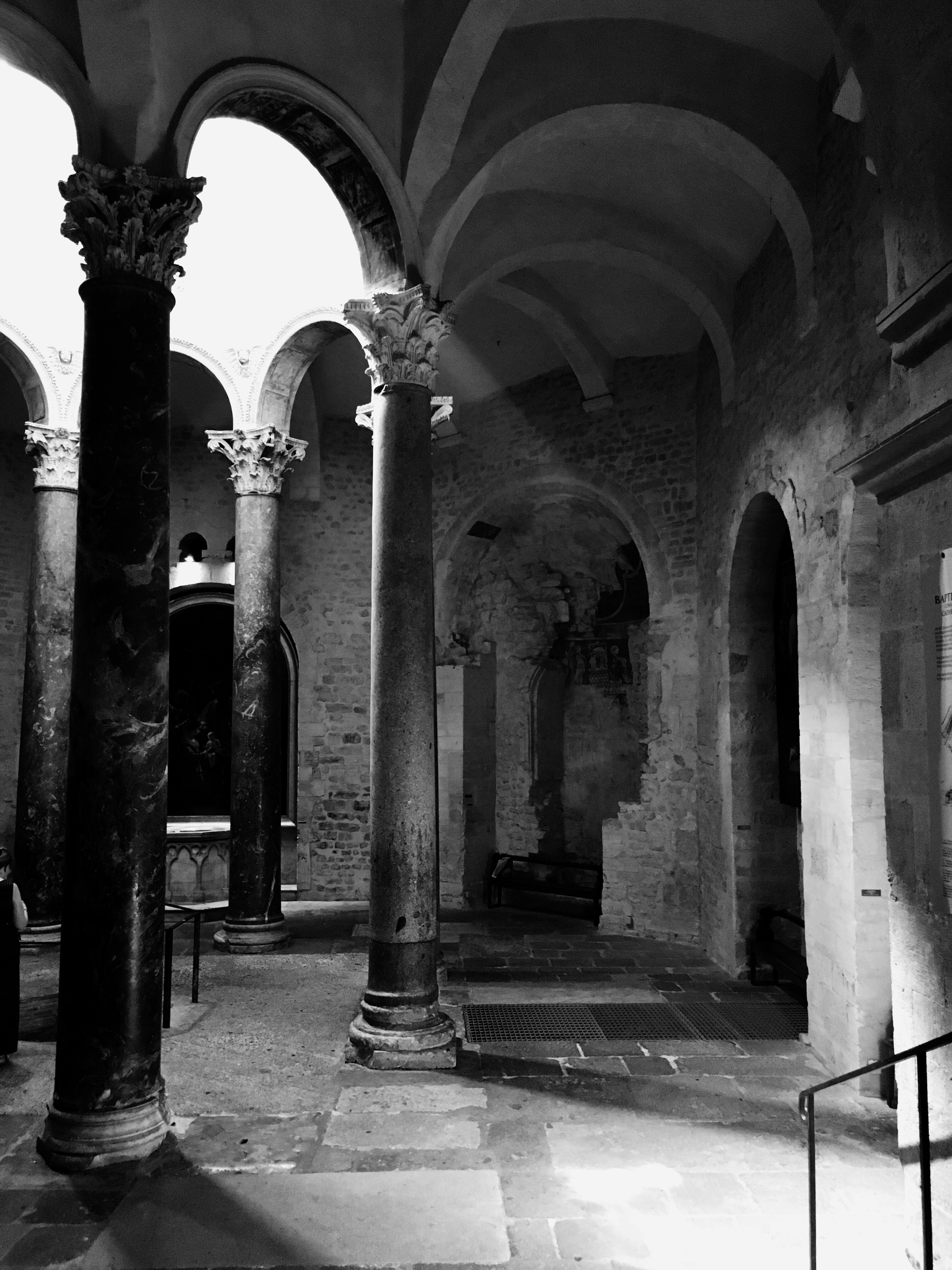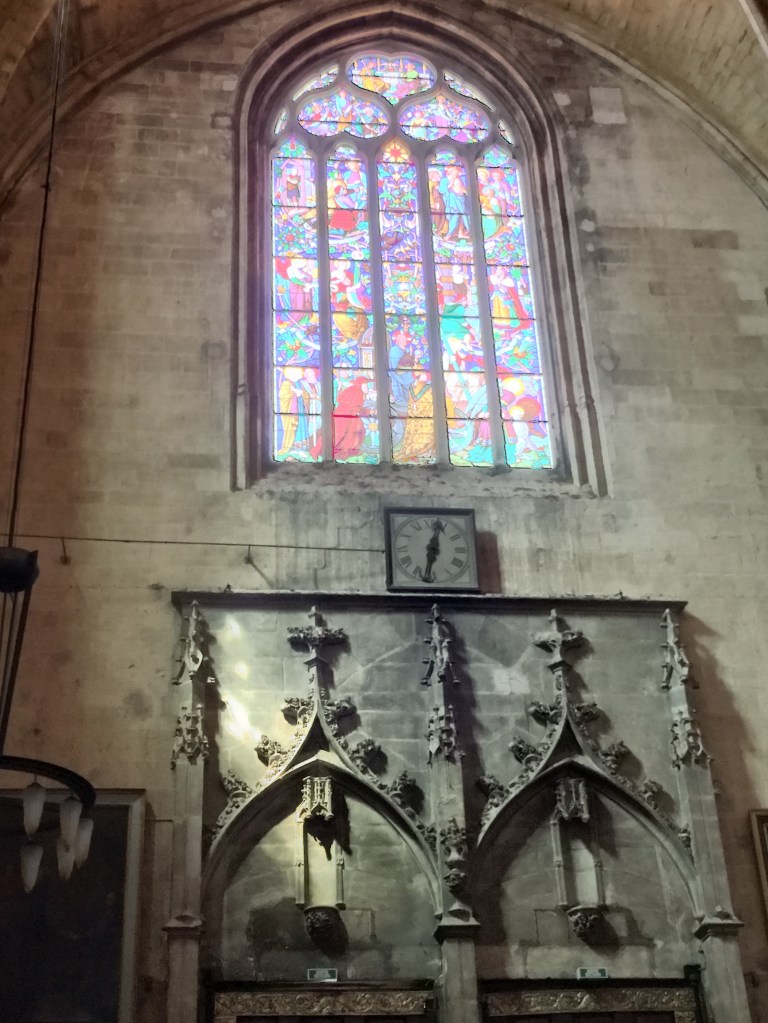 One of the first buildings we came upon was the Cathédrale Saint-Sauveur d’Aix-en-Provence, or the Aix Cathedral of the Holy Savior.  I didn’t know anything about the Cathedral until after our visit, when I had a chance to read some information about it.  It has a pretty fascinating history that dates back to the year 500 A.D. when the Baptistery was constructed on top of an old Roman Forum (but they used the Roman era Corinthian columns in the Baptistery design).   The remainder of the church, including the bell tower, was constructed in the 12th century right up thru the 1400’s, with pauses during the Black Death and the Hundred Year’s War.  In hindsight, you can definitely see the distinct styles in the church…areas with more Romanesque arches and columns, and then the more graceful gothic additions, and even touches of the Renaissance, such as the dome in the Baptistery.