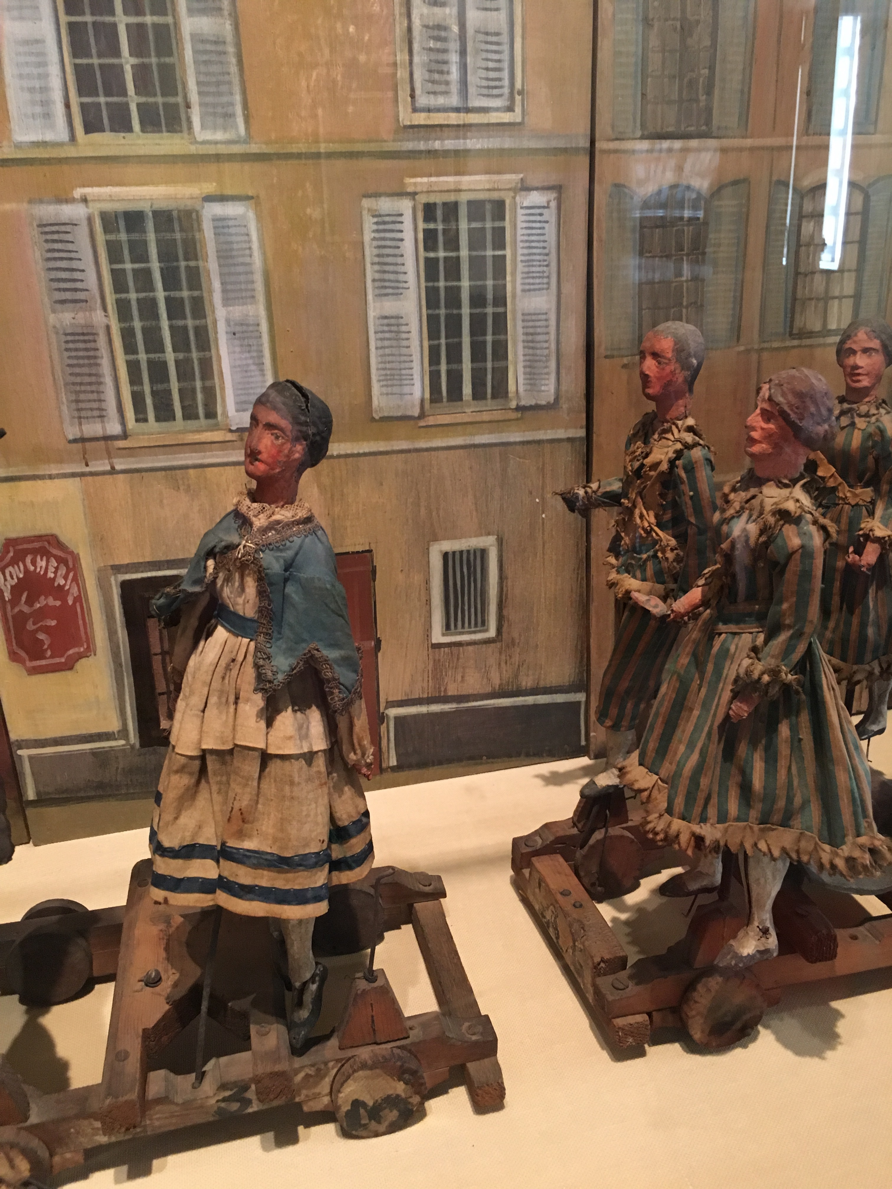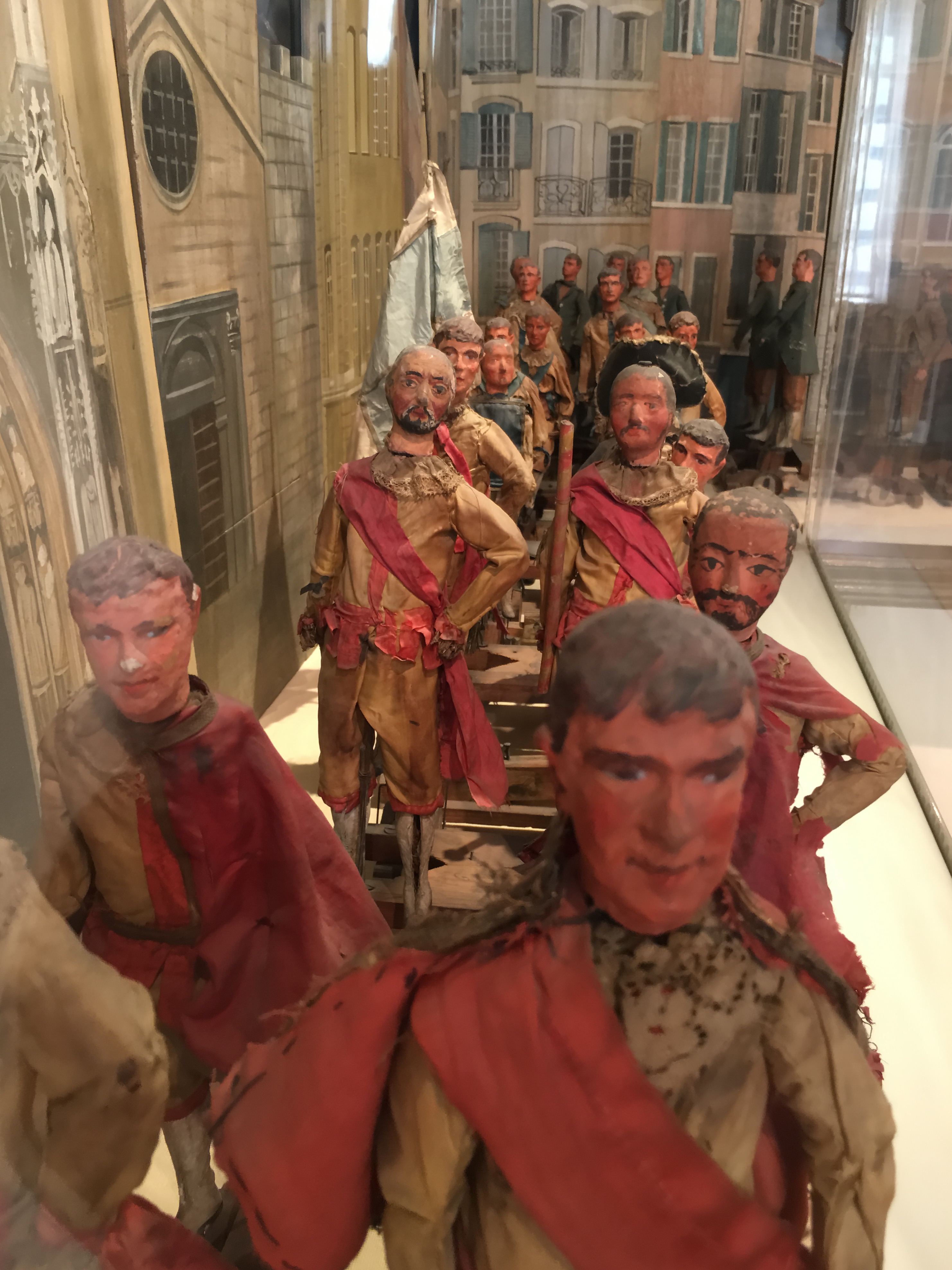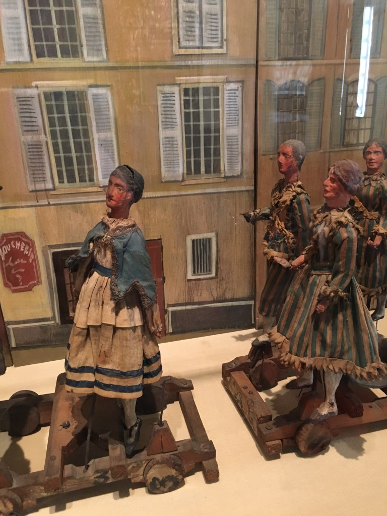 We stopped for a bite to eat (two very large “personal” pizzas that could have fed 6 people) in a shaded square and decided to visit the (free entry) Musée Estienne de Saint Jean which was just across the street.   The museum used to be called the Museum of Old Aix…and is housed in a former hotel (or townhouse).  It is quite tiny and has a rather small collection of artifacts from everyday life in Aix.  Children (including Lena) are delighted by their collection of dioramas with little dolls depicting life in 17th century Aix.  They also have a collection of puppets used for an annual Fete (party) held in Aix.