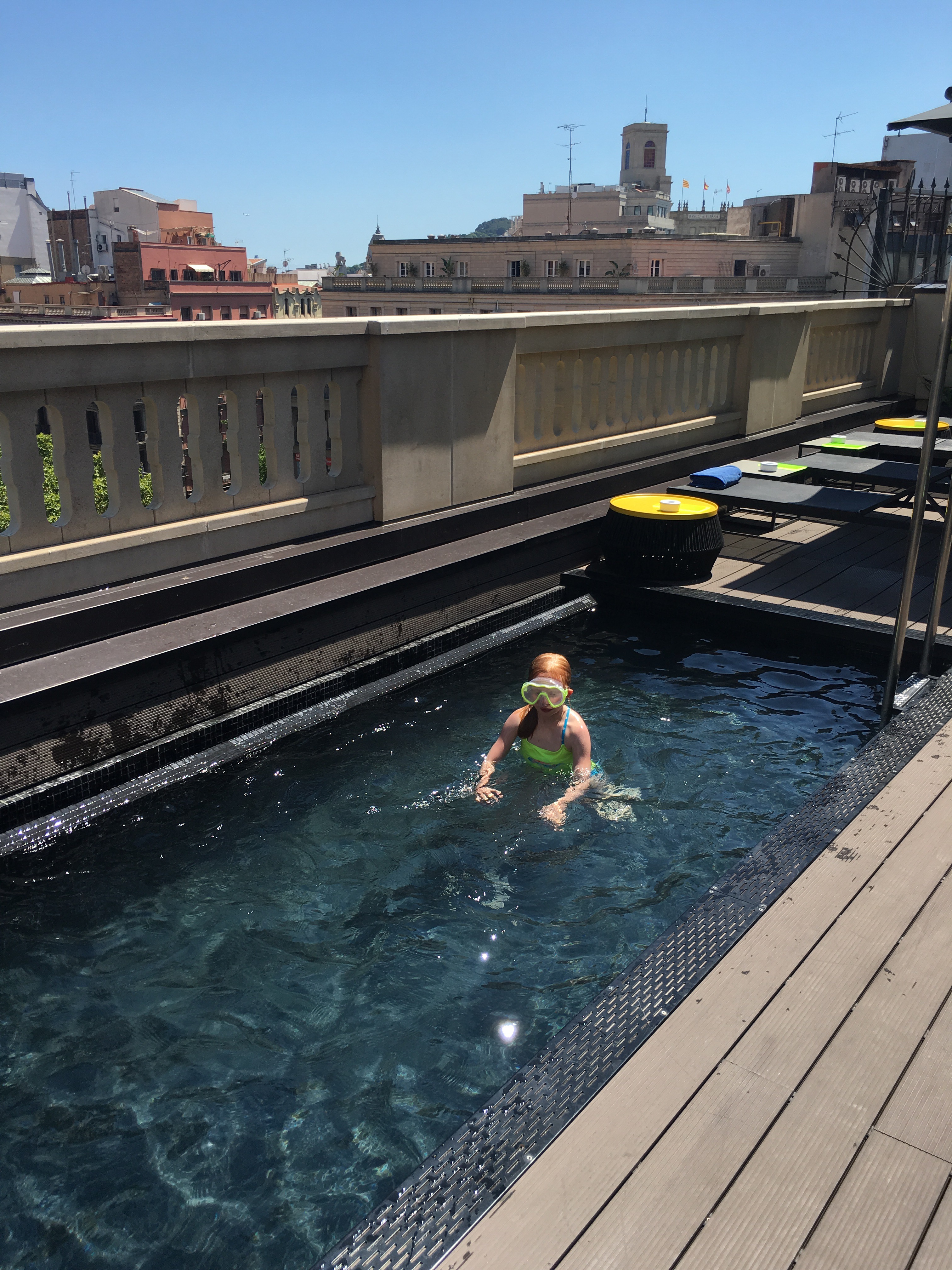 Our hotel is really quite beautiful….a very stunning atrium-like lobby, cool and chic color schemes, friendly staff, and our room on the 5th floor is bright and well-appointed. Lena allowed little time before she wanted to swim in the (very tiny) plunge pool on the roof of the hotel.