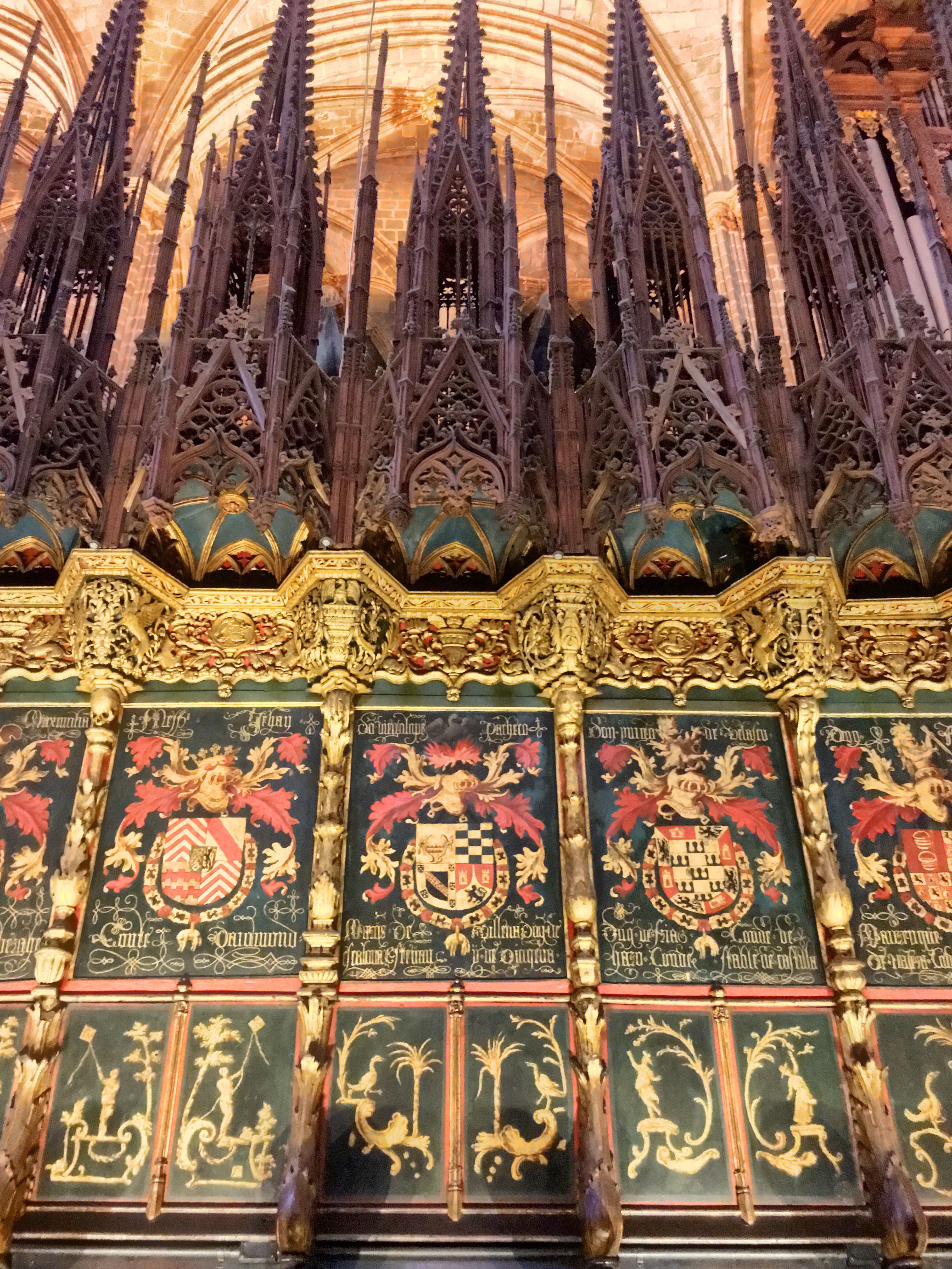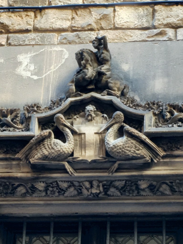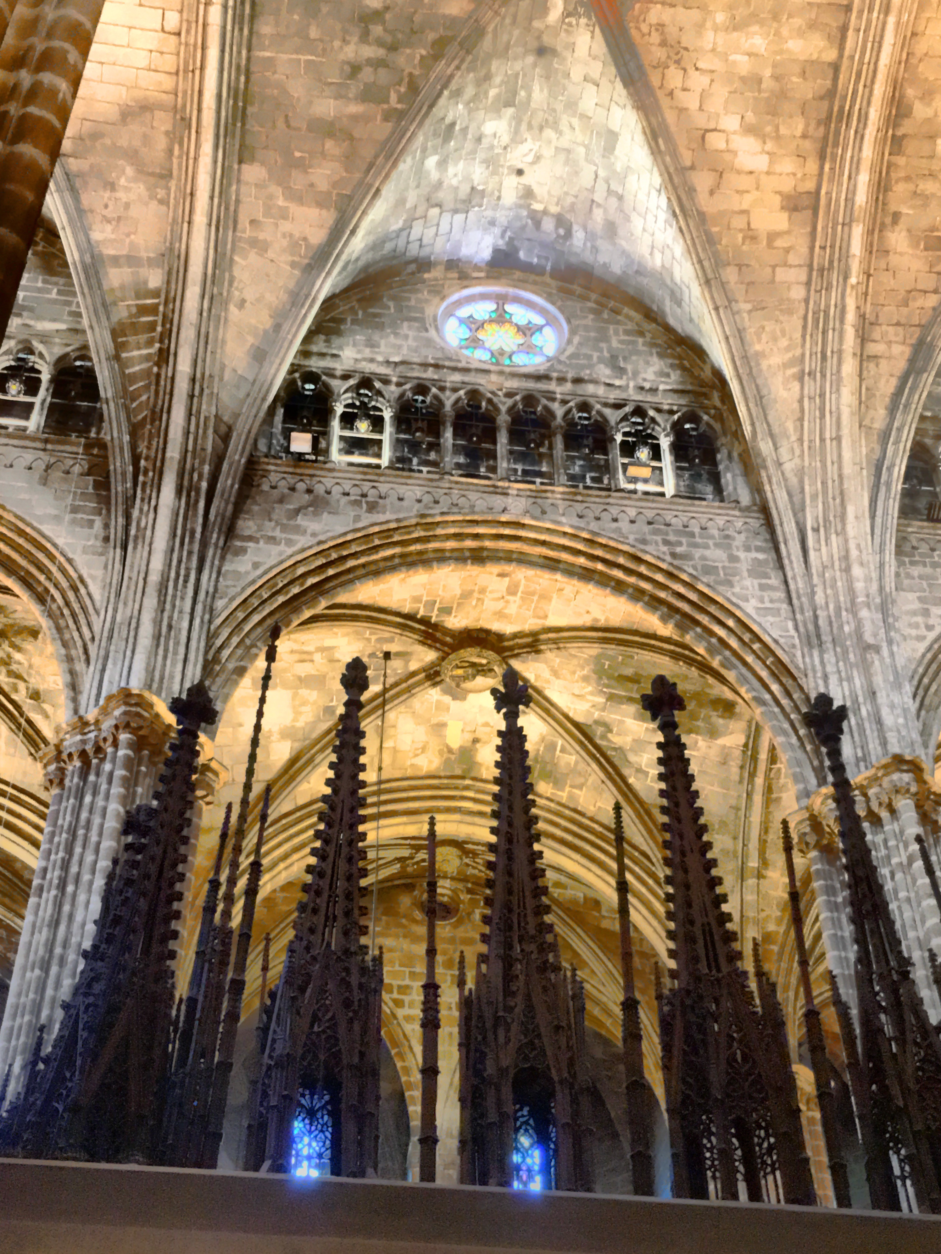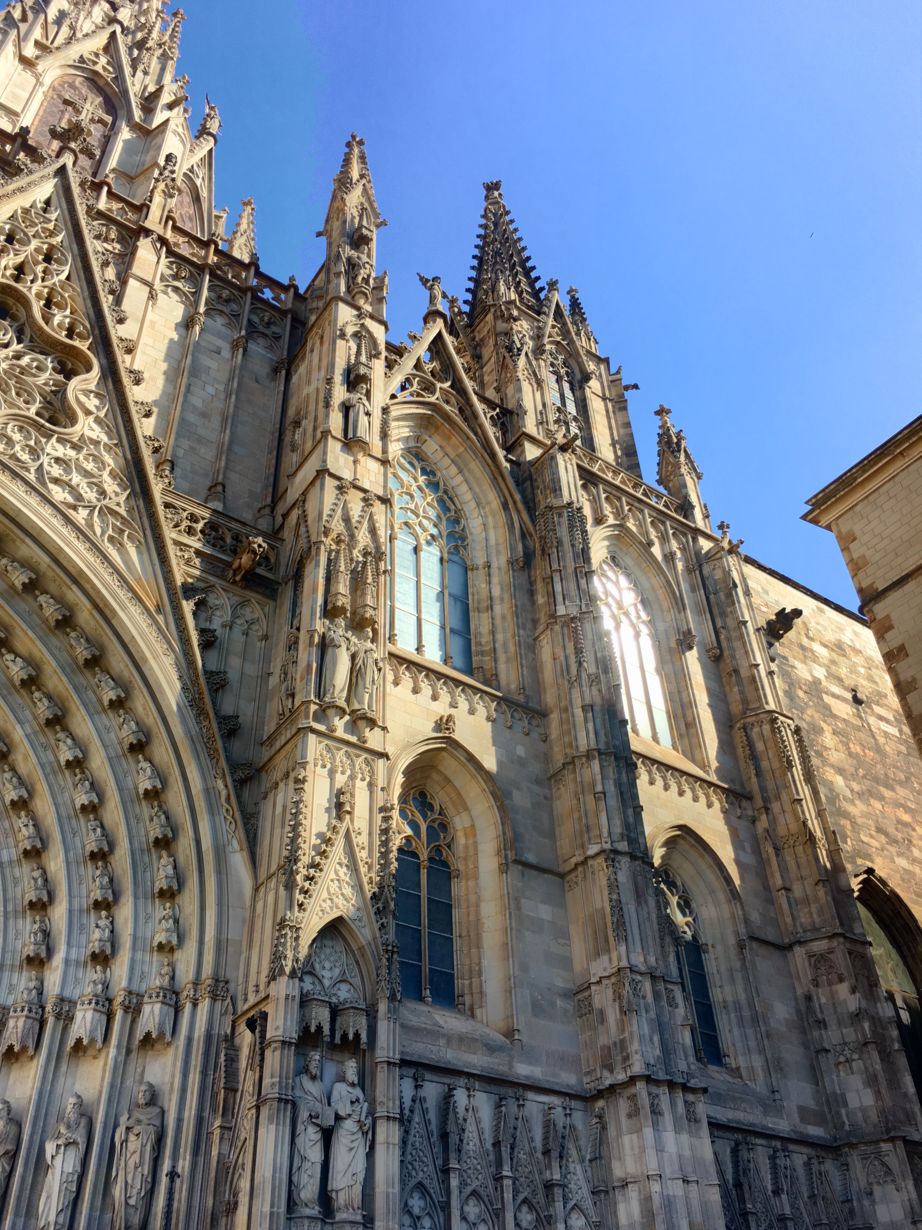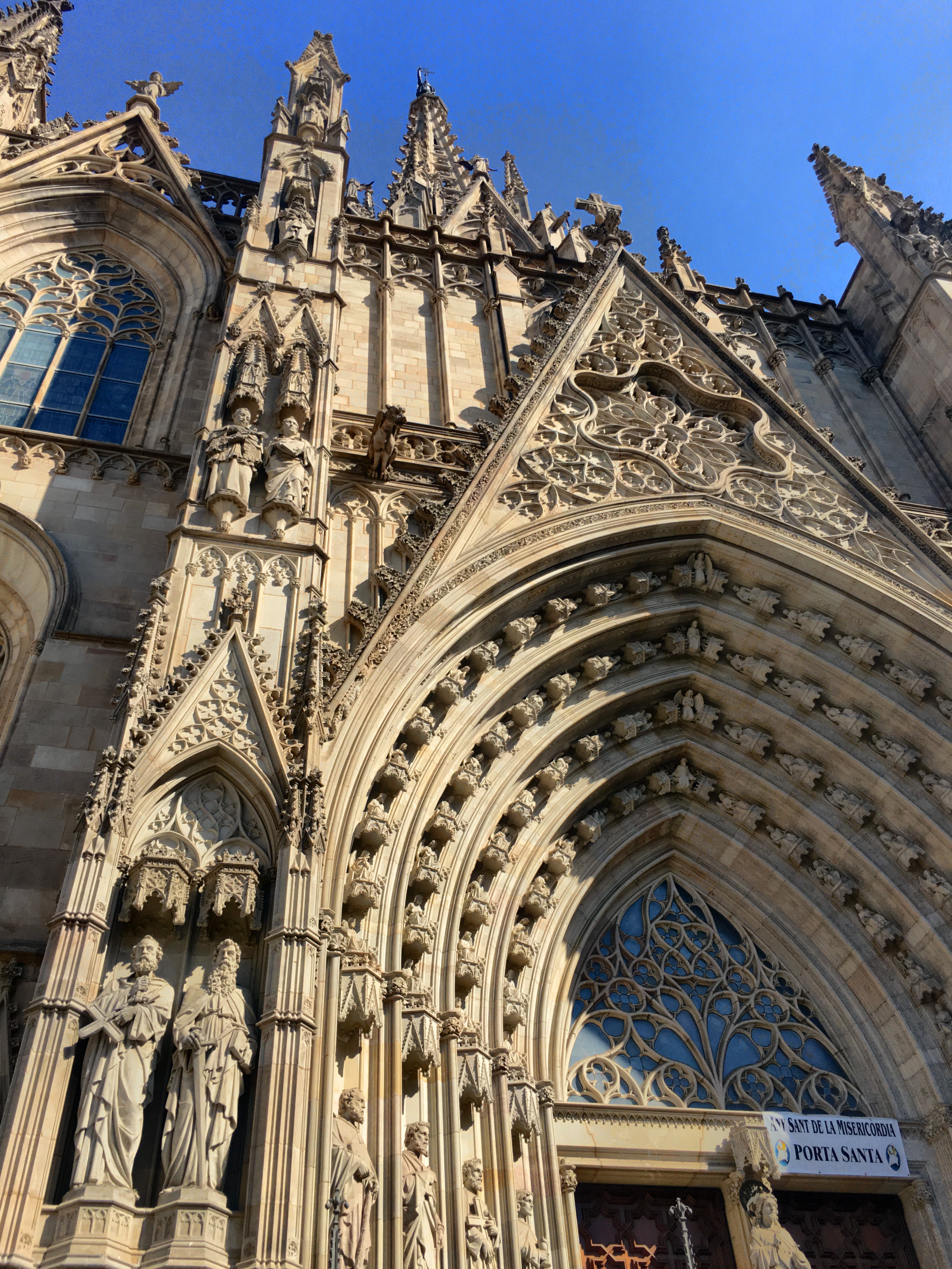 One of the first squares we can upon housed the beautiful Cathedral of Barcelona. Unlike the soaring, vertical cathedrals of France that we’ve visited, this cathedral is a bit more squat and like an ornamented block. No flying buttresses or dramatic structural side supports. However, very gothic ornamentation on the facade and towers richly decorated. The core cathedral was built around 1300 and construction continued on for centuries.