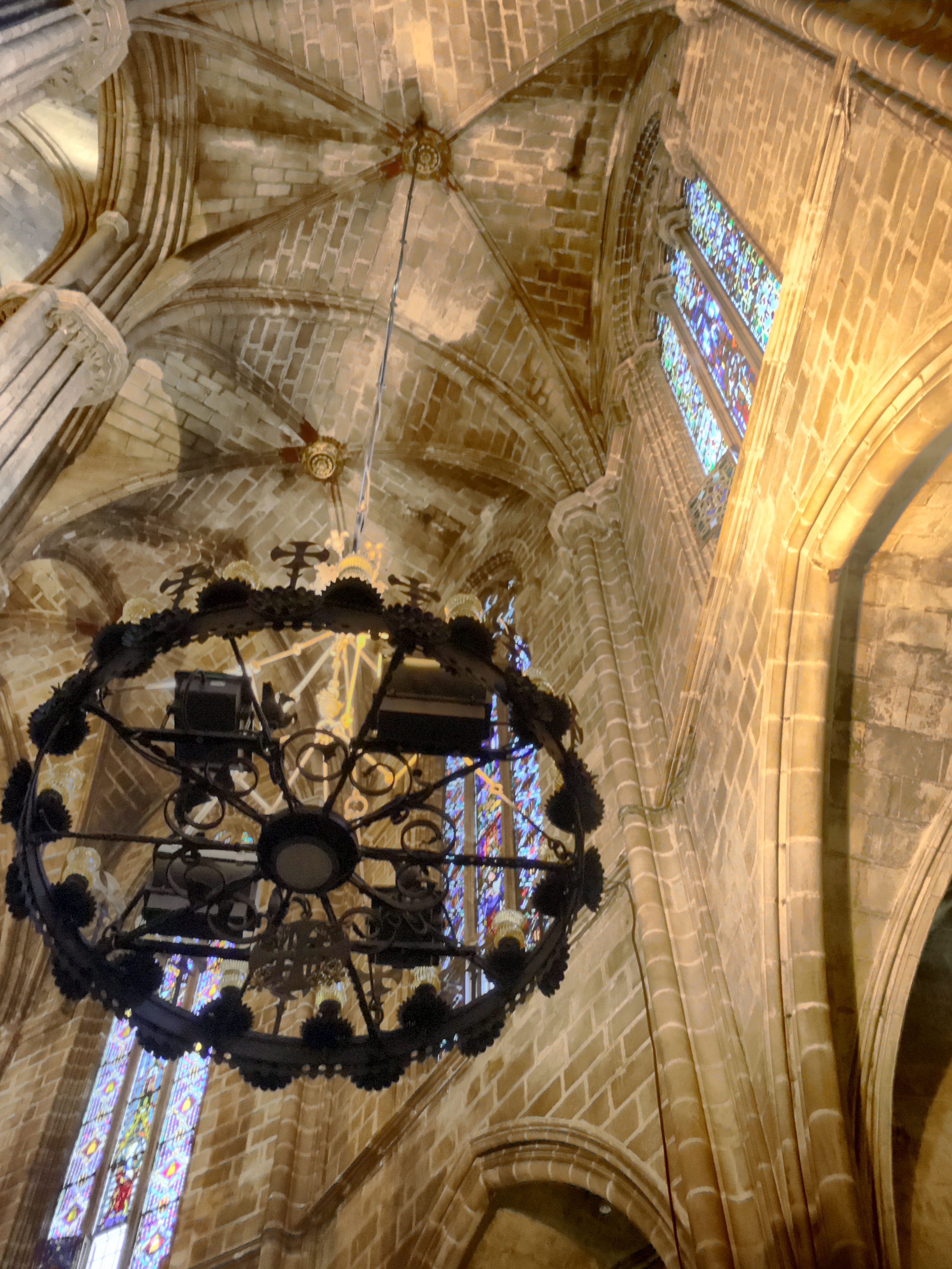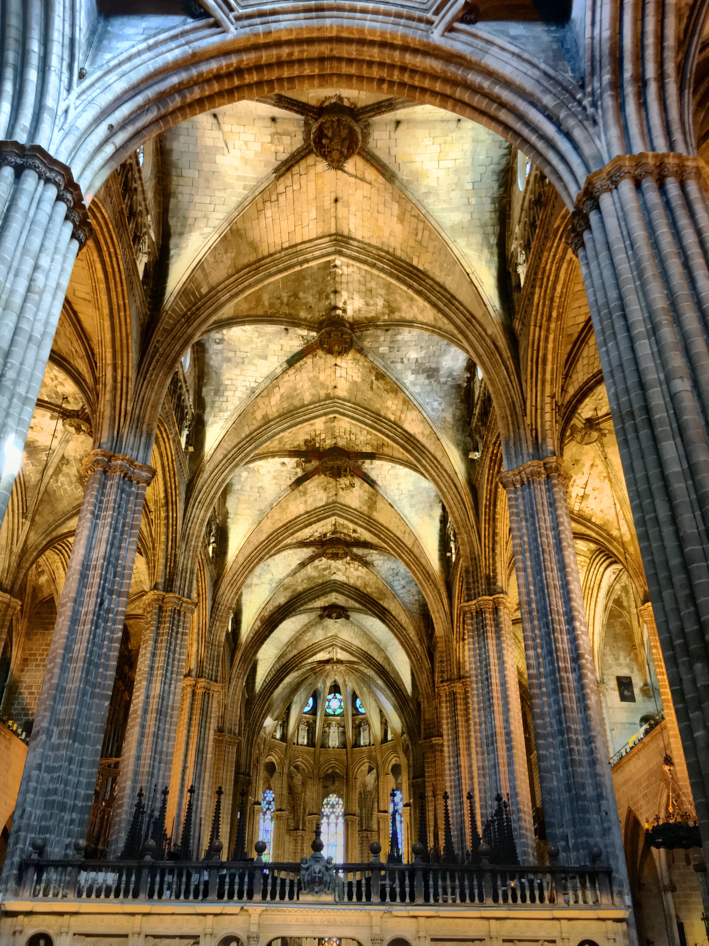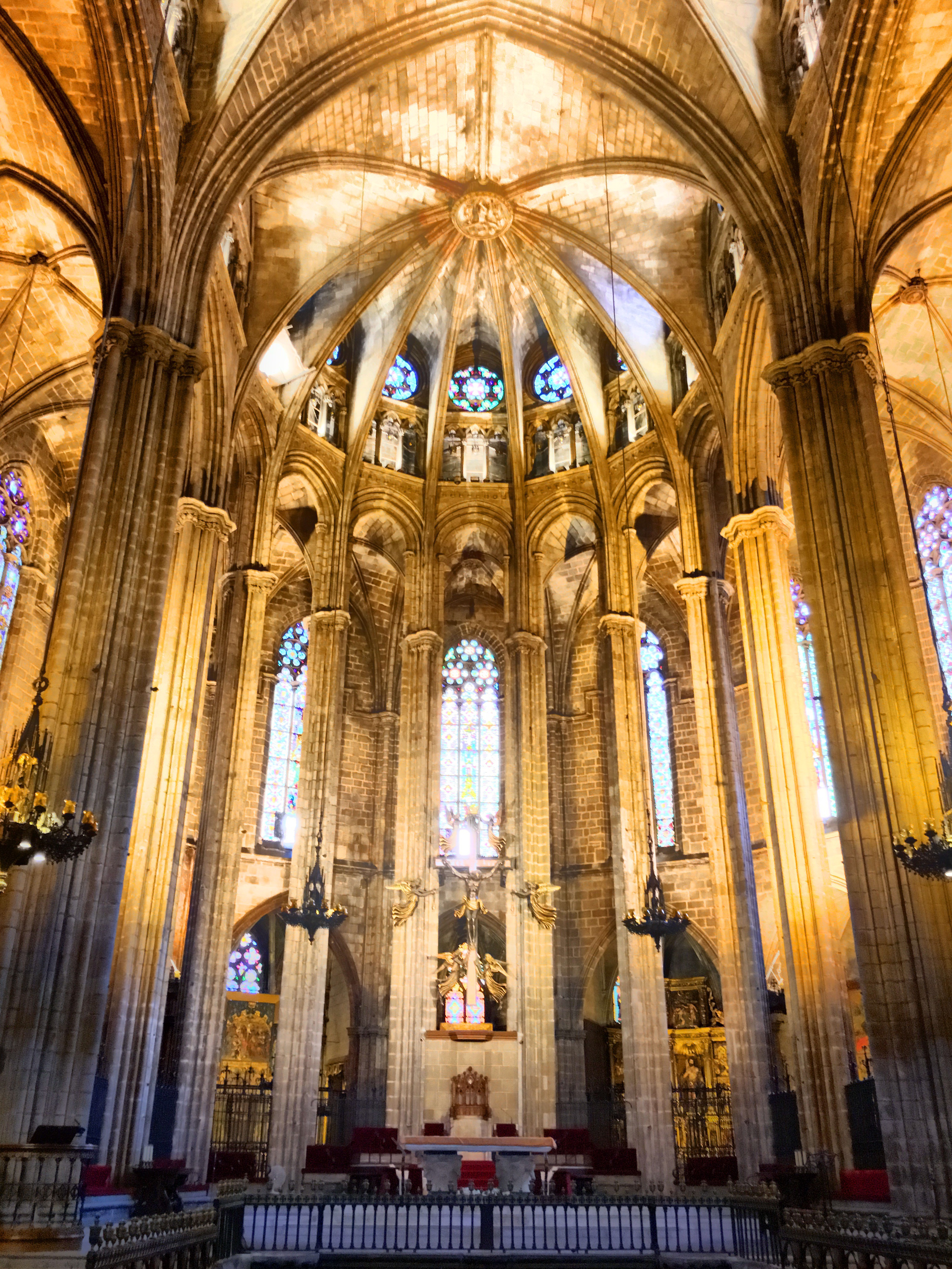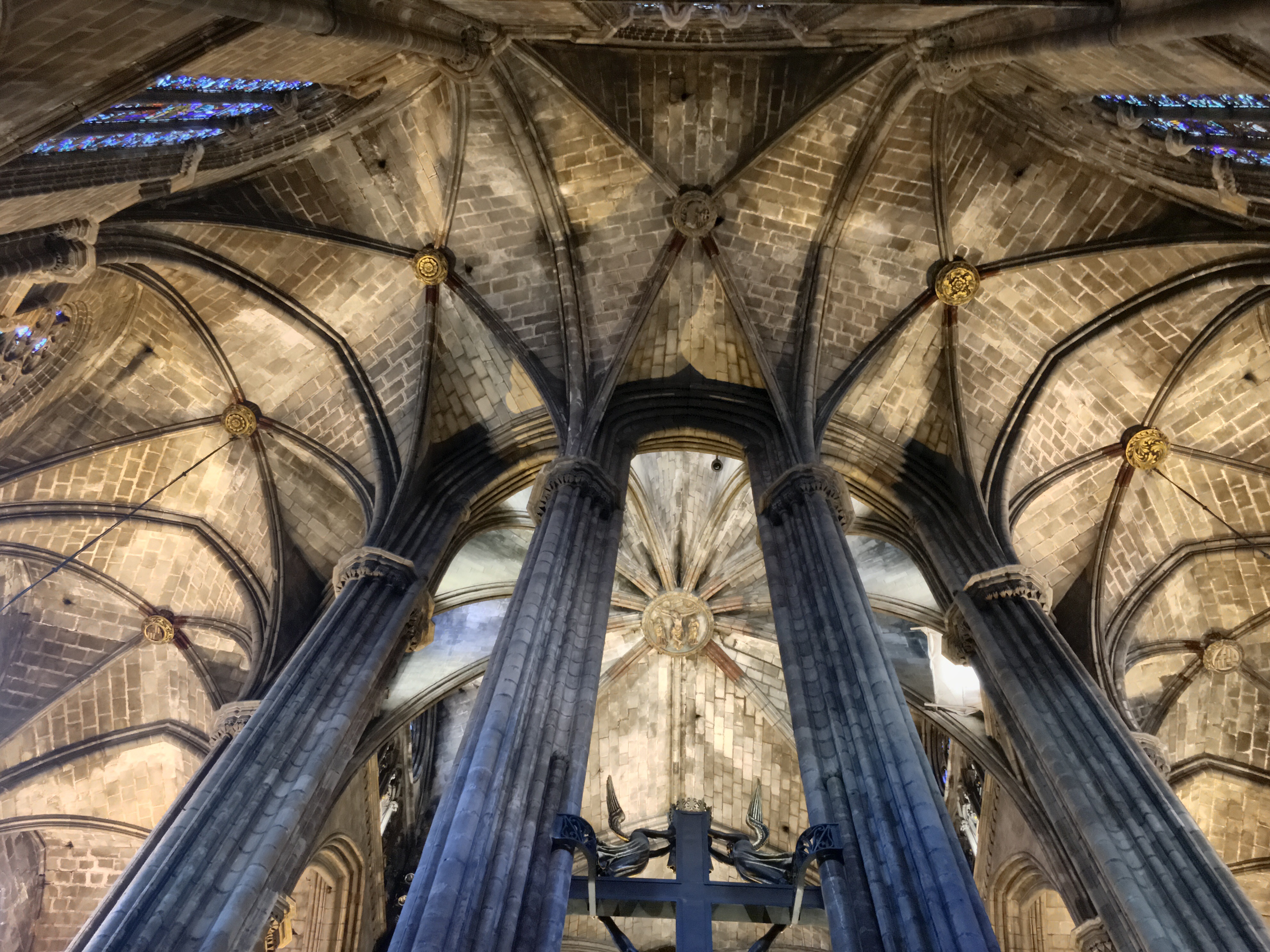 One of the first squares we can upon housed the beautiful Cathedral of Barcelona. Unlike the soaring, vertical cathedrals of France that we’ve visited, this cathedral is a bit more squat and like an ornamented block. No flying buttresses or dramatic structural side supports. However, very gothic ornamentation on the facade and towers richly decorated. The core cathedral was built around 1300 and construction continued on for centuries.