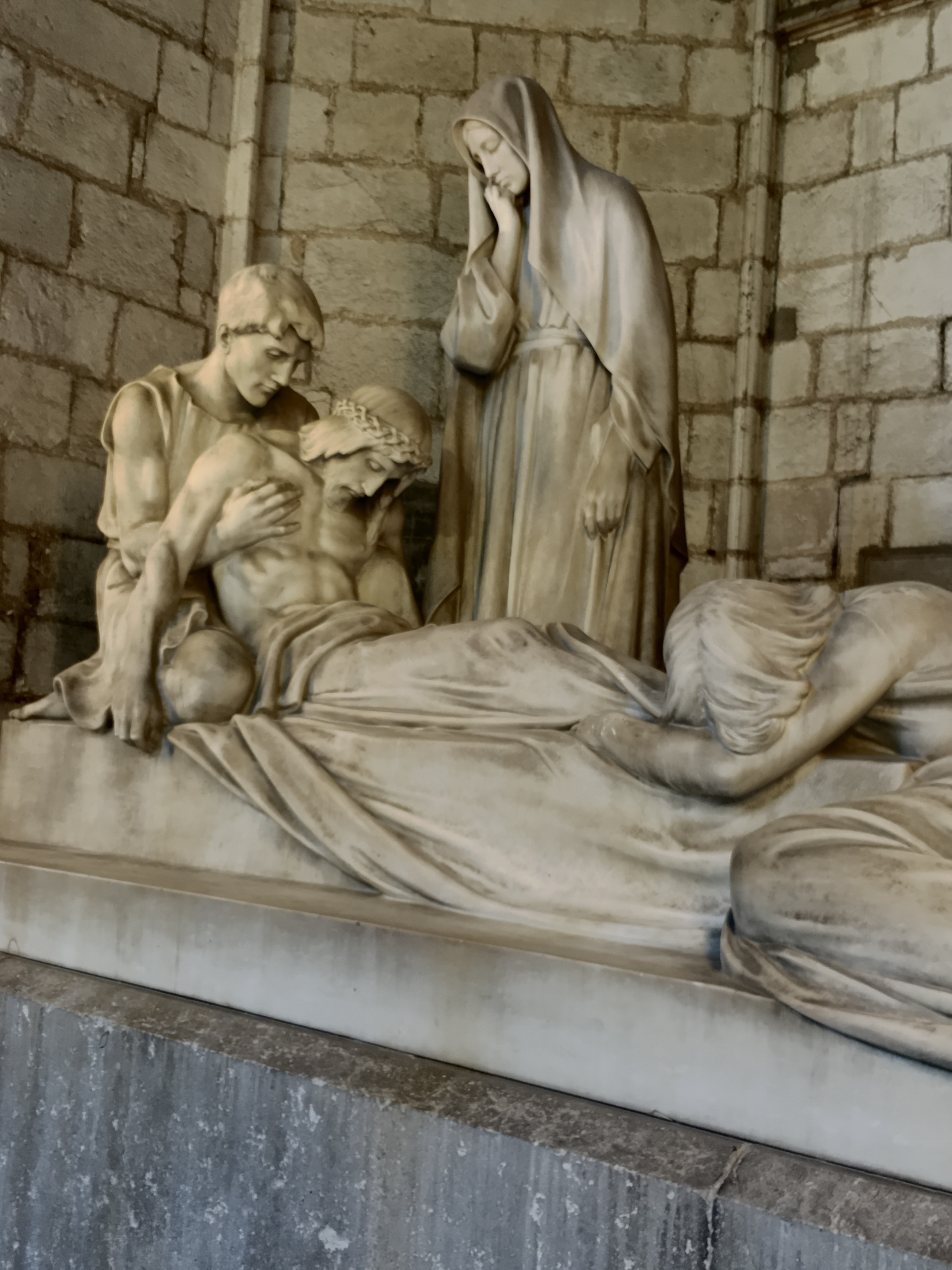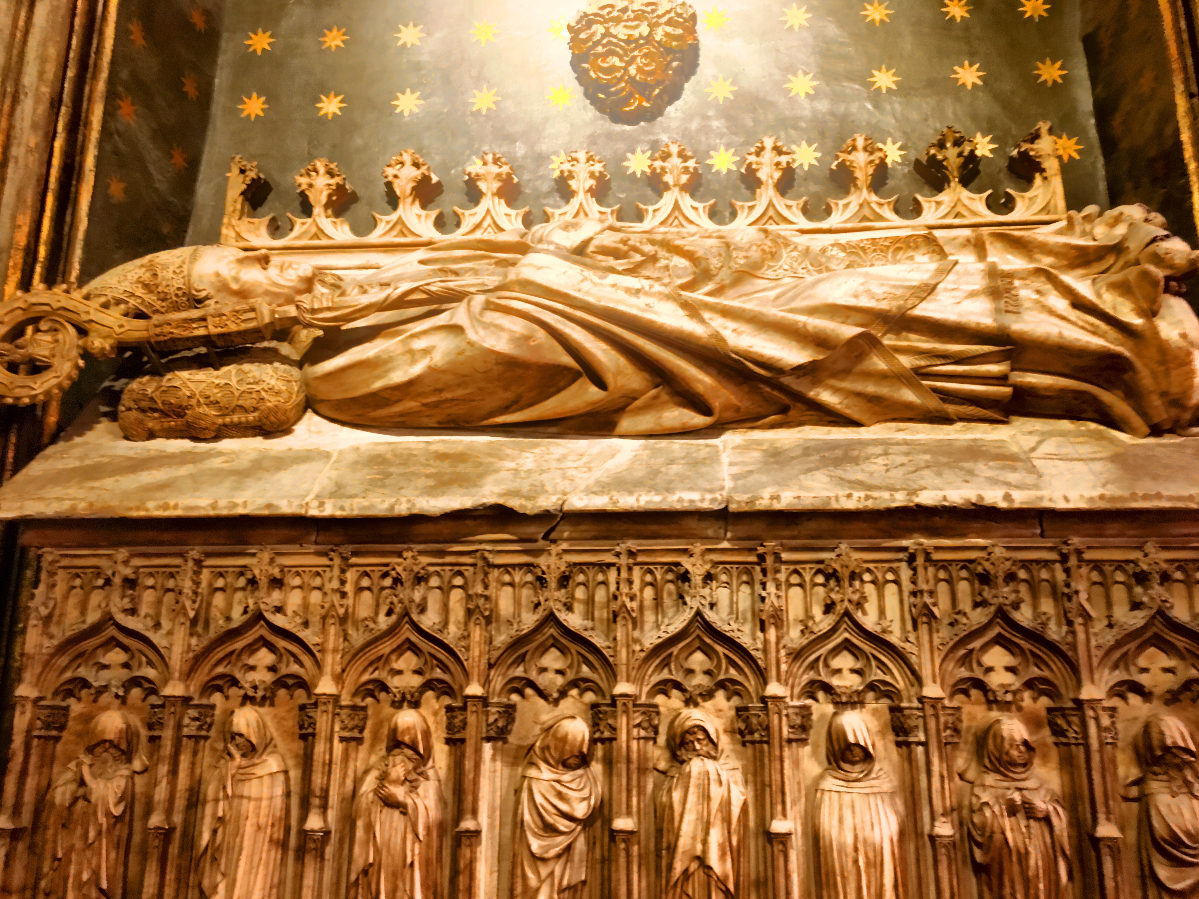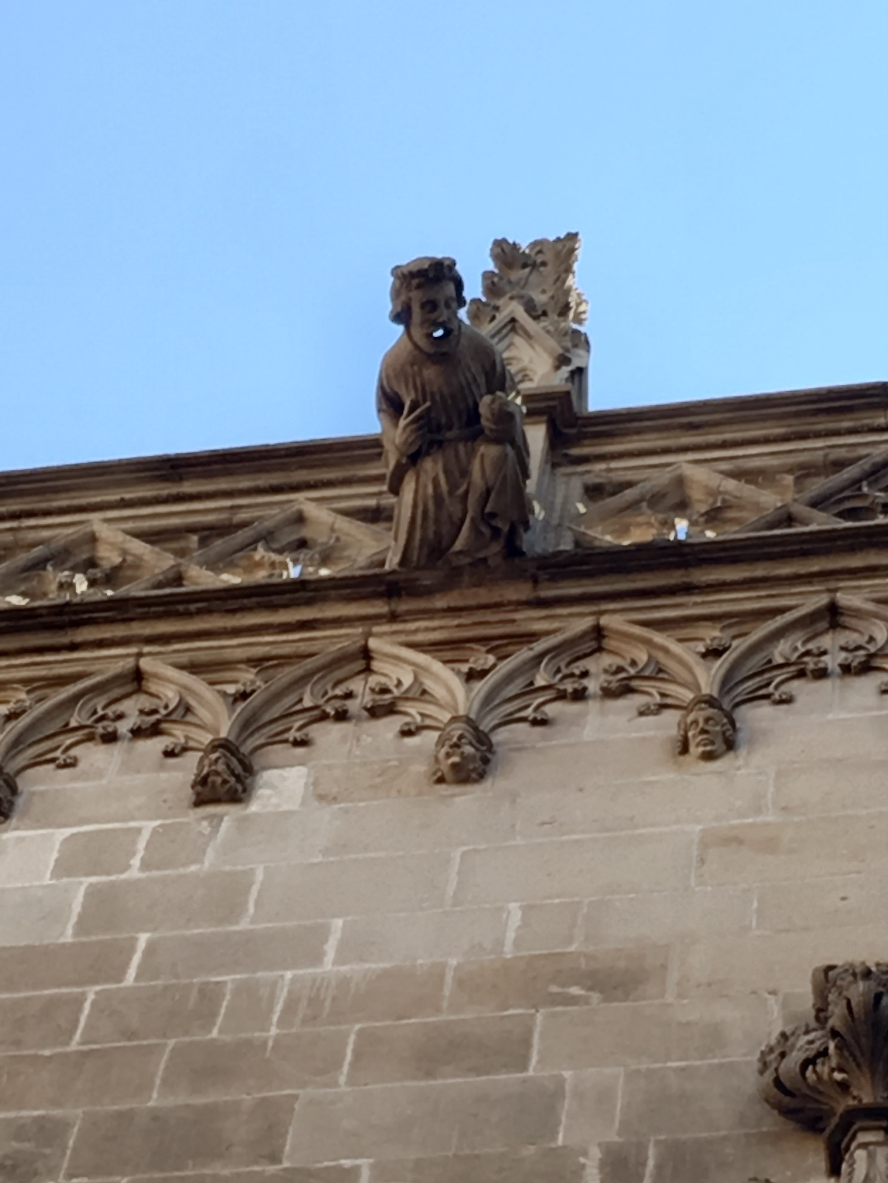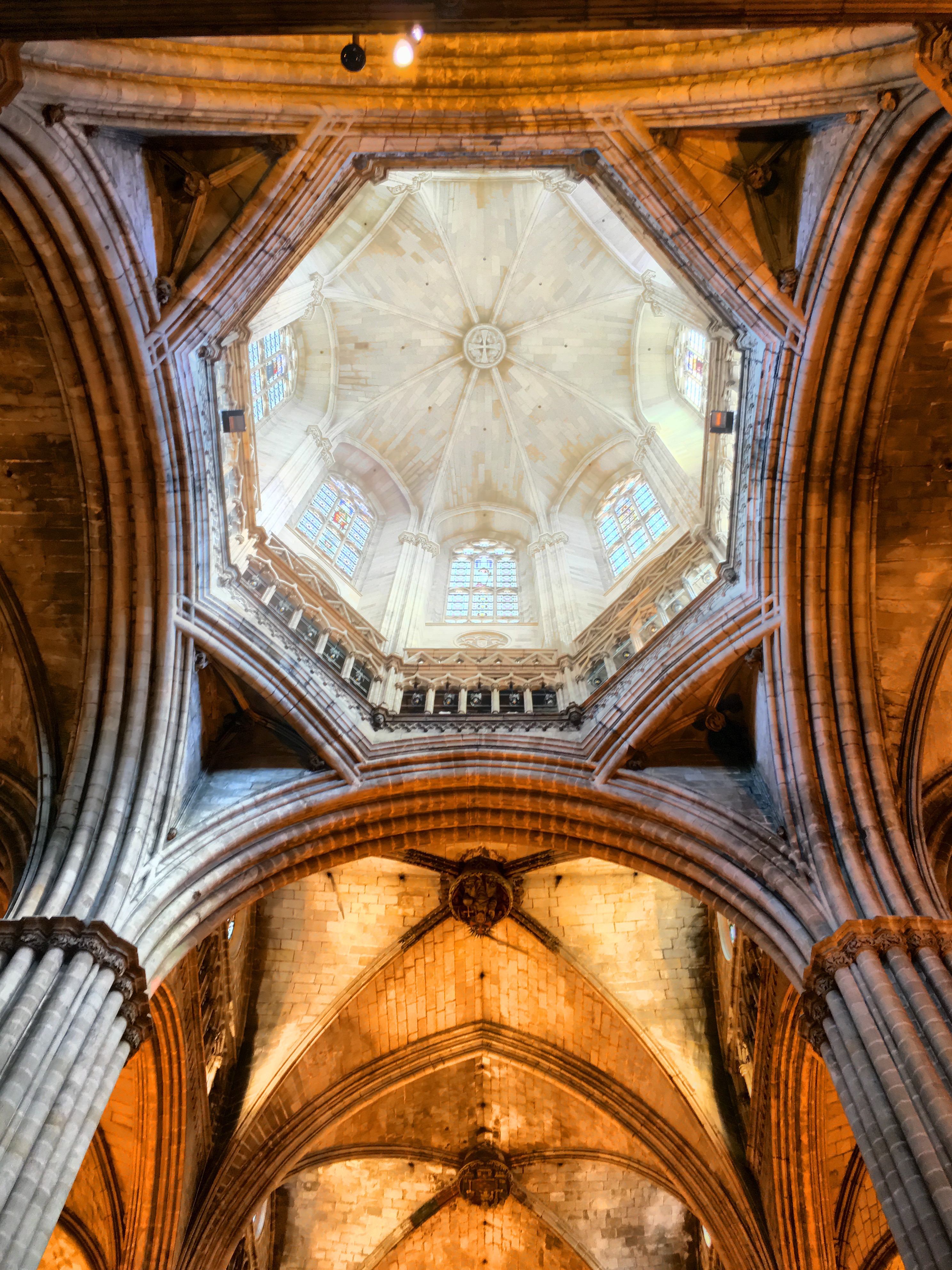 One of the first squares we can upon housed the beautiful Cathedral of Barcelona. Unlike the soaring, vertical cathedrals of France that we’ve visited, this cathedral is a bit more squat and like an ornamented block. No flying buttresses or dramatic structural side supports. However, very gothic ornamentation on the facade and towers richly decorated. The core cathedral was built around 1300 and construction continued on for centuries.