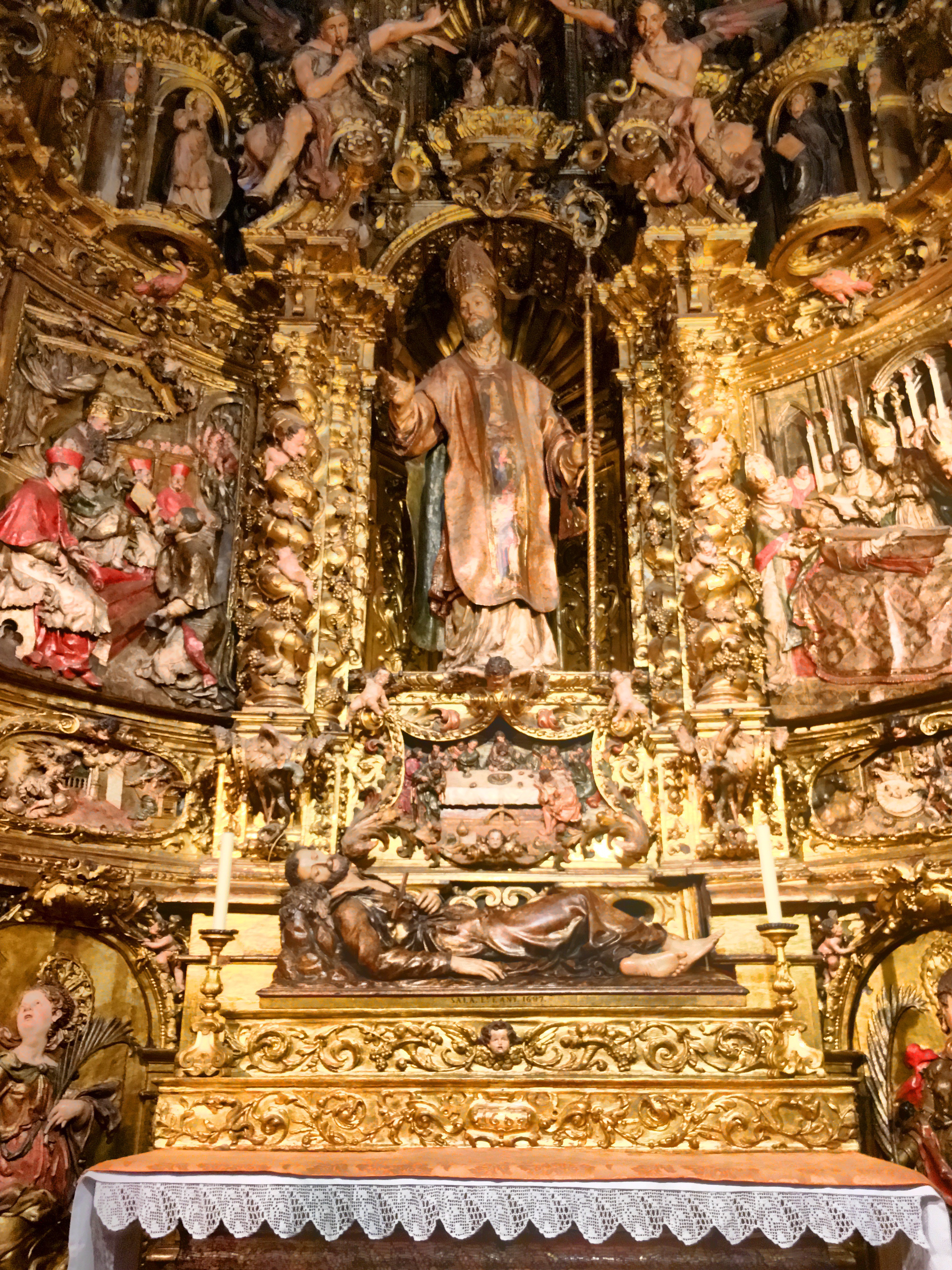 The official name of the church is the Cathedral of the Holy Cross and Saint Eulalia and is dedicated to St. Eulalia, one of the patron saints of Barcelona. According to her legendary story of martyrdom, she was a young Christian virgin living in Barcelona during Roman times and was punished for her religion. The Romans stripped her clothes off and made her walk nude down the streets. Out of nowhere, a snowstorm descended on the city and she was made modest by the snowflakes. The Romans were angry that their punishment was ruined so they stuffed her in a barrel and then jammed their knives into the barrel while they rolled it down the streets.