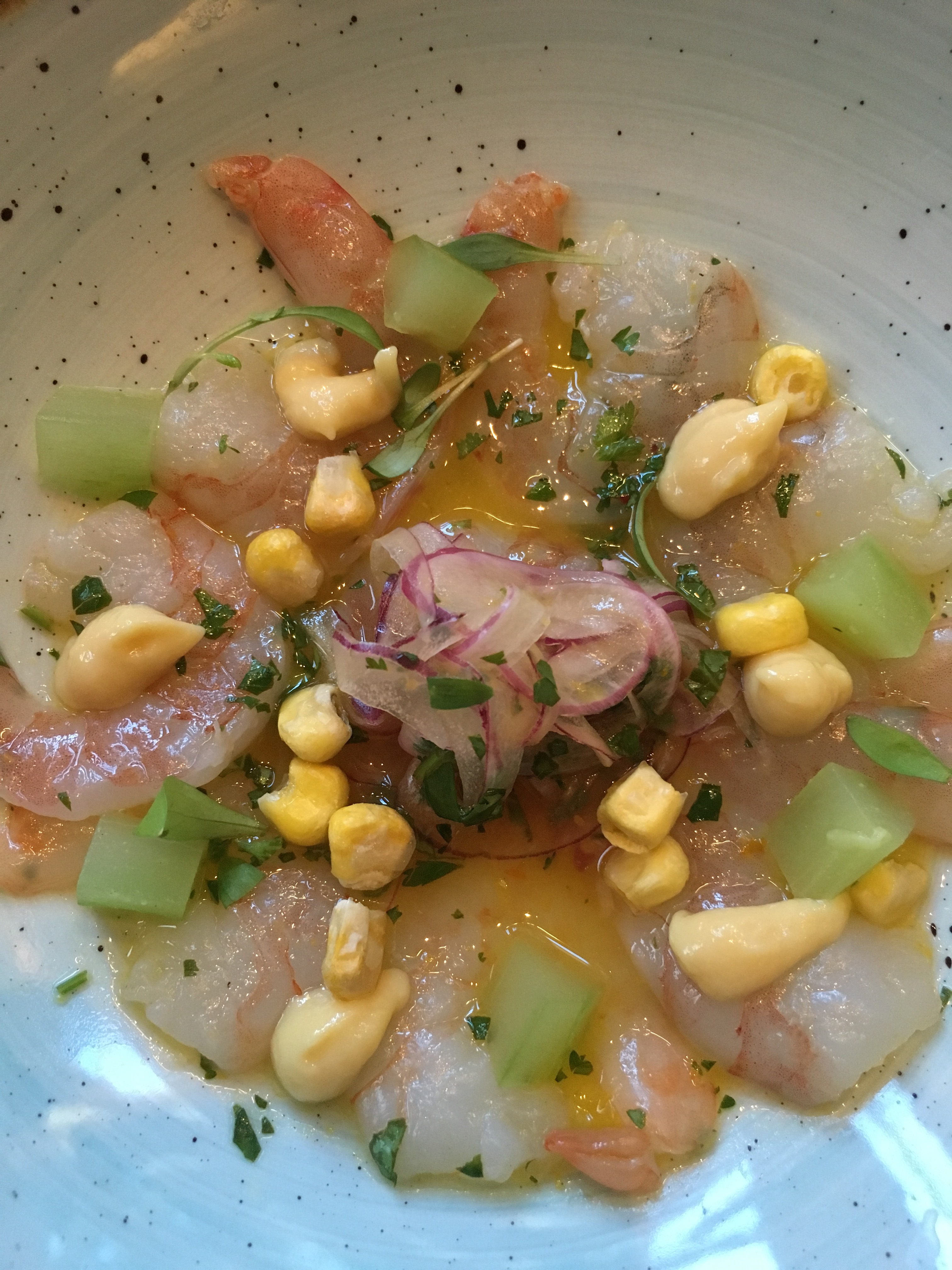 A shrimp ceviche with corn and melon: