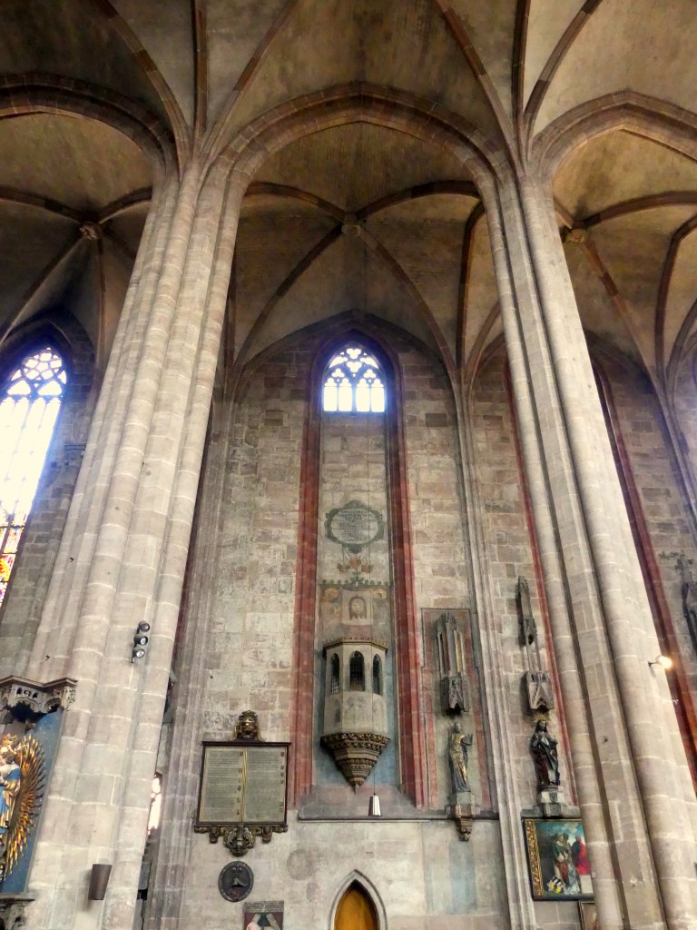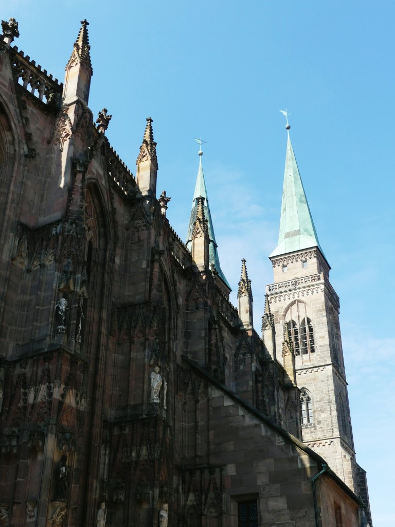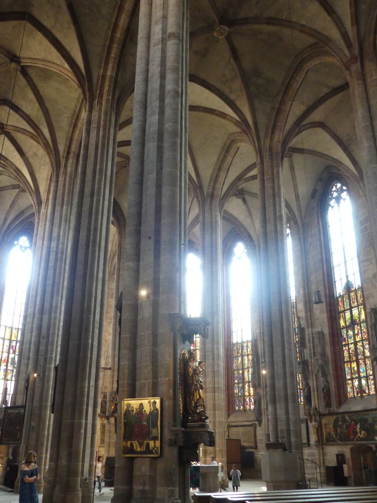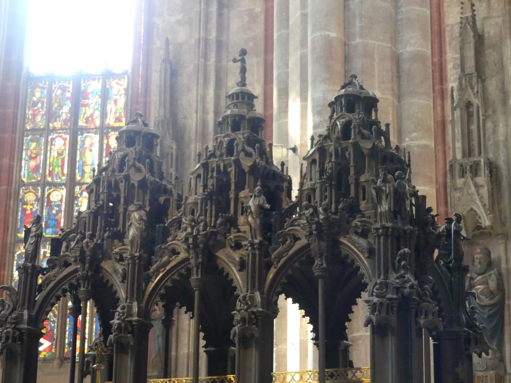A little further down the hill, we approached St. Sebaldus, one of the three largest churches in Nuremberg. The church was named for Saint Sebaldus, who was an 8th century hermit and missionary and also the patron saint of Nuremberg. The original Romanesque core of the church was finished in the late 1270’s and then additions took place in the 14th century, as well in the 15th century when the two towers were built. As with everything else in Nuremberg, the church was heavily damaged in WW2, but the towers survived, as did much of the stained glass and the 16th century shrine to St. Sebaldus. To enter, there was a donation request of a couple of Euros at the entry, which we were fine paying–these old buildings cost a ton of money to maintain.