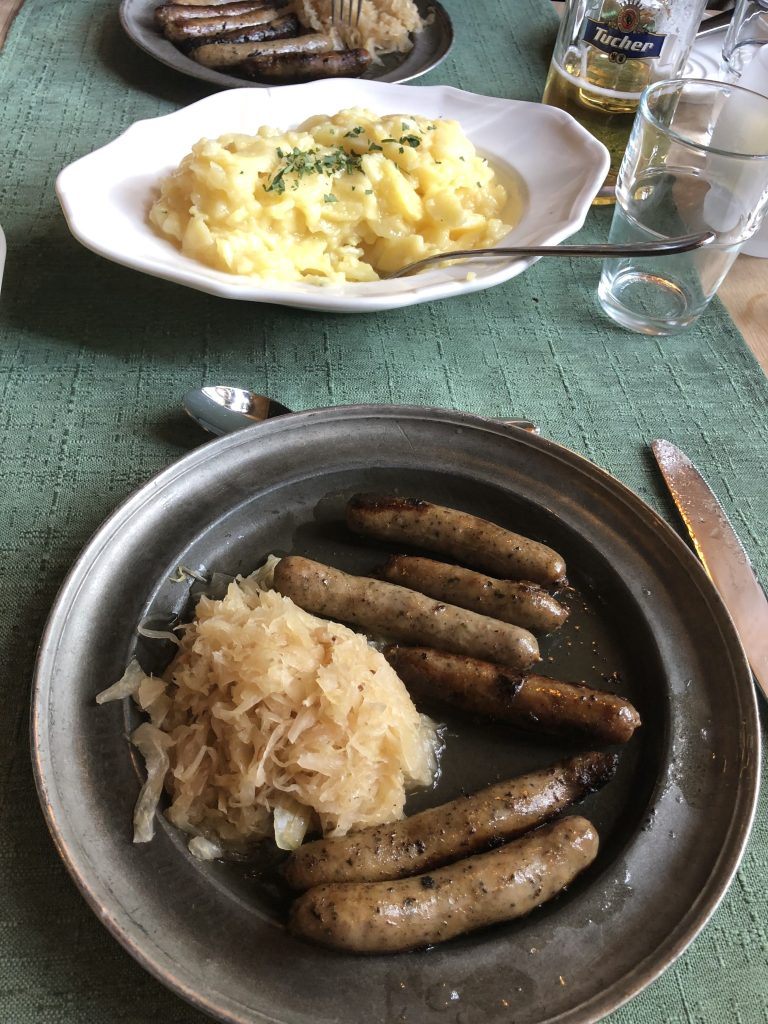 I’m not super crazy about these Viking provided lunches…I would prefer to find my own spot for lunch, but for the amount of money we paid for this trip, we took the included meal! We had previously had a Viking-provided lunch in Rothenberg, but it was a very small group of us (see blog post about Rothenberg). However, today’s lunch included all 110 passengers at the same time. As we entered, the wait staff “greeted” us decked out in their traditional German bar maid and lederhosen outfits. There was a little hesitation in their faces, but frankly speaking, if I worked there, I would be annoyed with 110 tourists all coming in at the same time. That being said, I’m sure they are used large tourist groups since Viking comes here throughout the year as well as many of the other river ships. We were herded past the regular customers to a large room in the back. Shortly after sitting down, the waiters and waitresses came around with trays of beer and local wine shouting “bee-uh” and “vine” and sort of sloshed the glasses in front of us. A plate of (cold) potato salad sat on every table. At this point in the trip, we were not new to bratwurst and sauerkraut…we’ve had it at several places. But apparently, Nuremberg has unique and special bratwurst.