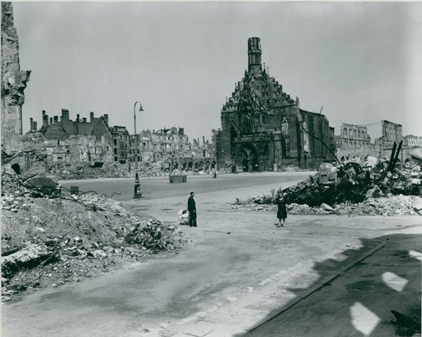 Nuremberg after Allied bombings. You can see the spires of St. Lorenz church in the distance.