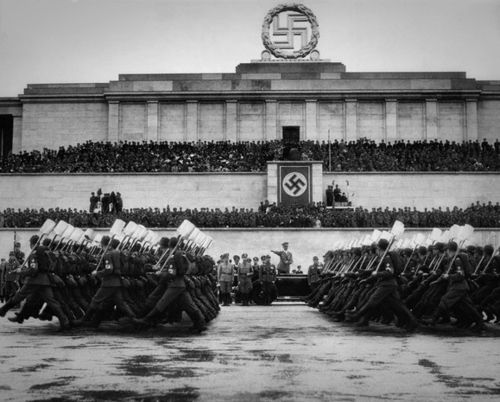 A Nazi rally held on the Zeppelin Field with Hitler in the bottom middle of the picture.