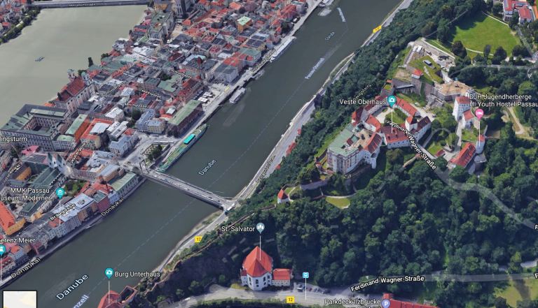 In the Google map image above you can see the Veste Oberhaus in the center right. The old fortress sits atop the mountain, looking across the Danube to the town of Passau below. To be honest, I’m not sure which vantage point is more impressive–from above or below. Hundreds of years ago, from down below, the citizens of Passau must have looked up at the fortress with a sense of fear, and at times, disdain as big brother watched over them. On the flip side, from up above, the prince-bishop would have looked down on the people of Passau (literally) with a sense of power and authority. On two occasions, in 1298 and 1367 angry citizen mobs, ready to overthrow the bishop, made failed attacks against the fortress.