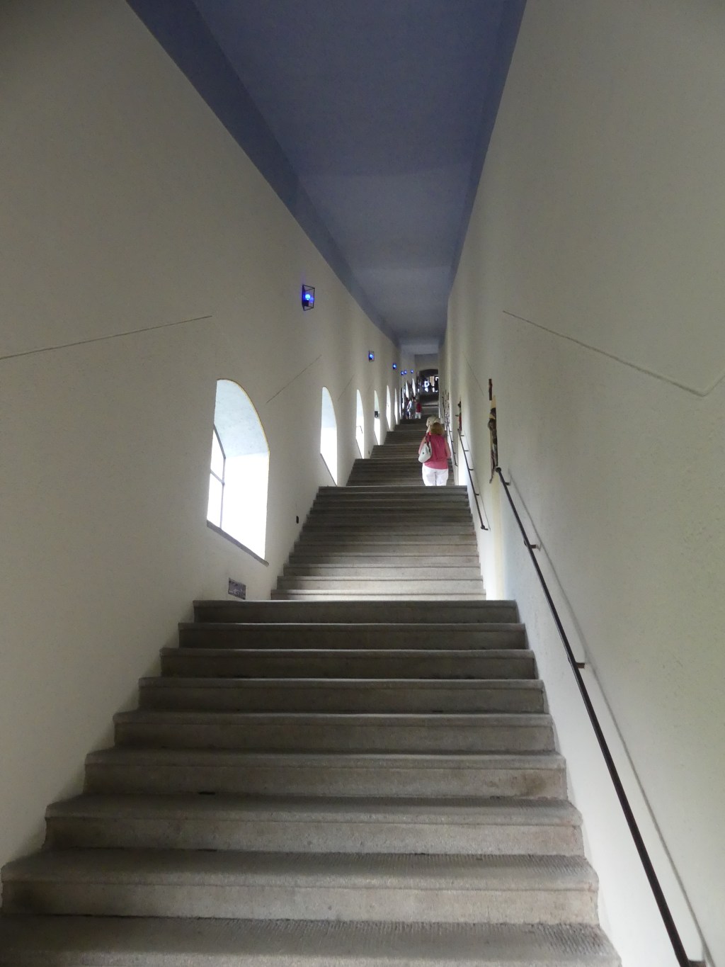 Talk about subtle…the entry doors are basically unmarked and then when open the door, you are greeted with a long empty hallway leading to who knows where! After our fun house experience in the Glass Museum yesterday…I have to say that the tourist spots of Passau are lacking in directional signage. But, as we hoped, the hallway led to the bottom of the 321 steps!