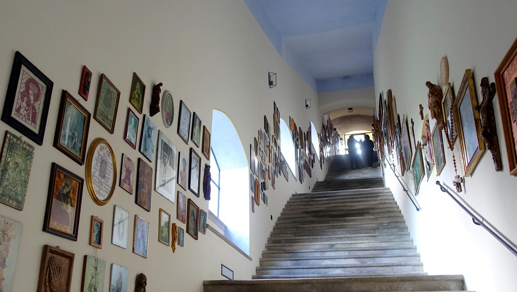 I have tried to find some information about the construction of the stairs but haven’t really found much to share. I’m fairly certain the original stairs from the 1620’s were made of wood–but I don’t know when the present stairs were constructed. For the pilgrims, the climb was slow and deliberate and was achieved on their knees. They would stop at each stair and say a prayer before continuing the journey up. Even on the day we were there, several modern day pilgrims were making the climb on their knees. As you get closer to the top, the walls lining the stairs become increasingly decorated with pictures of Mary…they all vary in age, style, and choice of frame. Several have been adorned with prayer beads from one of the pilgrims.
