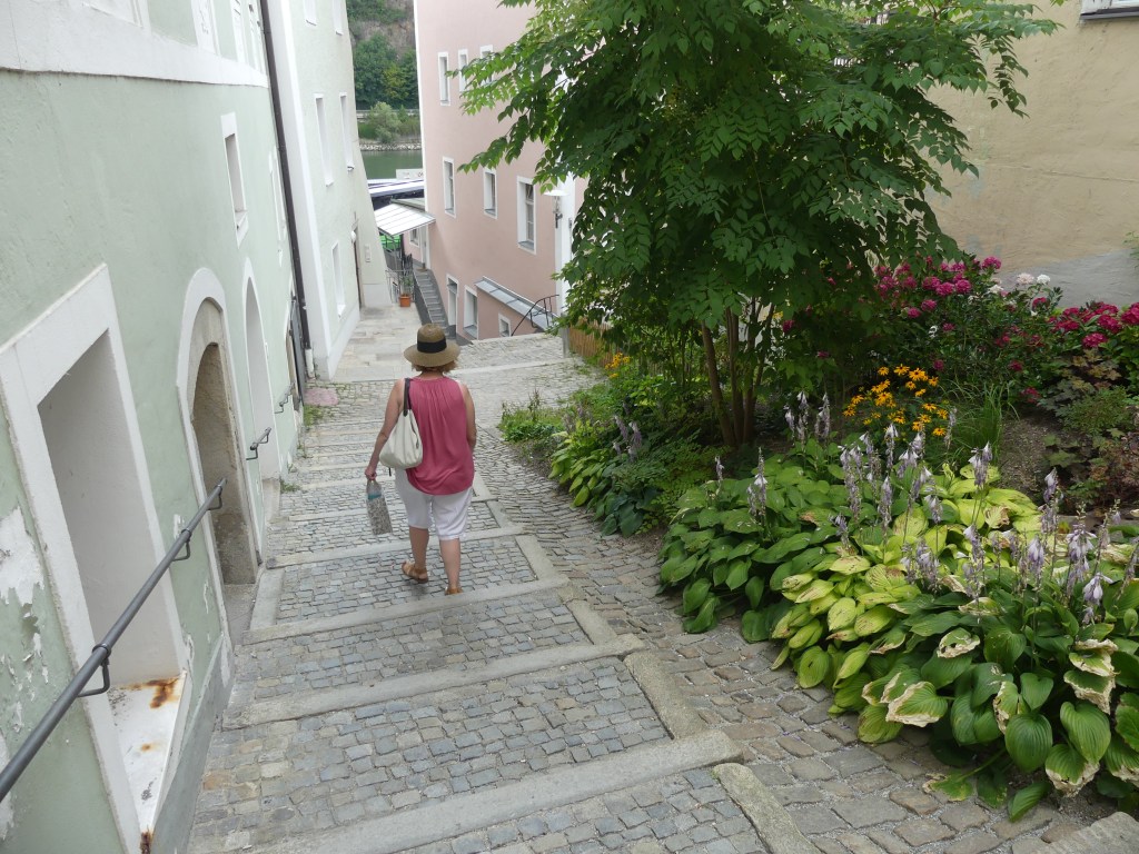Technically, after you cross the bridge you are in Innstadt which is, I suppose, a district of Passau. There wasn’t a lot of signage or physical directions leading you to the Mariahilf stairs…but you can see the stairs on the hill as well as the church towers at the top…so we geo-guesstimated how to get there. We also found ourselves walking behind a large group of tourists (in their 20’s, not American) that seemed to be headed to the same place. They were being really loud and acting goofy and climbing the 321 stairs is supposed to be this spiritual journey kind of experience. So, I said “let them get ahead of us! I don’t want to walk up with them. They are obnoxious!”. And that’s what we did.