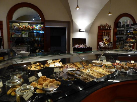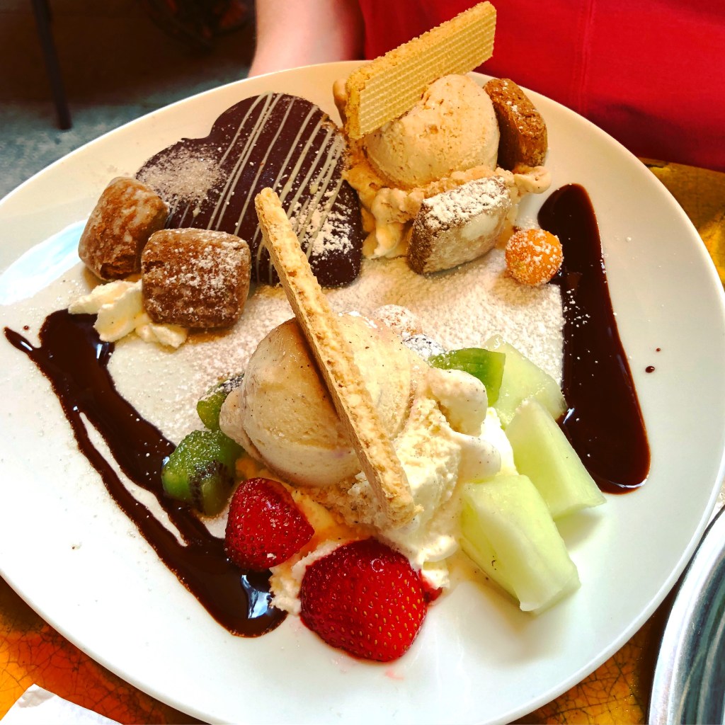 They have a variety of offerings…chocolates, gingerbread, their famous “domes” all of which you can buy in the store. But we chose to go out back to their little outside cafe with table service. We shared this variety plate that had chocolates, gelatos, gingerbreads, wafer cookies….a little taste of everything that they sell. There was fruit on the plate, so it wasn’t all sweets. The coffee was delicious, as well.